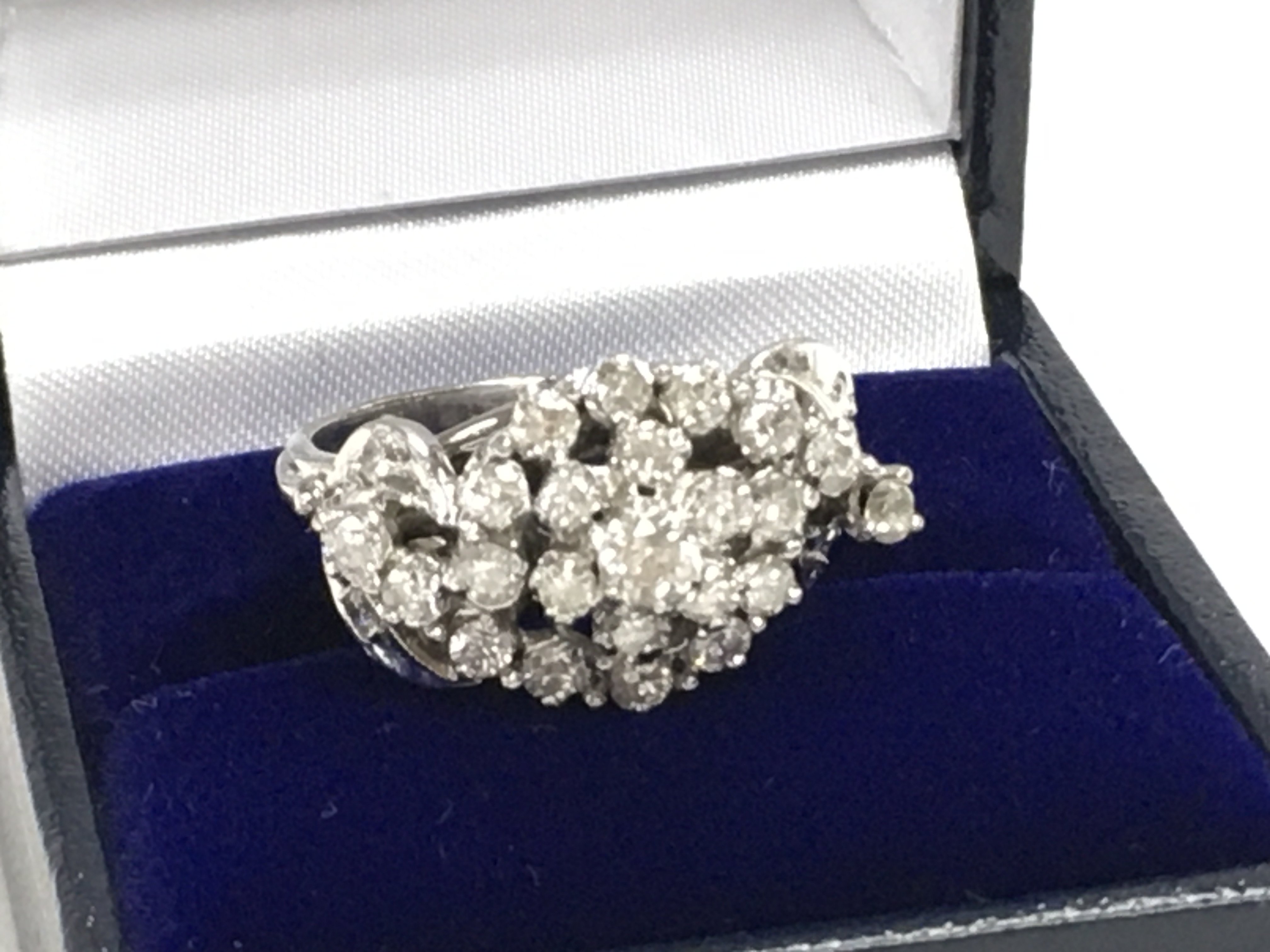 Fancy R/C diamond cluster ring set with R/C diamonds in white metal. Boxed. Diamonds 1.10ct Approx. Ring size Approx O. Postage category A.