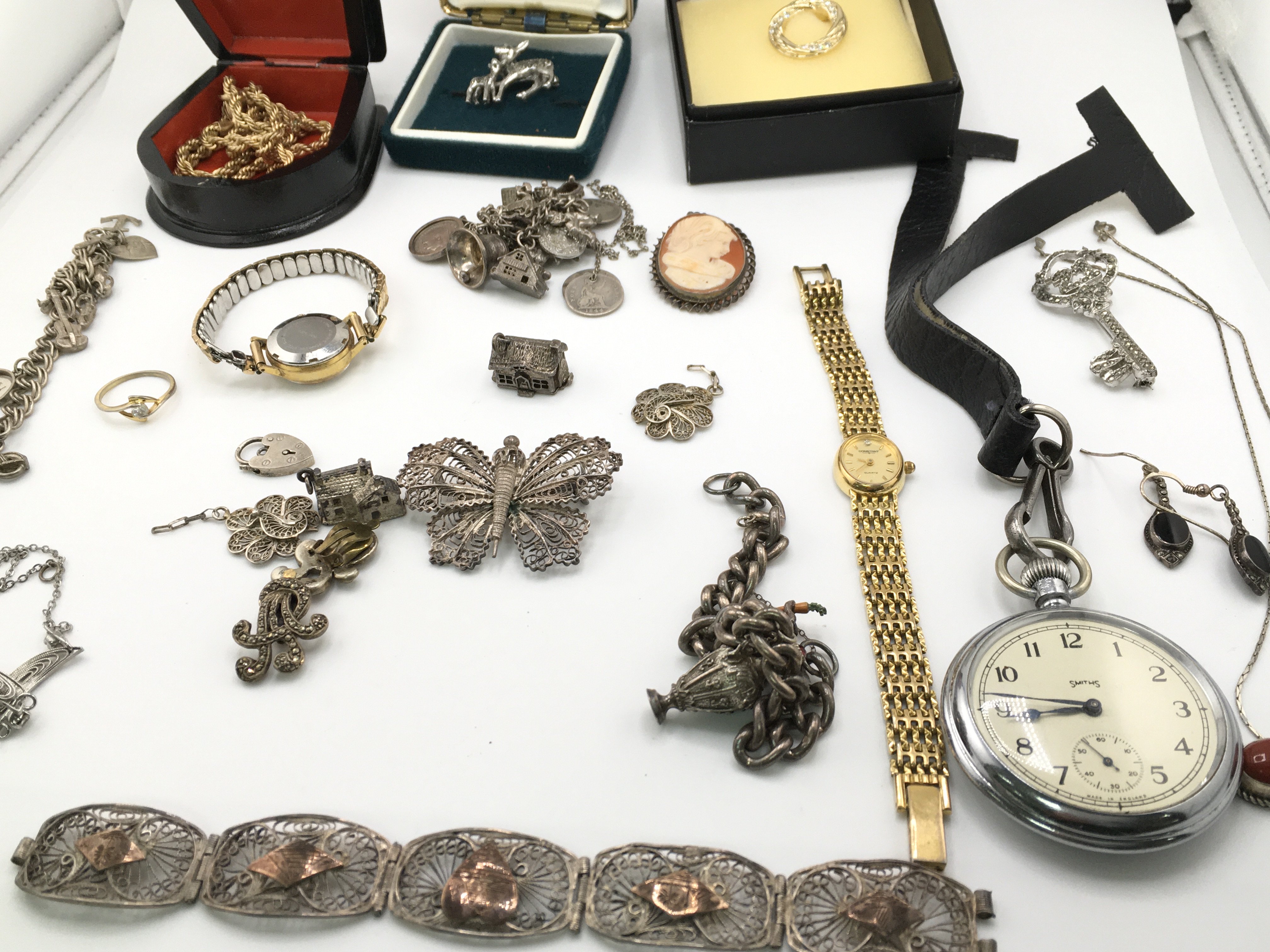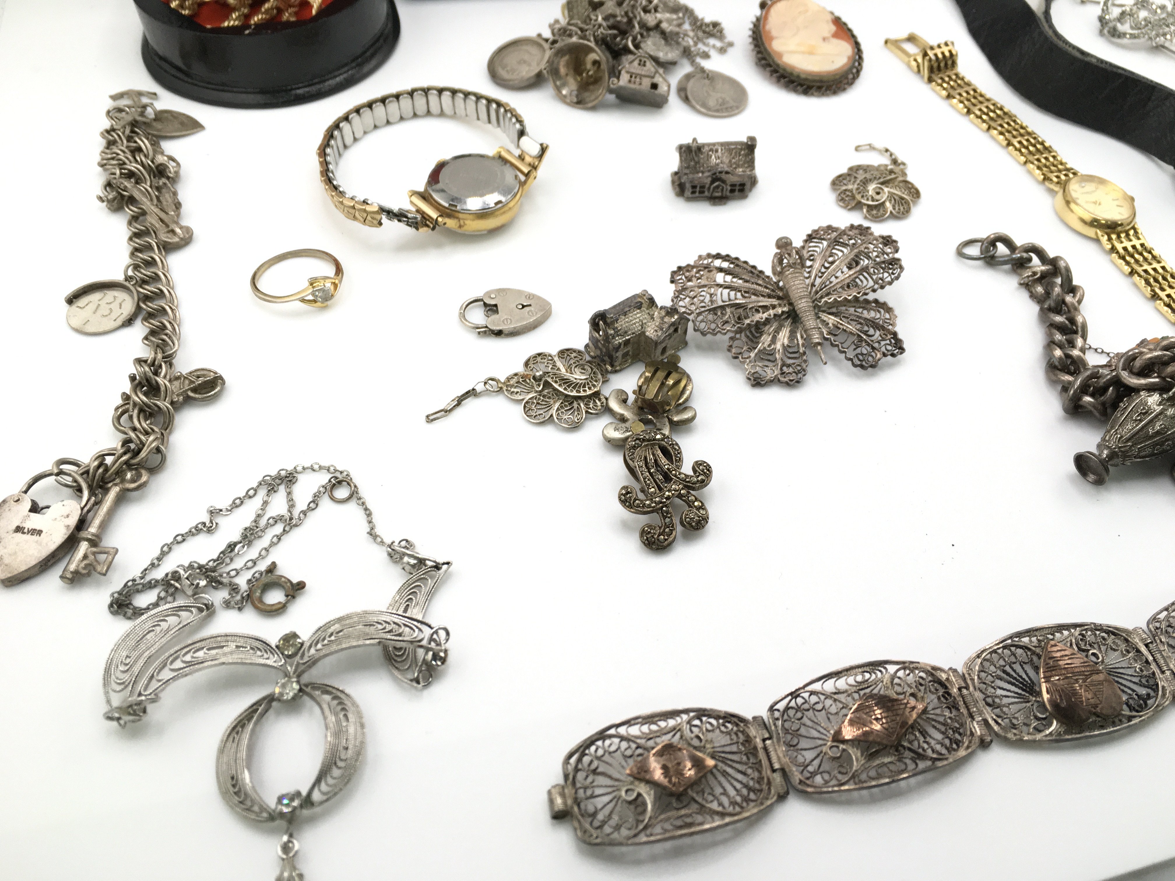 A collection of silver and costume jewellery including silver charm bracelets etc. Postage B