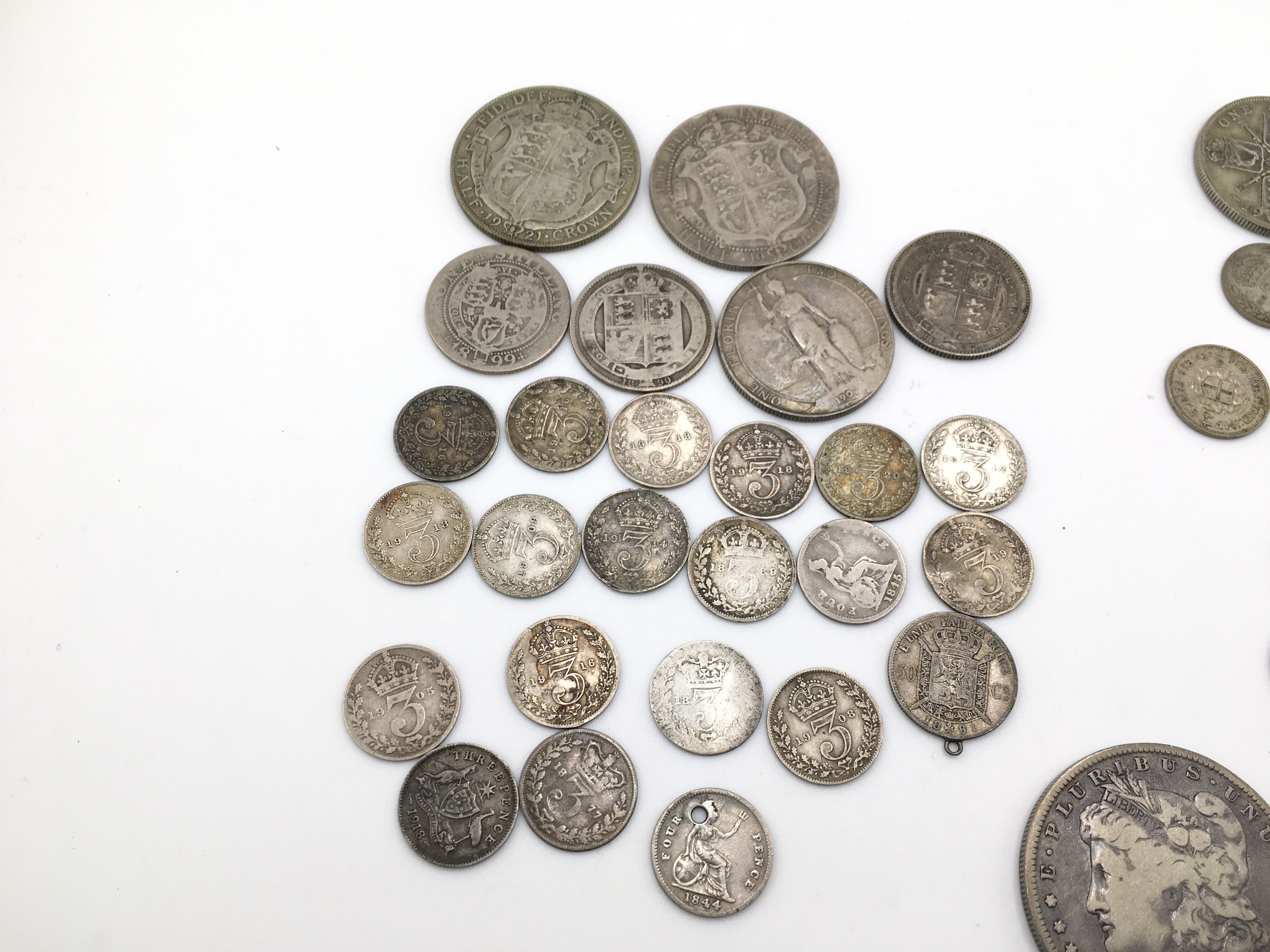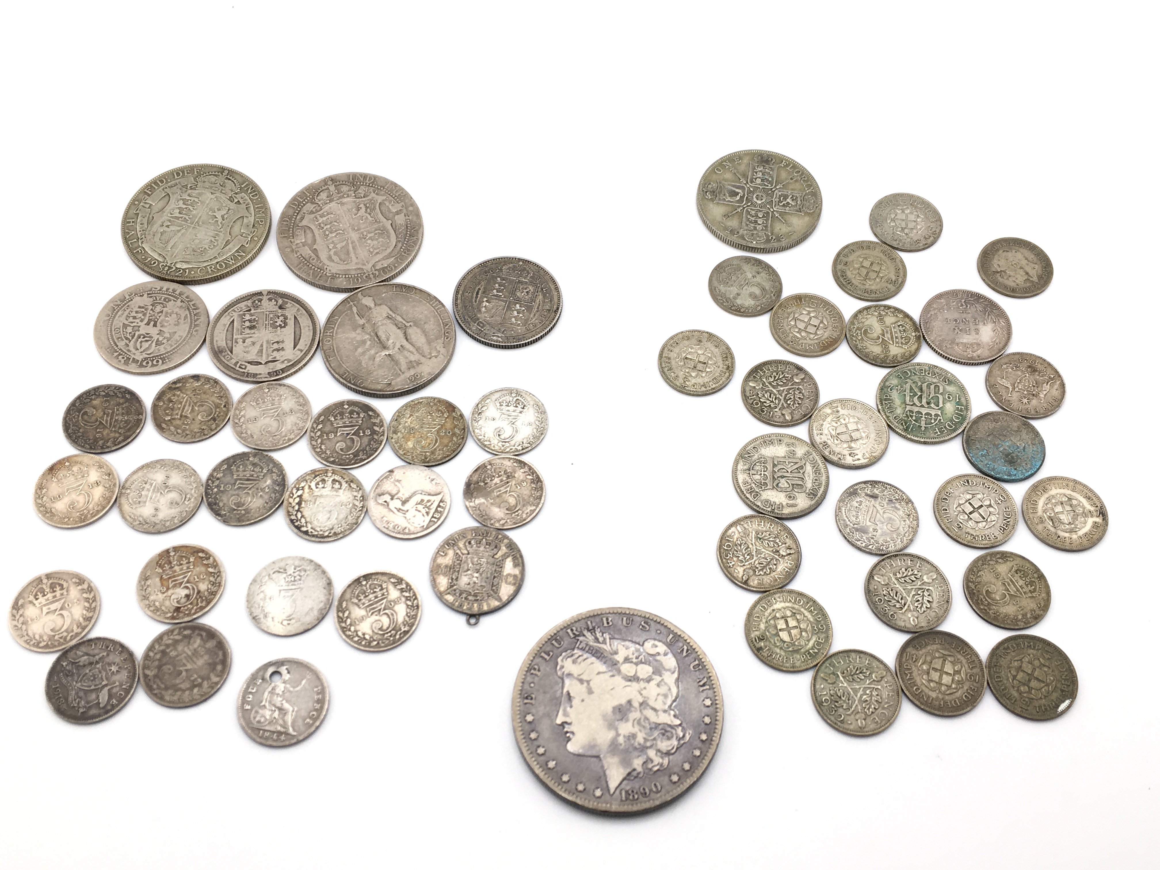 A collection of pre 1920 and pre 1946 coinage. Including a 1890 O morgan dollar. Approximately 160g total. Postage A