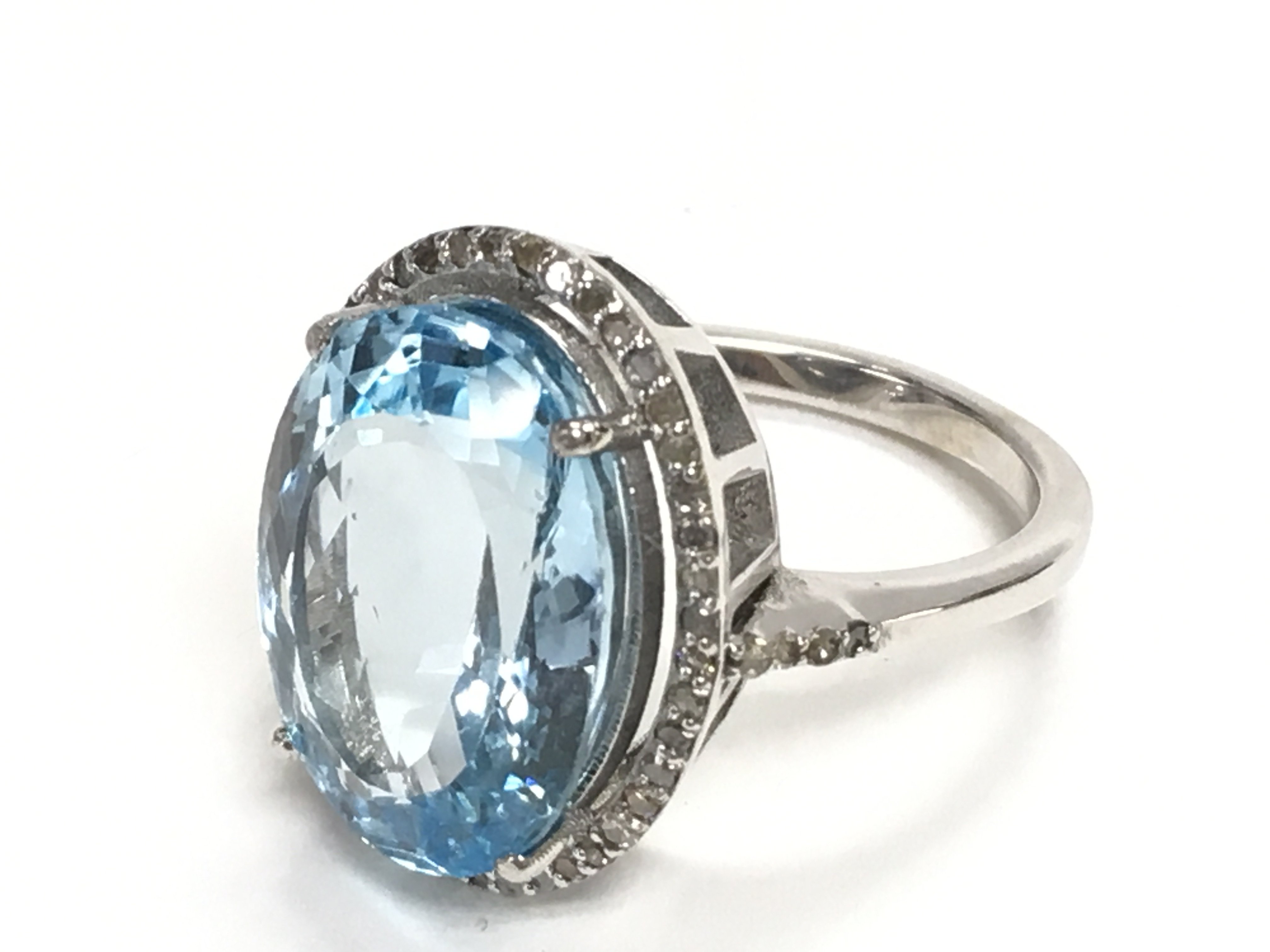 Oval dress ring in silver set with large oval blue topaz and a halo of R/C diamonds with a diamond set shoulders. Topaz 11.45ct. Diamonds 0.35ct. Postage category A. Ring size Approx K/L.