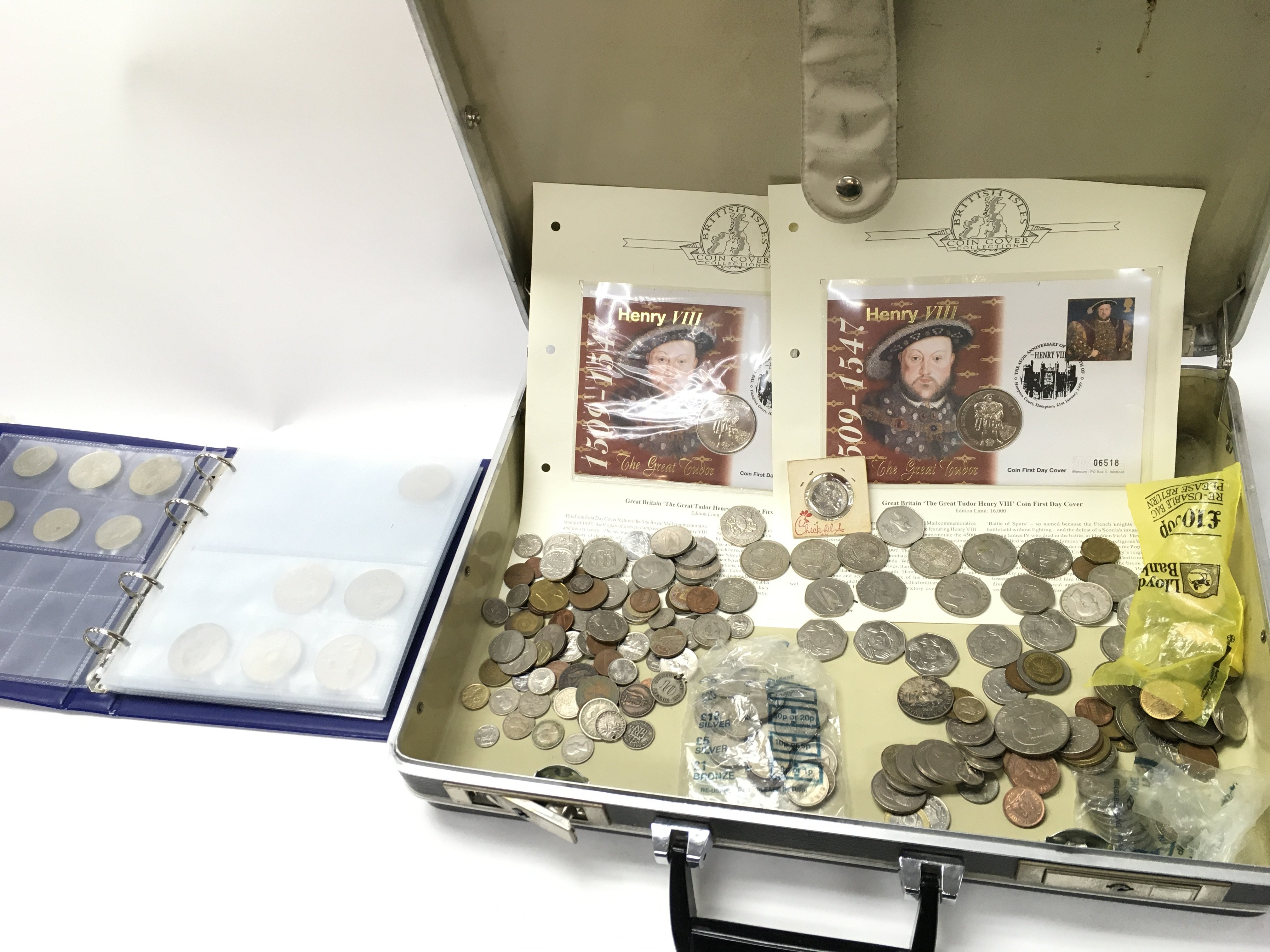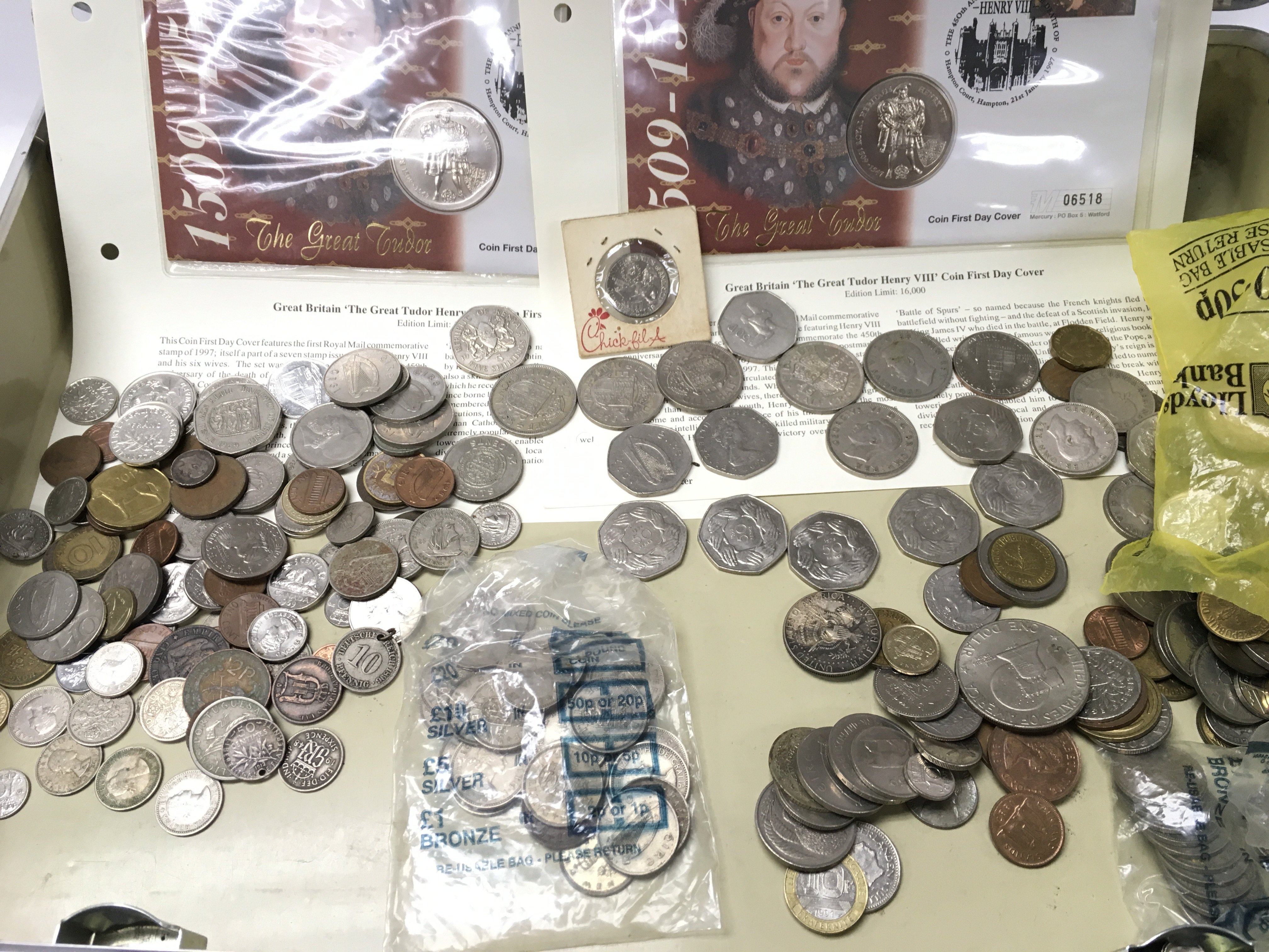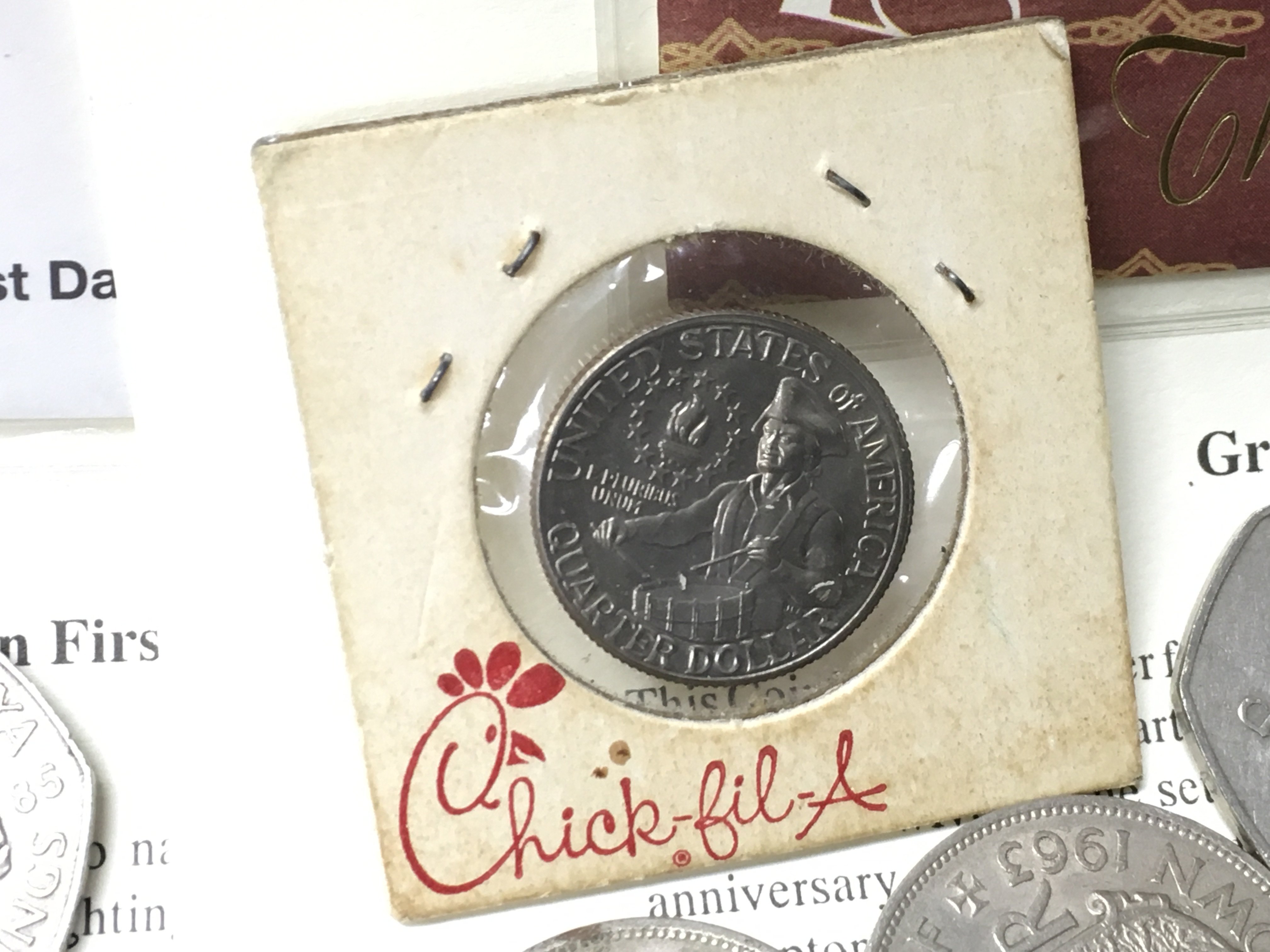 A collection of world coinage including US Canadian etc. Including two first day covers and a chick fil A bicentennial quarter.