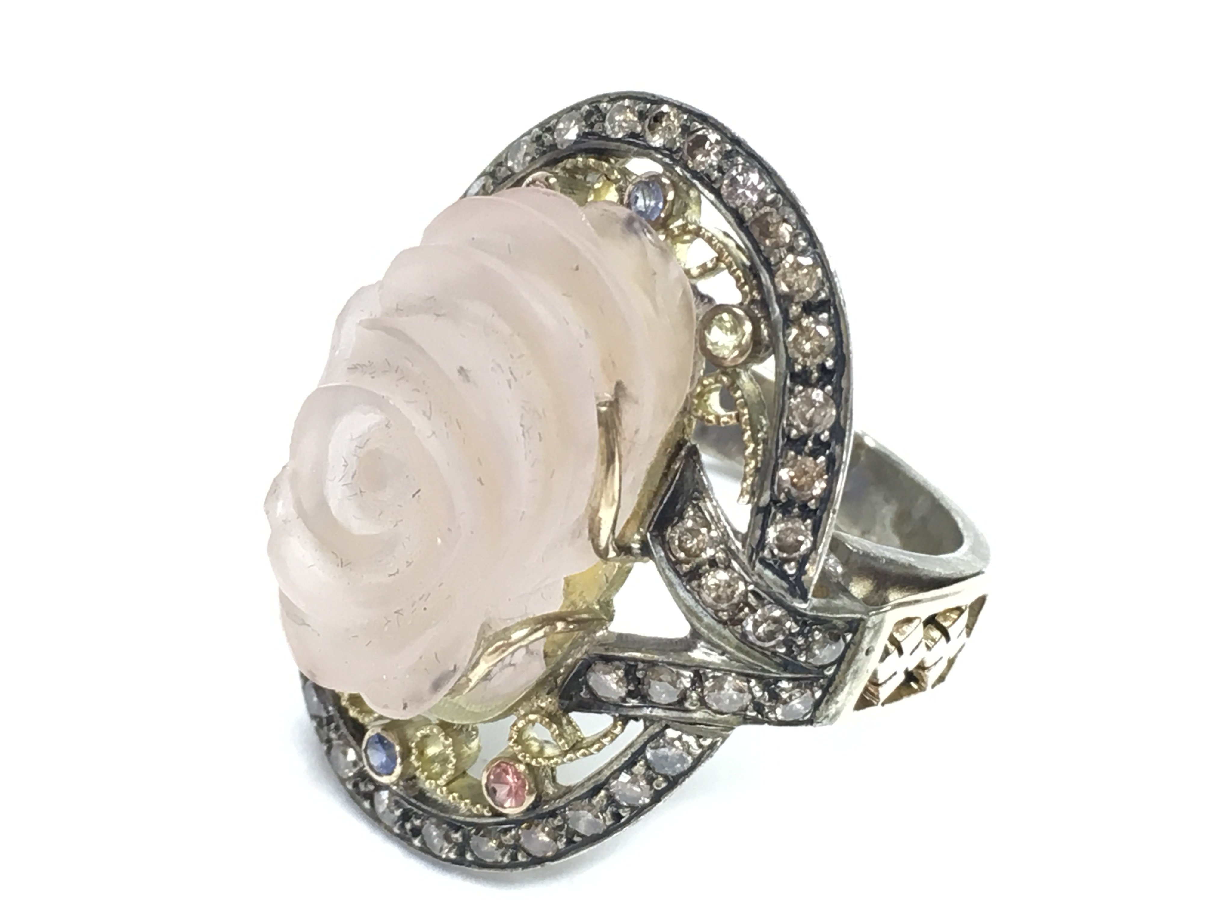 Large and impressive silver gilt ring set with a large carved rise quartz and coloured diamonds, boxed. Rose quartz 12.25ct. Diamonds 0.82ct. Ring size Approx U/V. Postage category A.