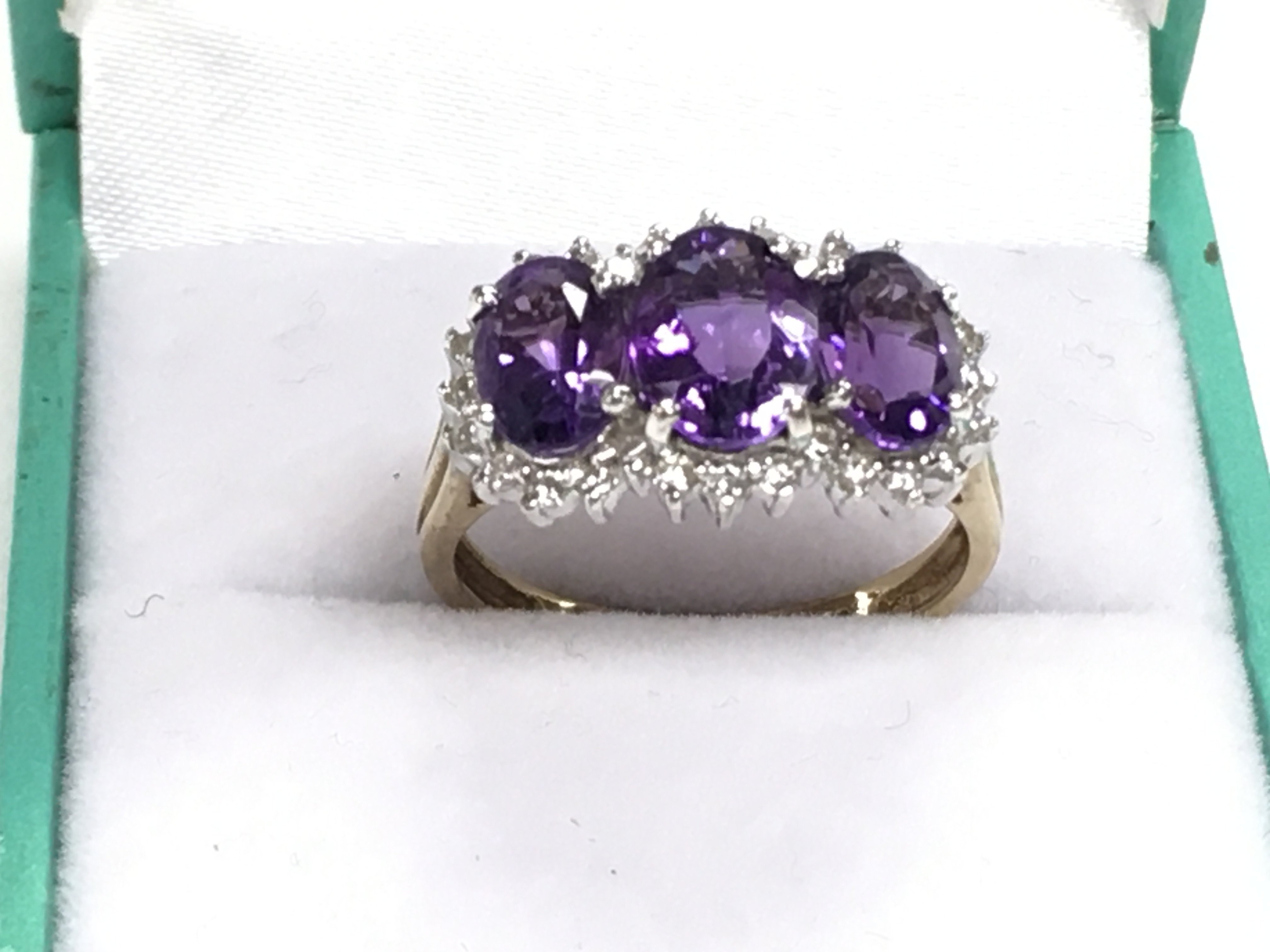 9ct yellow and white gold three stone graduated amethyst and diamond trilogy ring, boxed. Amethyst’s 1.50ct Approx. Diamonds 0.30ct Approx. Postage category A. Ring size Approx N.