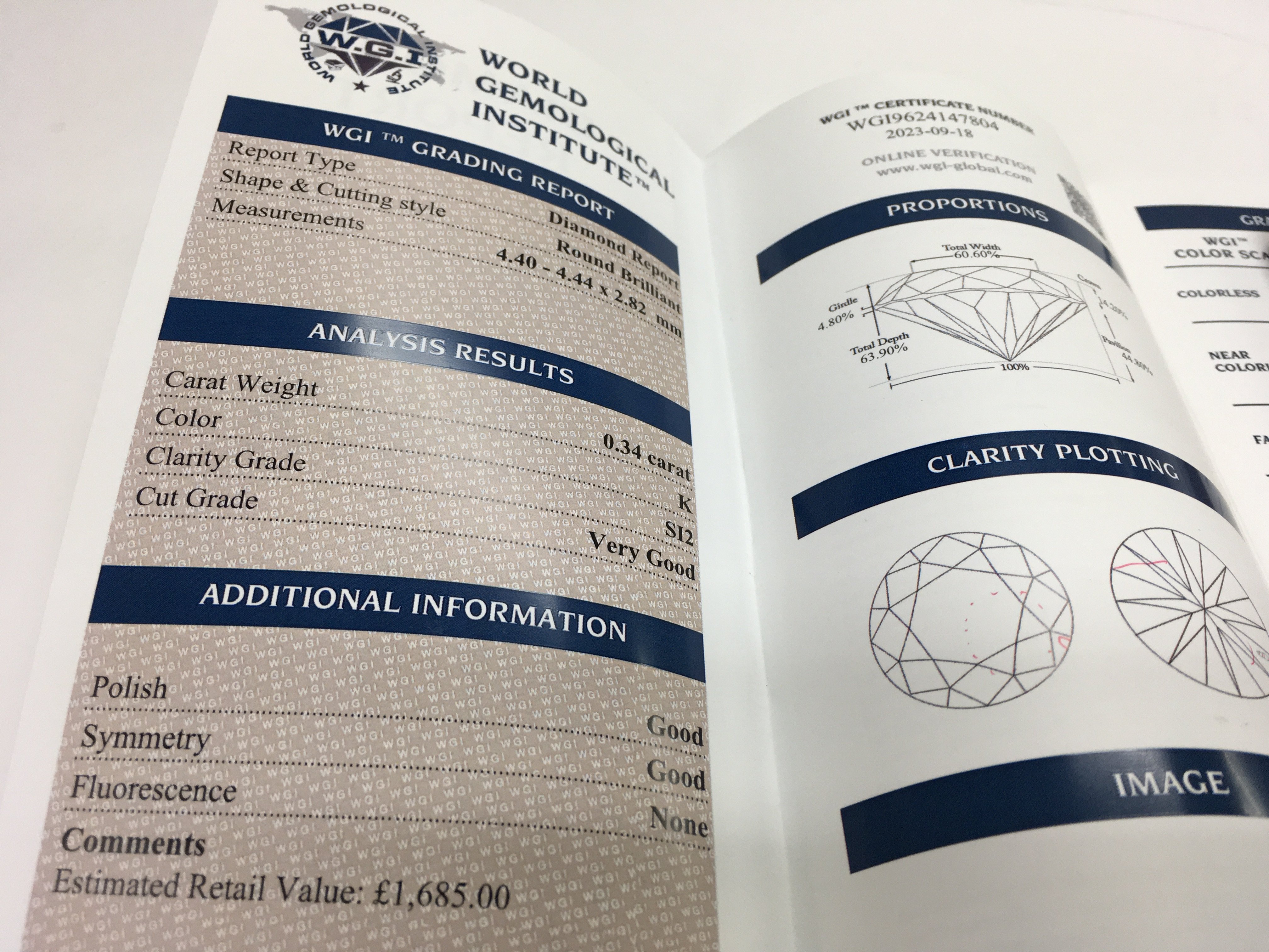 Certificated and security sealed single unmounted 0.34ct RBC diamond. Cert no. WGI9624147804. Postage category A.