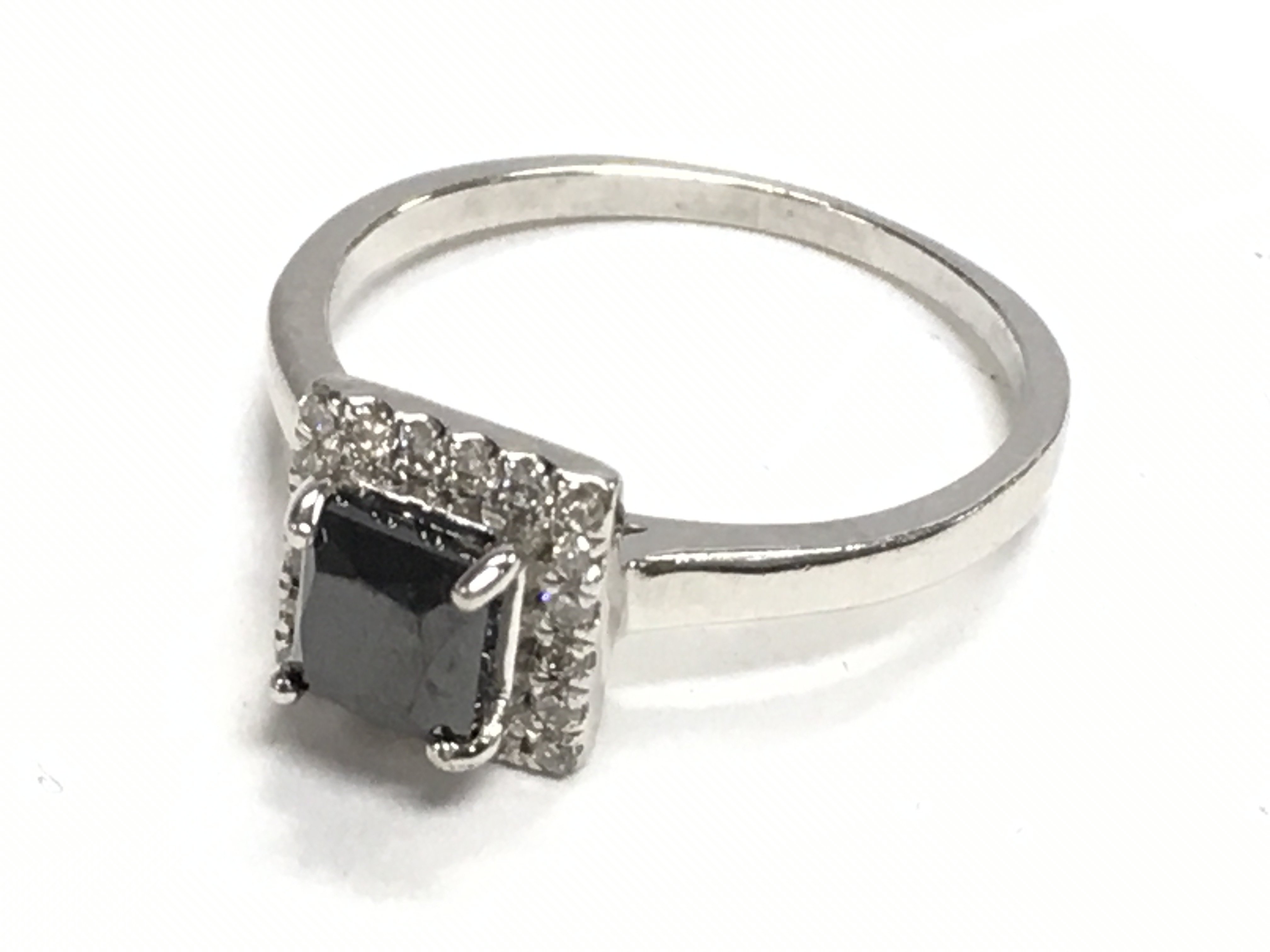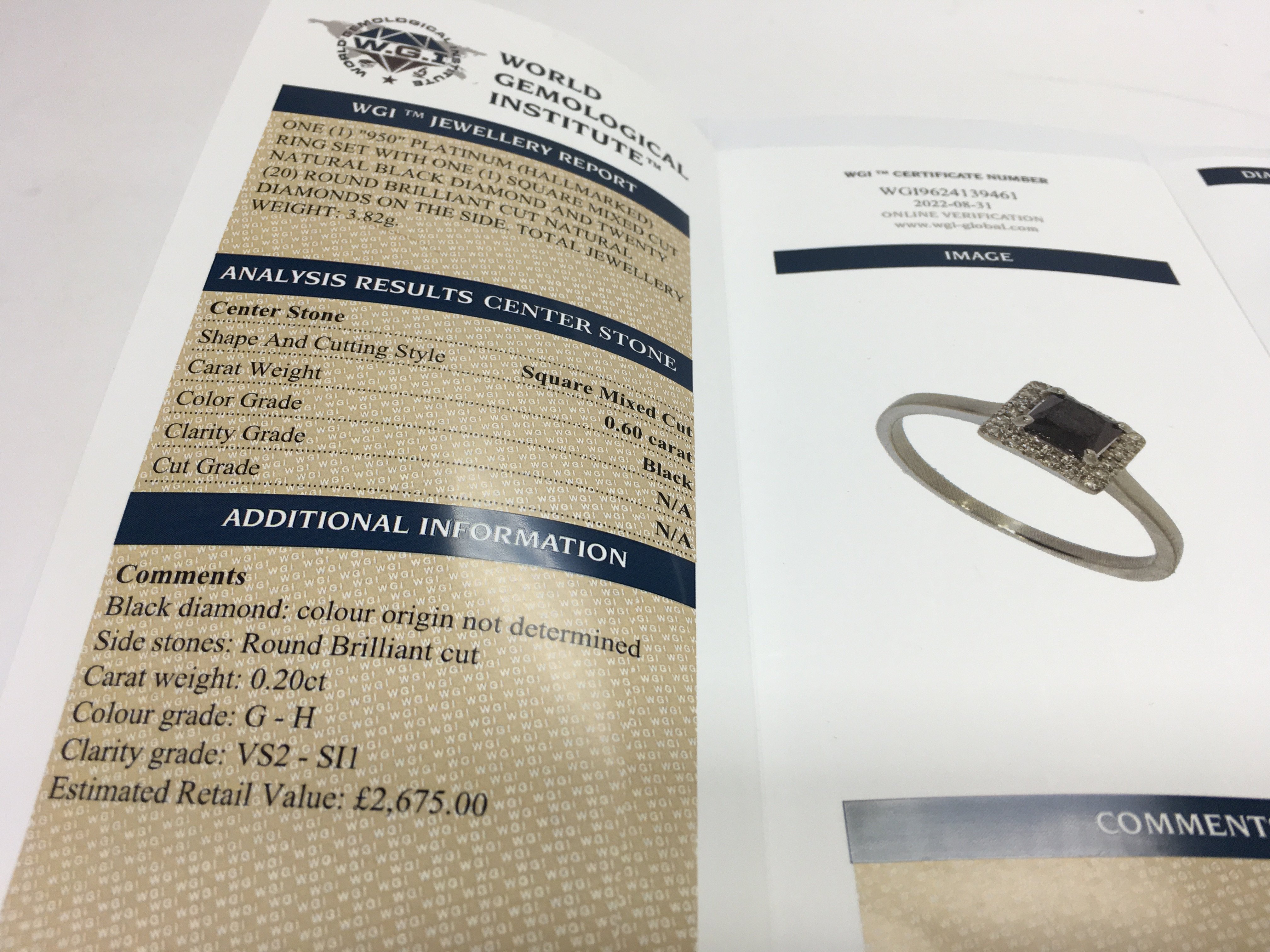 Certificated platinum ring set with square cut black diamond and a halo of RBC diamonds. Black diamond 0.60ct. Framing diamonds 0.20ct. Cert no. WGI9624139461. Ring size Approx L. Postage category A.