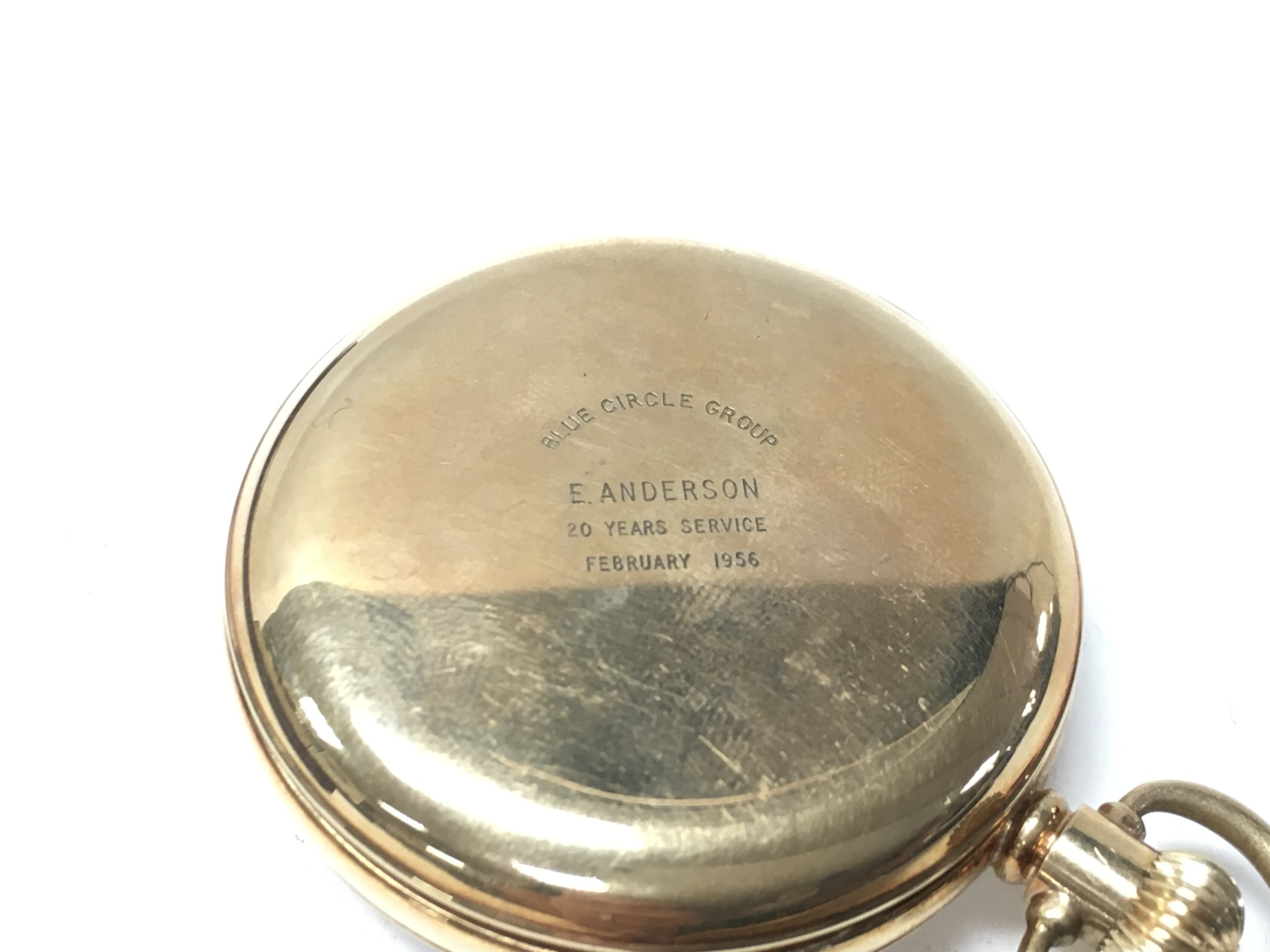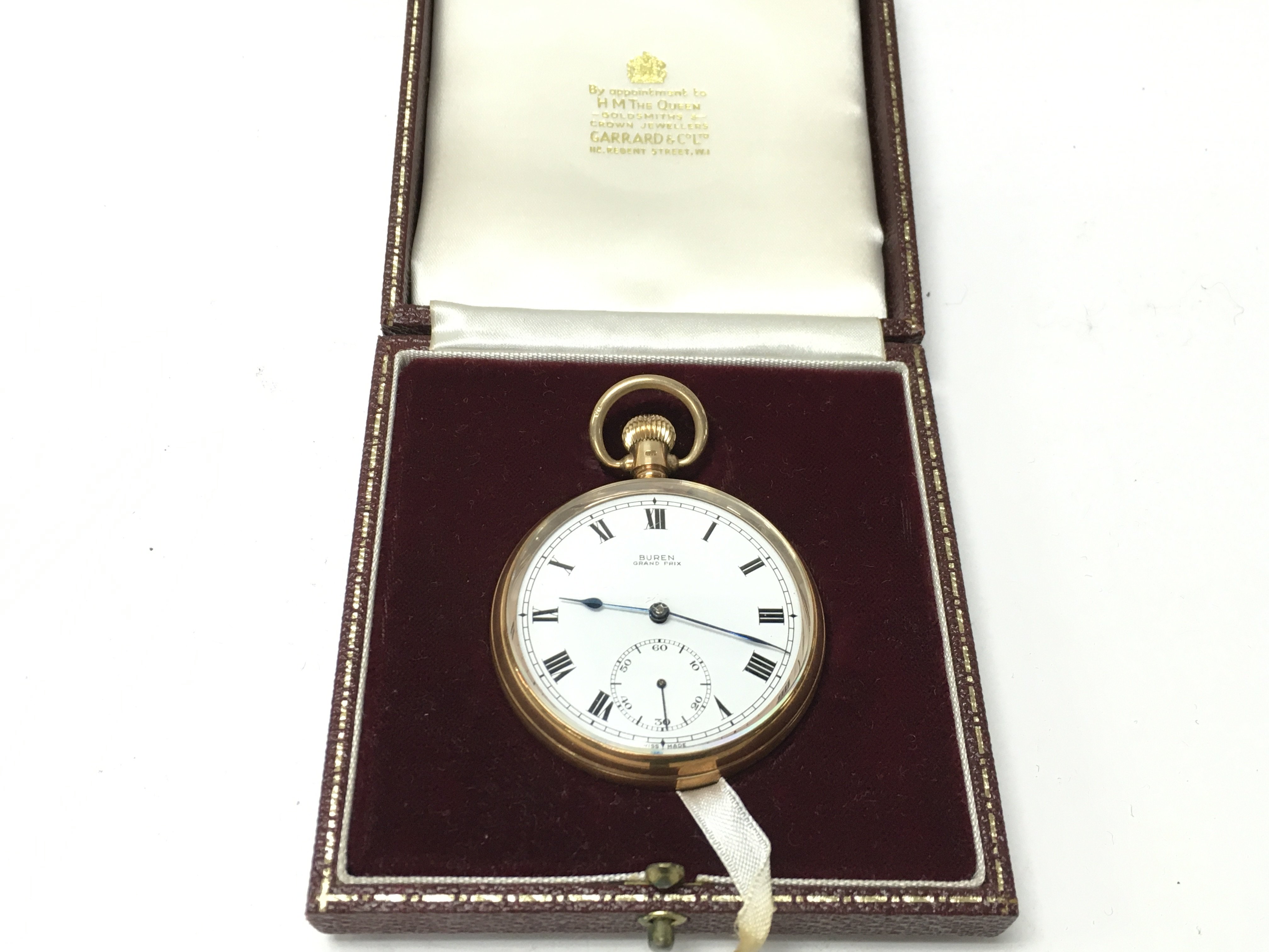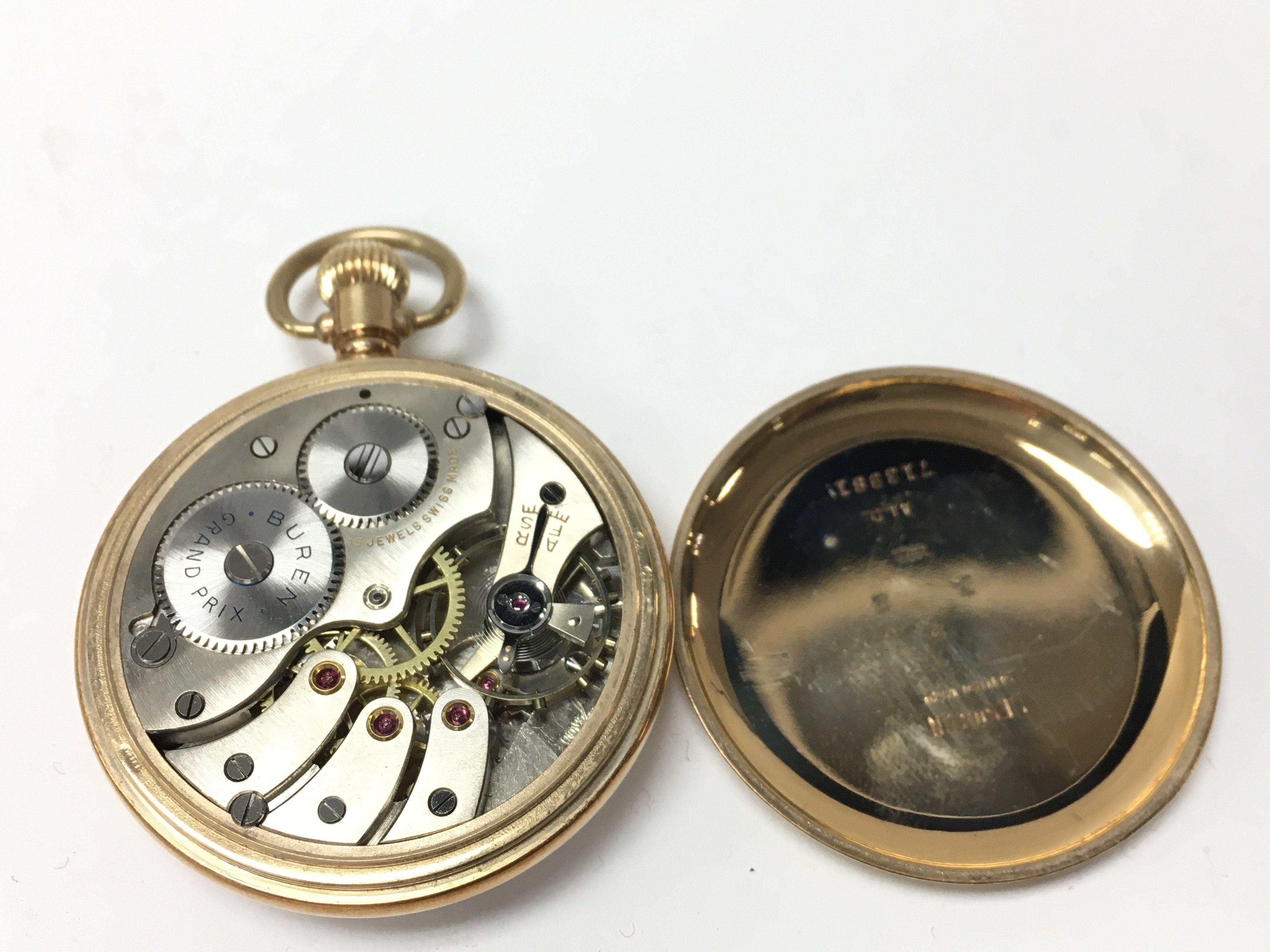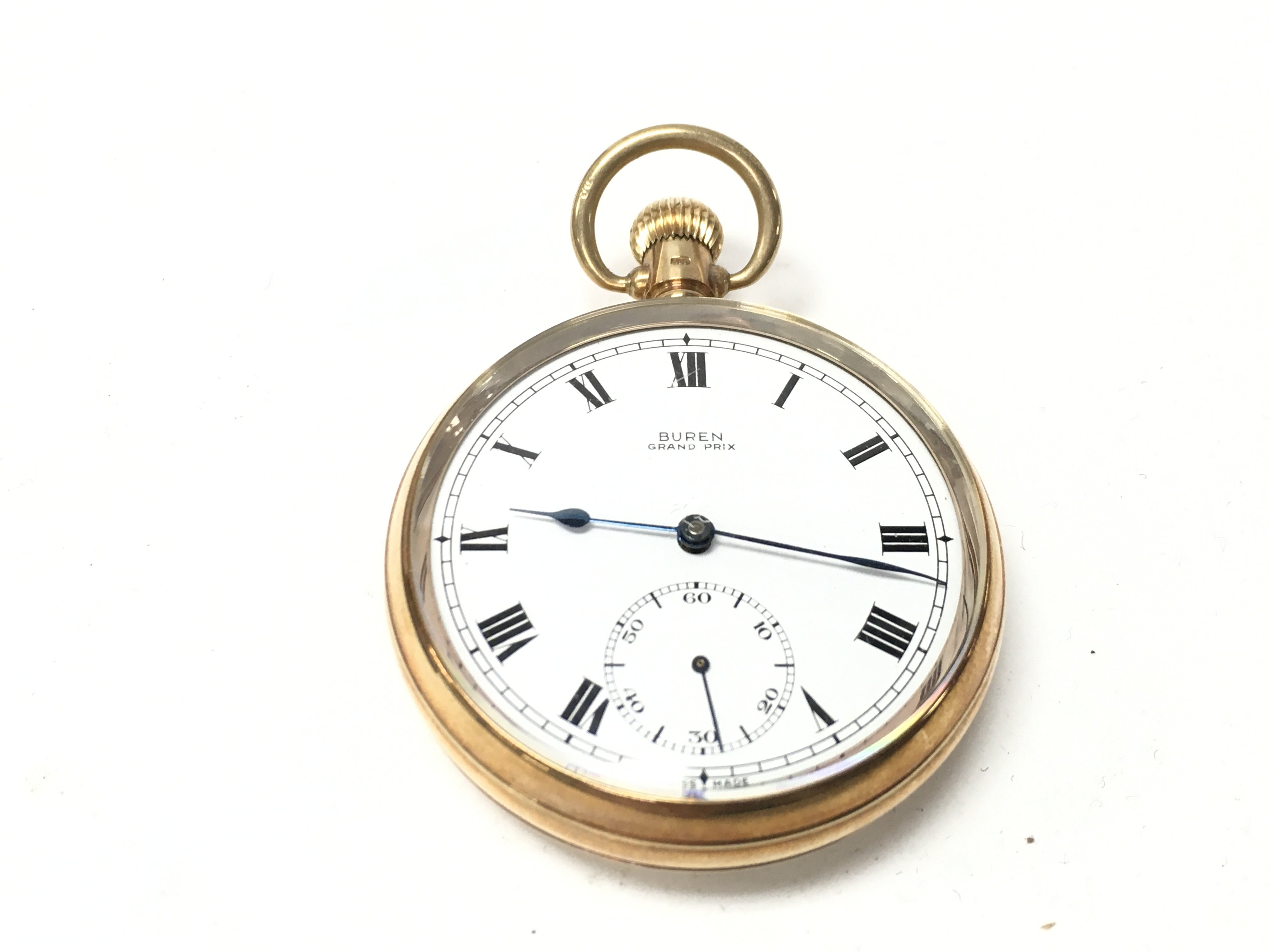 A 9ct gold Buren grand prix button wind pocket watch. Winds and runs. Approximately 47mm case. 77.47g Postage B