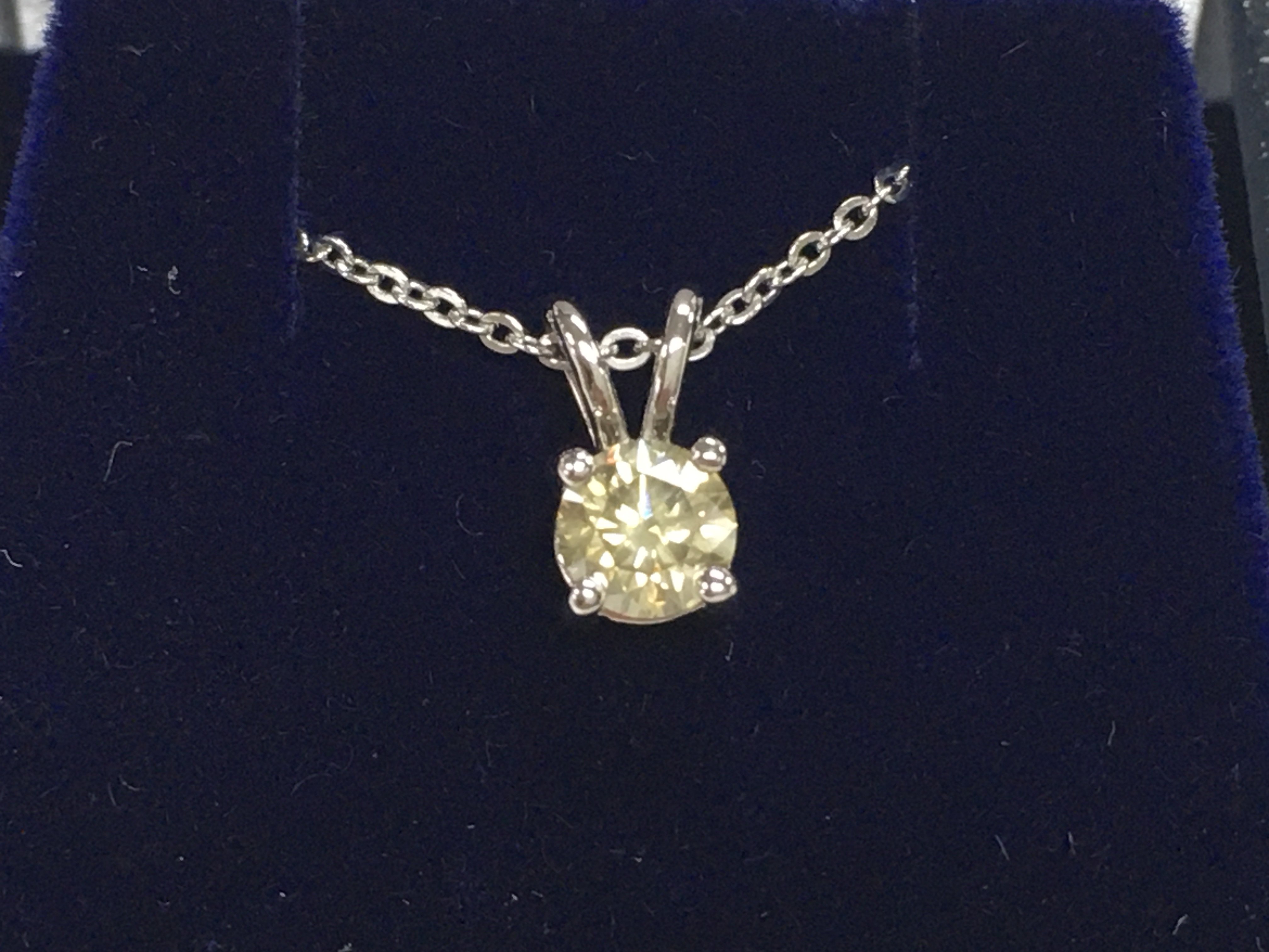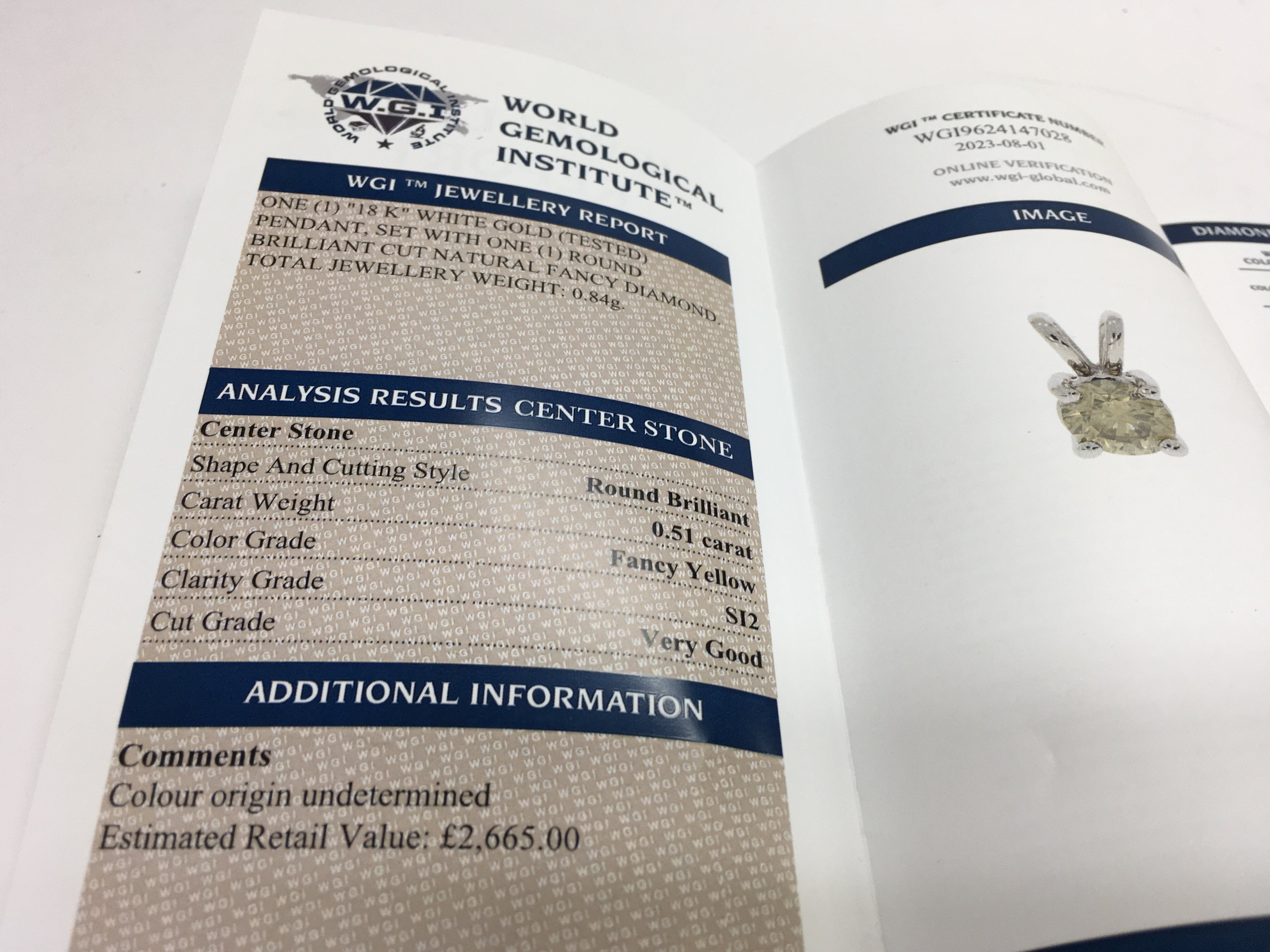Certificated 18ct white gold solitaire pendant set with fancy yellow RBC diamond on a silver chain, boxed. Diamond 0.51ct. Cert no. WGI9624147028. Postage category A.