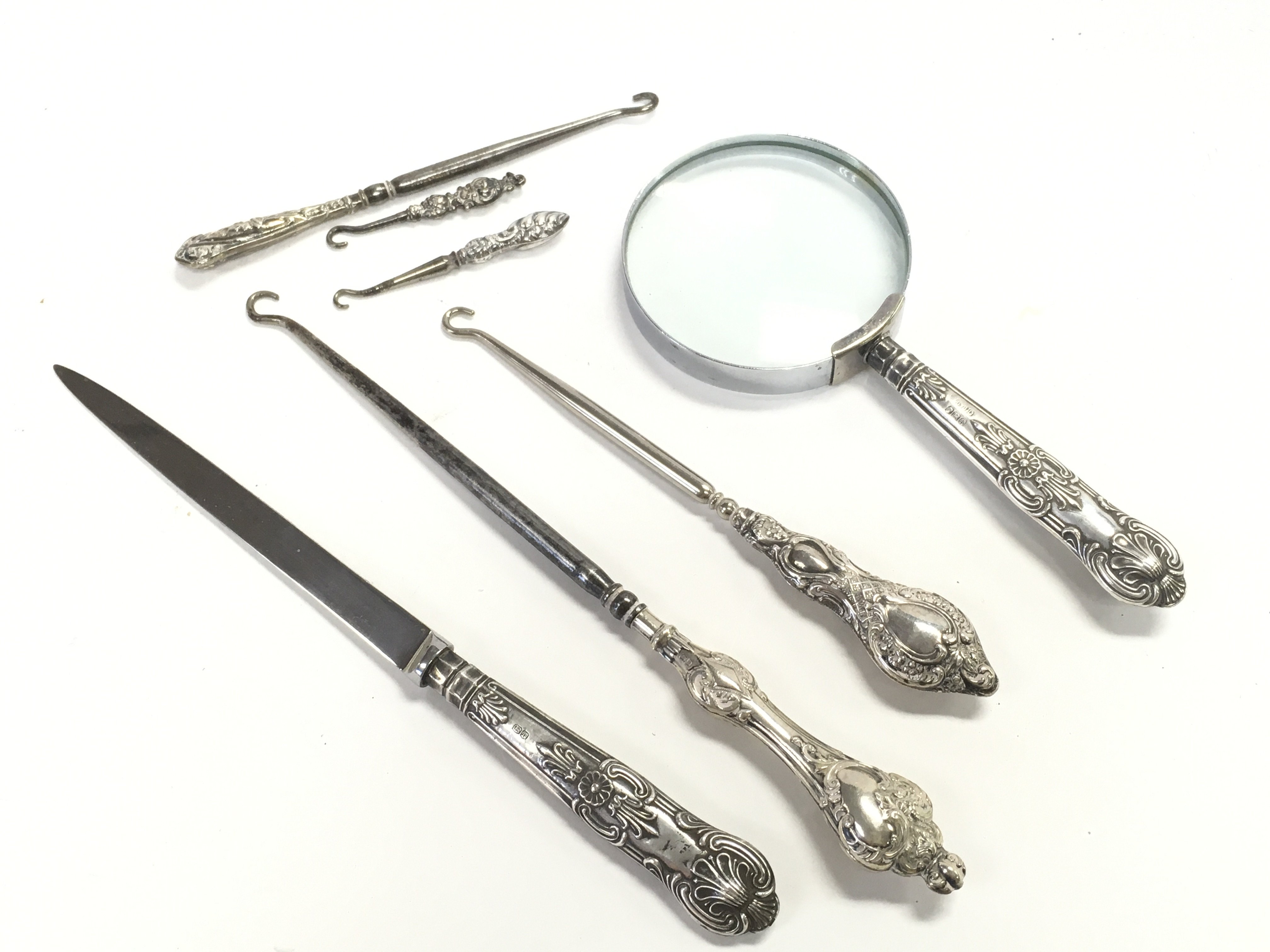 A collection of silver items to include silver handled magnifying glasses and button hooks. This lot cannot be posted
