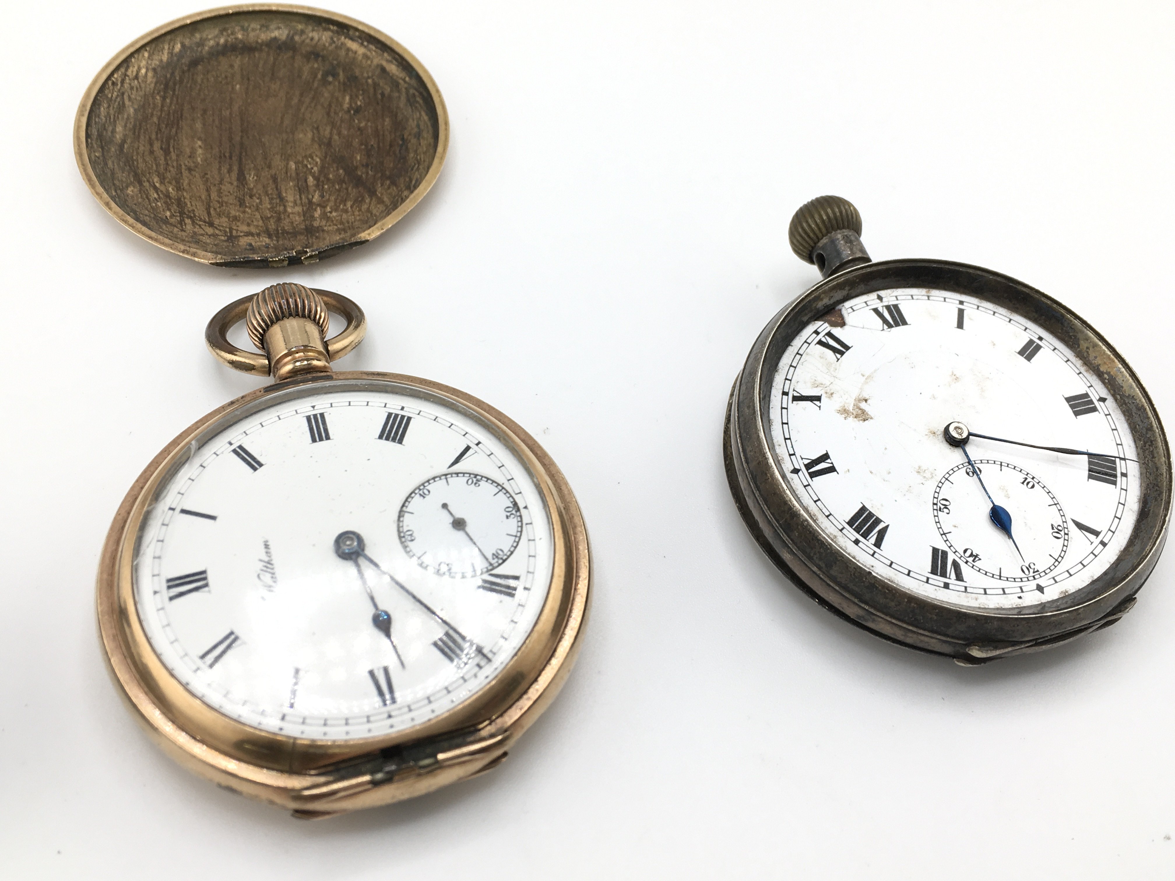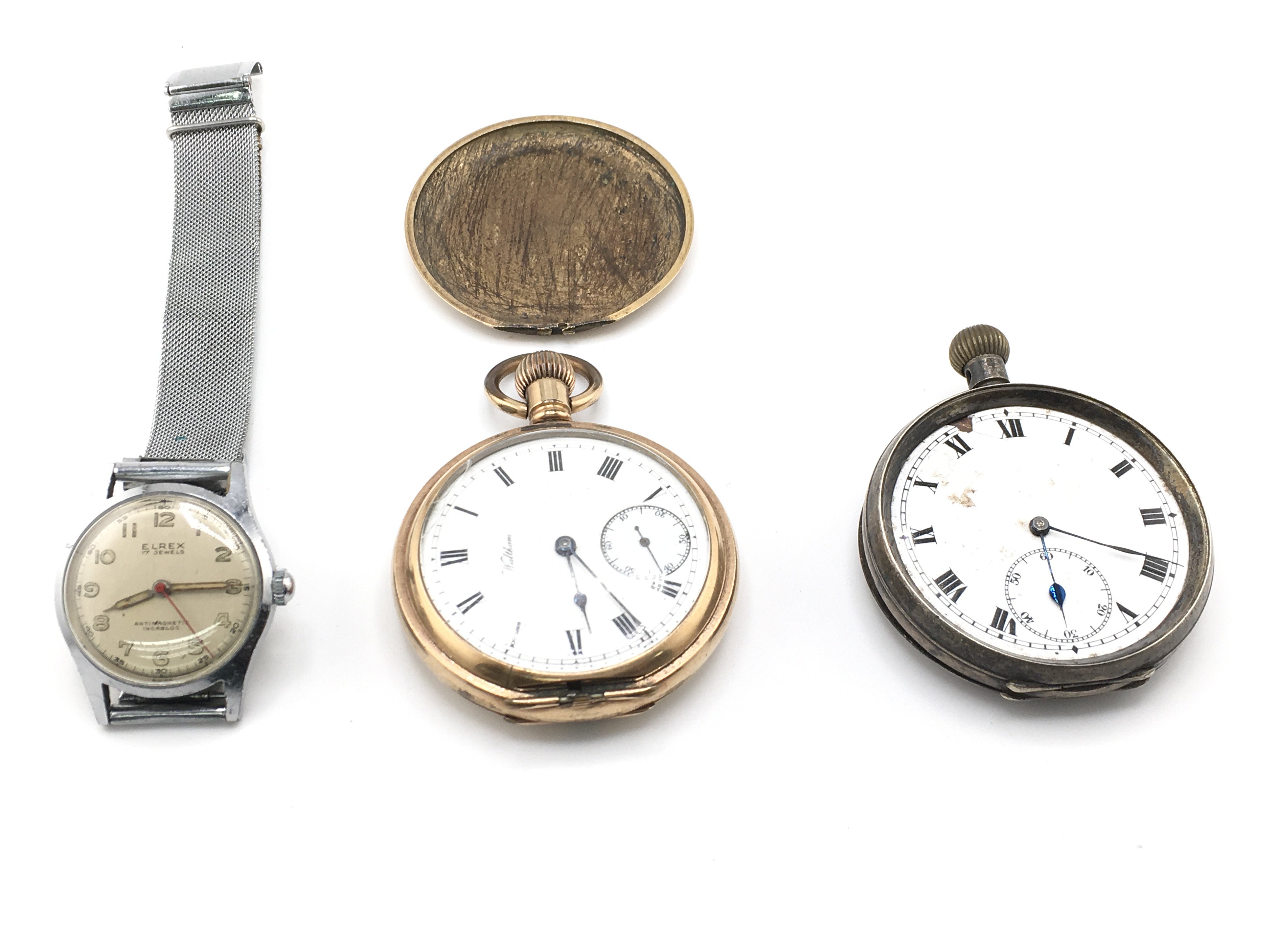 A vintage Elrex wristwatch seen running and two pocket watches one of which is silver cased not running. Postage B
