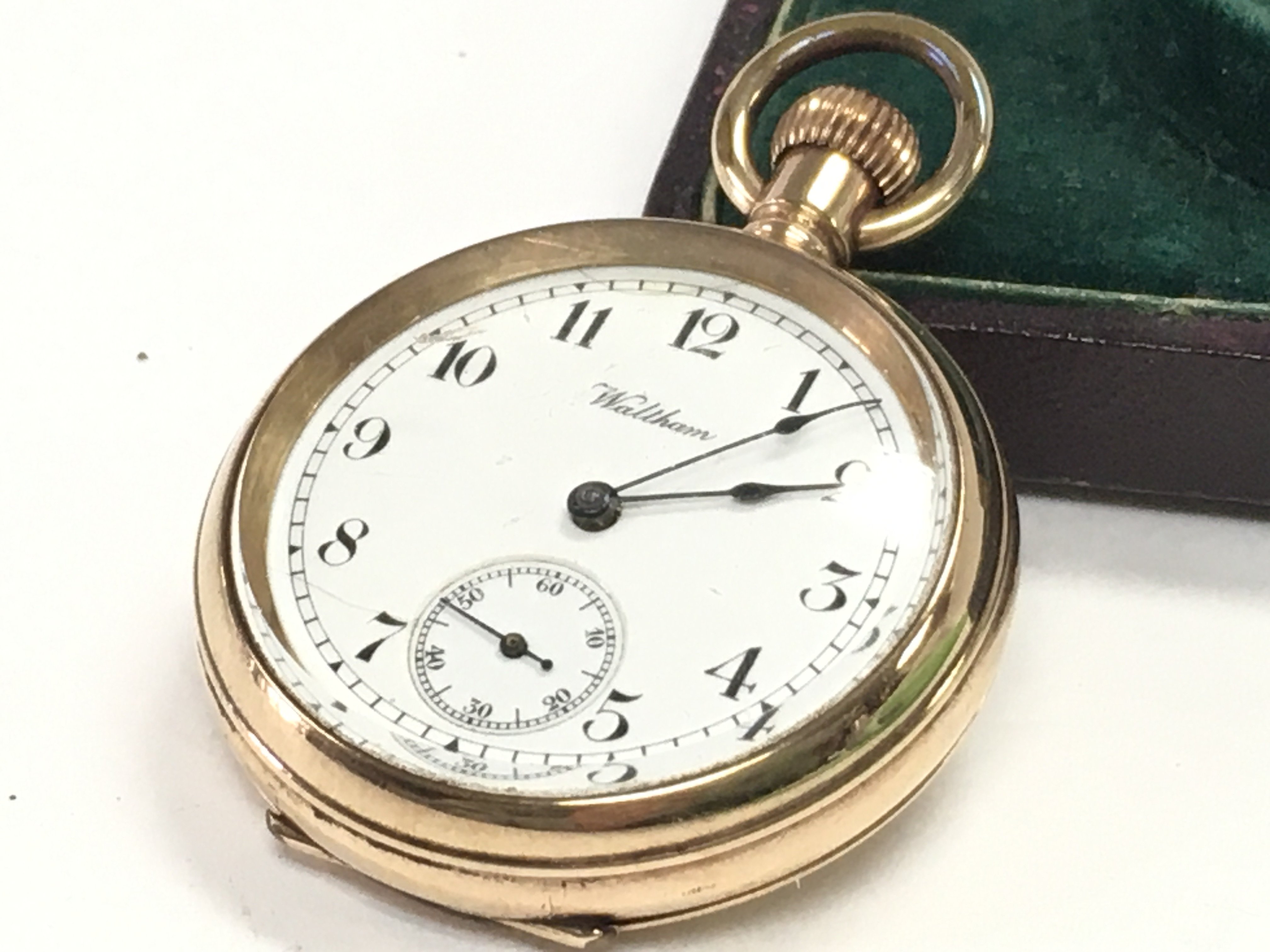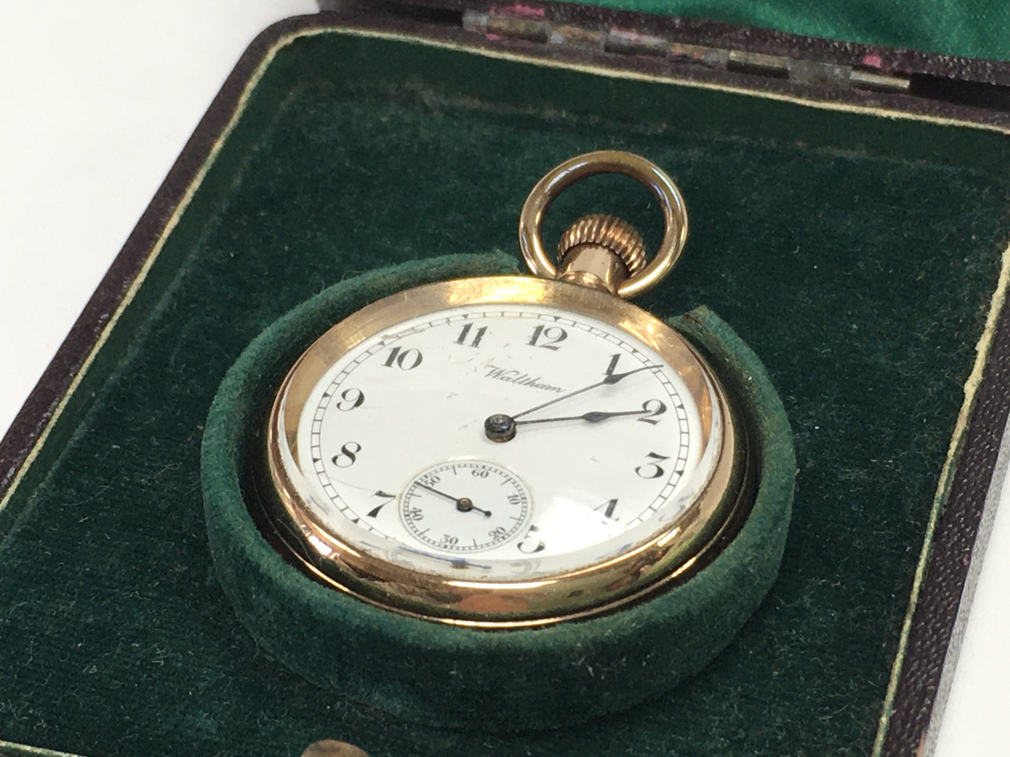 A boxed gold plated pocket watch by Waltham. Postage cat A