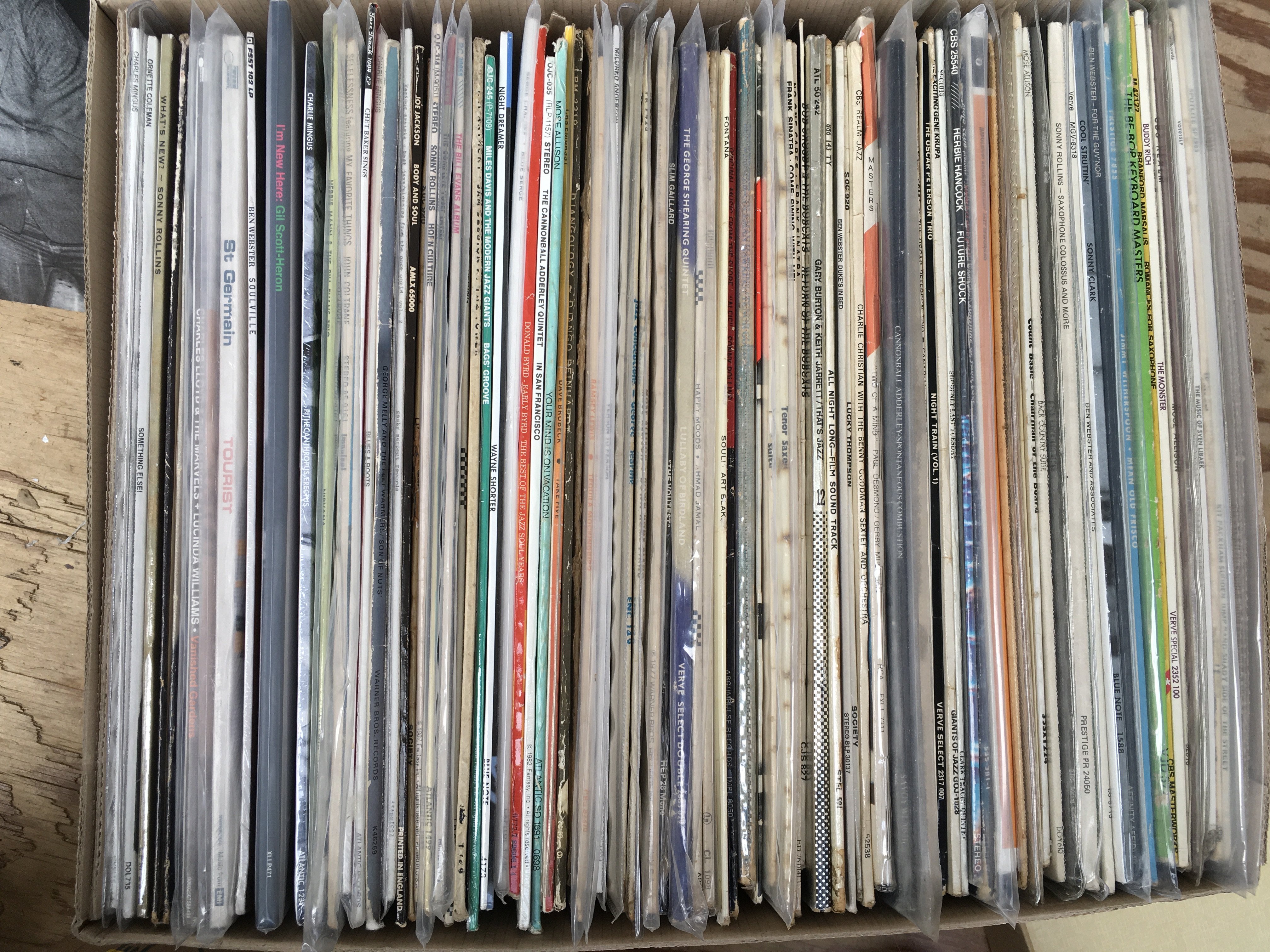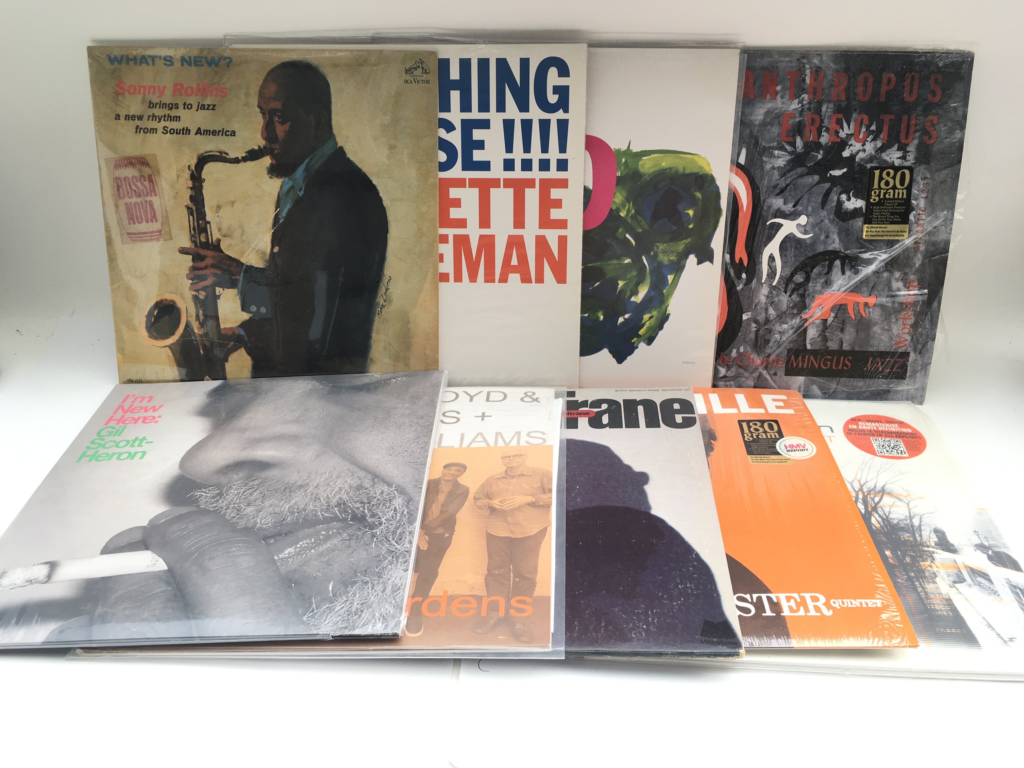 A box of jazz LPs by various artists including Sonny Rollins, Charles Mingus, Gill Scott-Heron and many more. Includes original and 180g reissues.