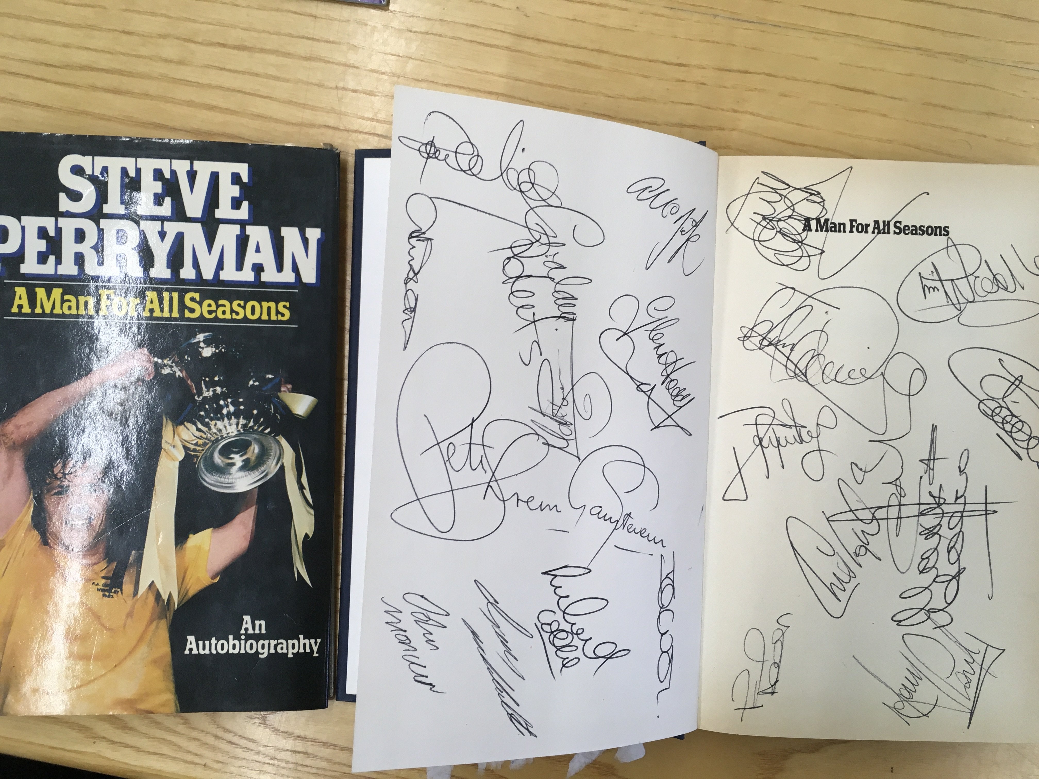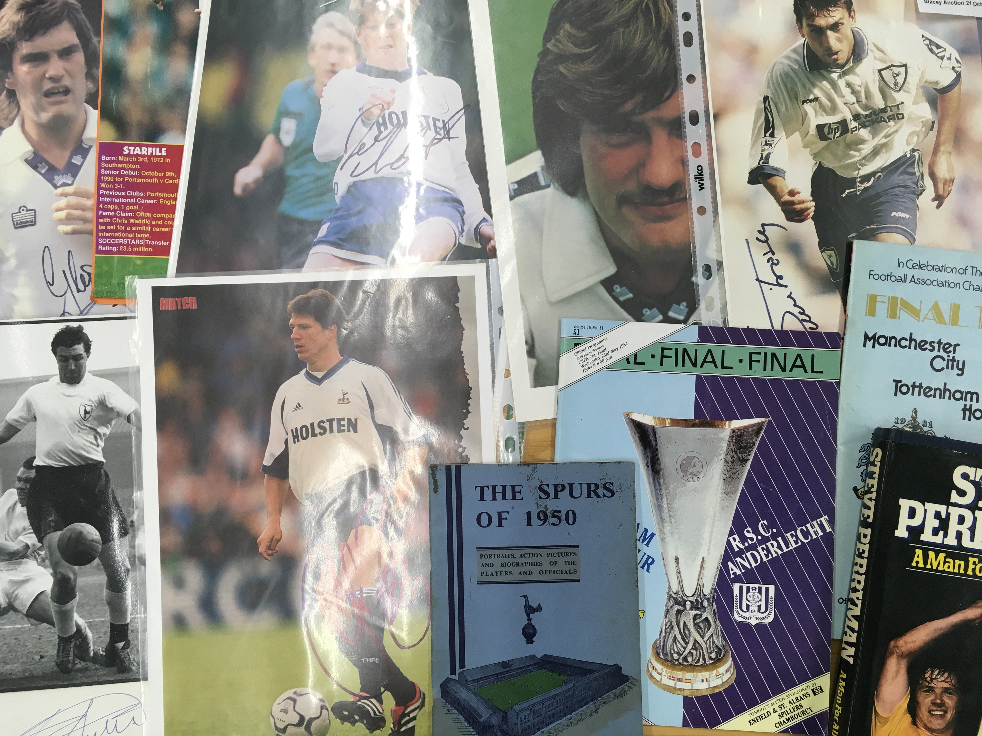 Tottenham Signed Football Memorabilia: Steve Perryman book signed and dedicated by him and around 20 team mates including Steven Mabbutt Moncur Waddle and Falco. Signed photos include Ziege Anderton Hoddle and Smith. C/W The Spurs of 1950 players book and more.