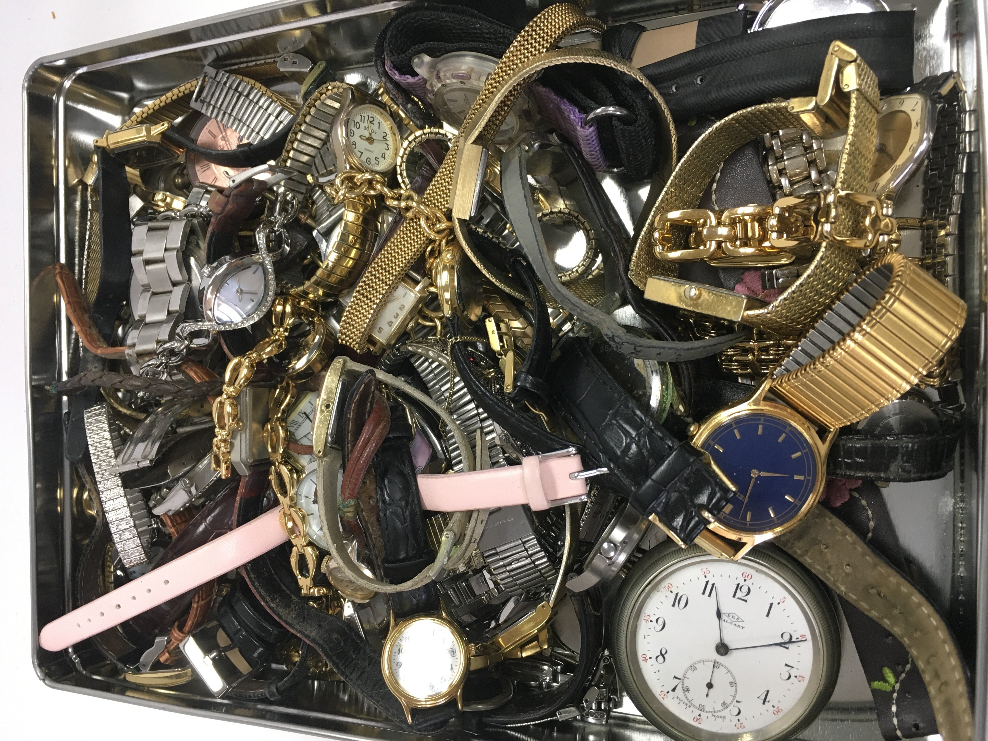 A tin of watches including Seiko, Rotary, Accurist, Lorus etc