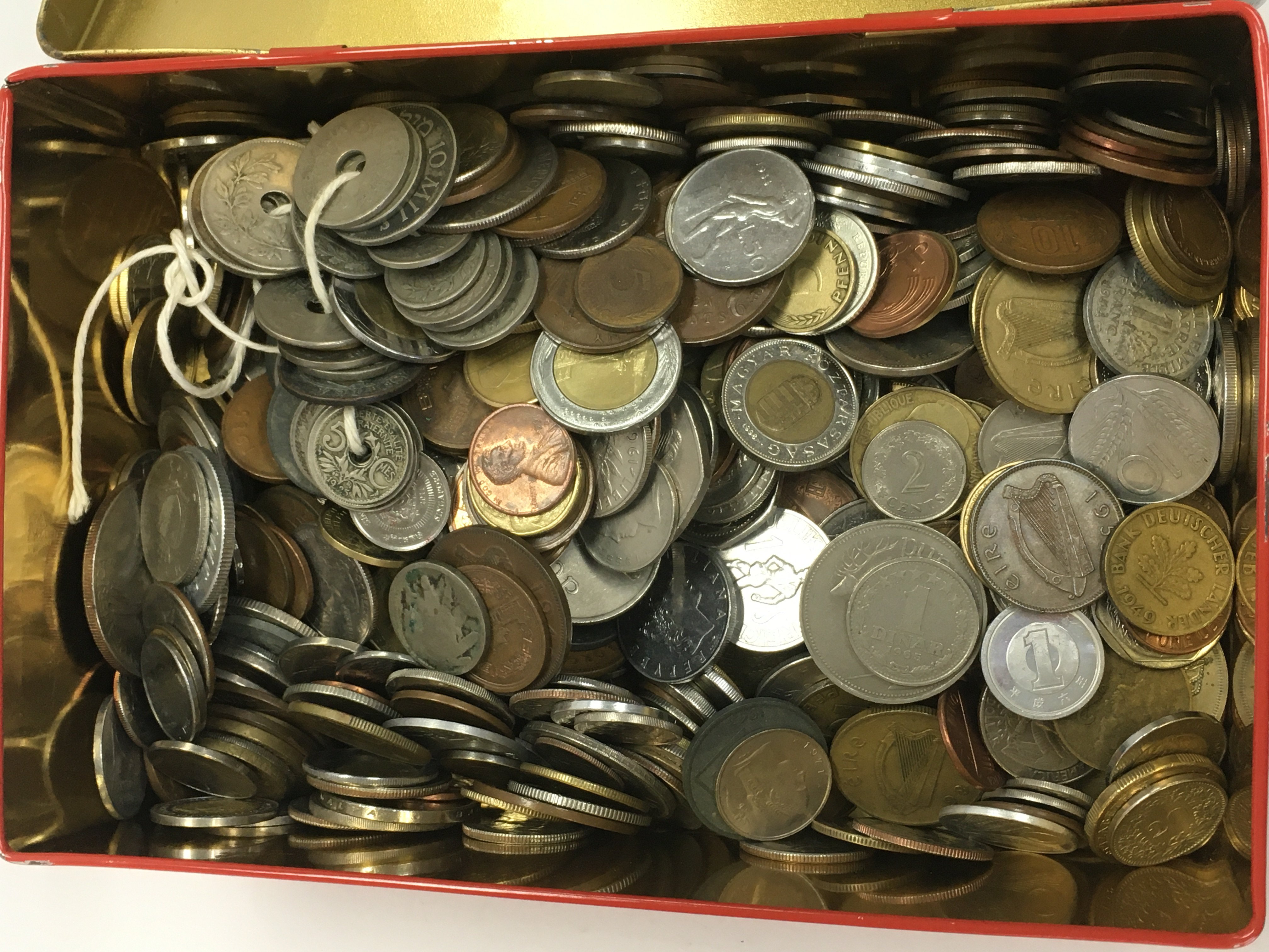 A tin of mixed foreign coins including Peseta, Cents, Mils, Centimes etc