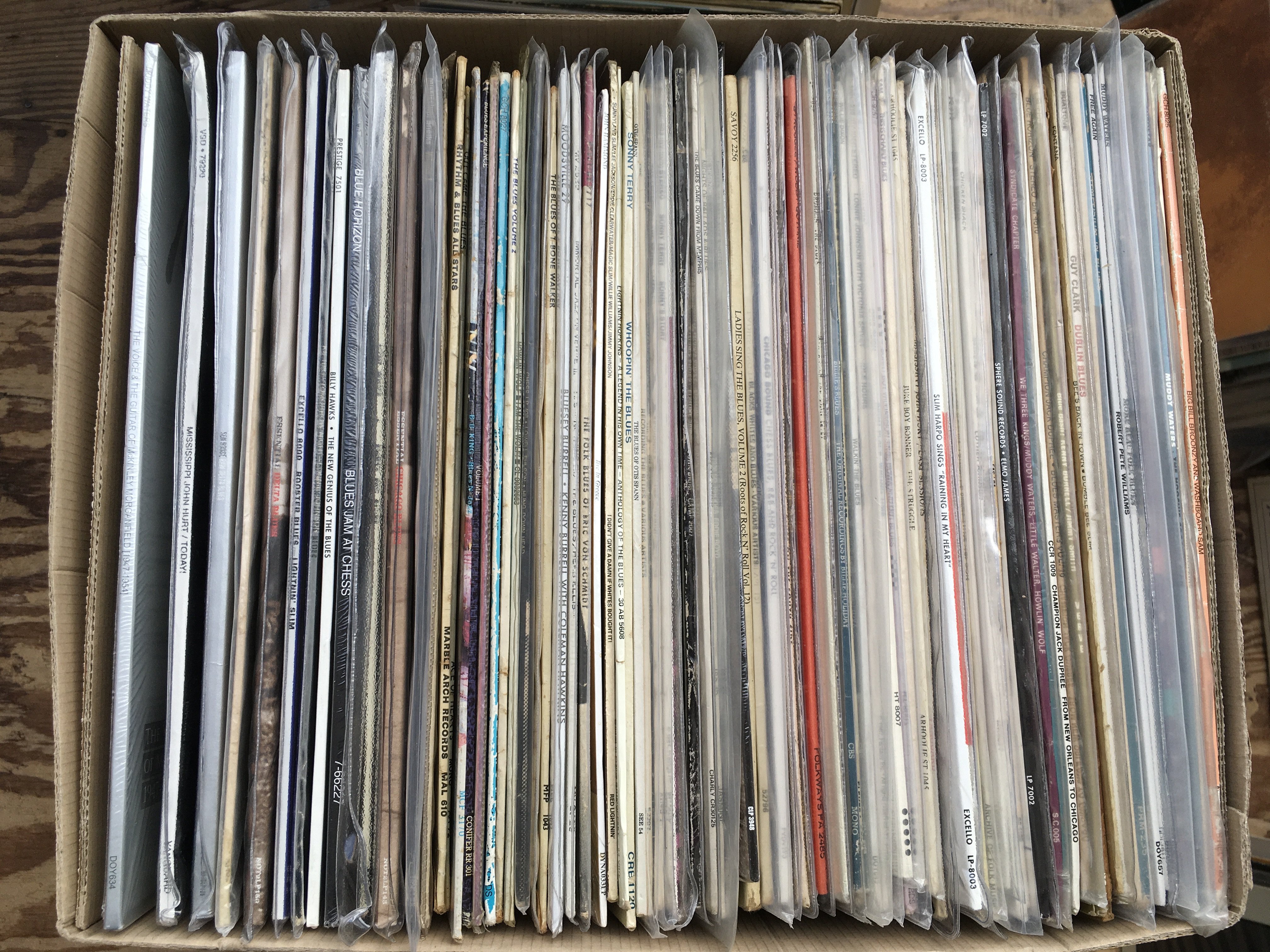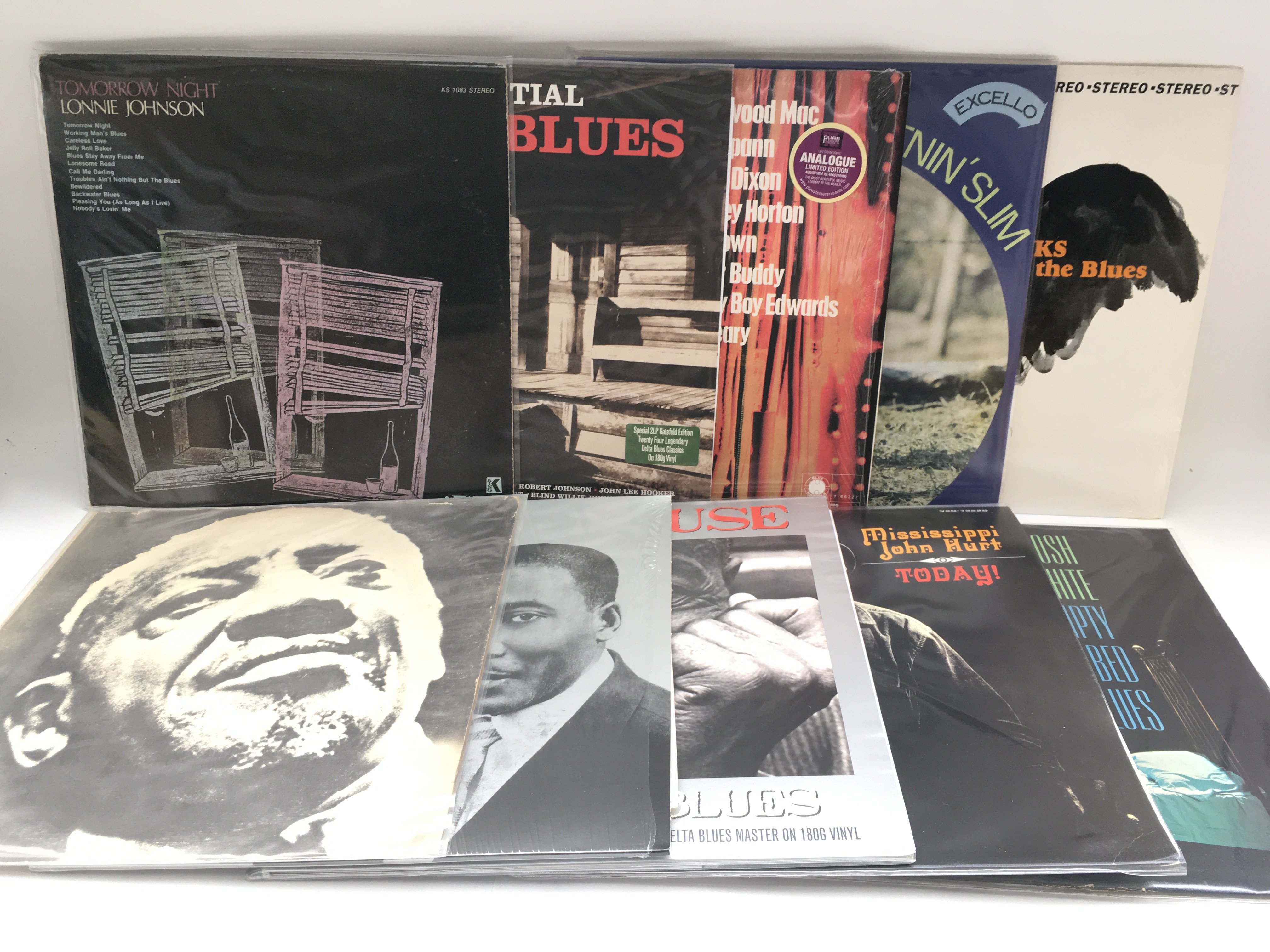 A box of blues LPs by various artists including Son House, Mississippi John Hurt, Sonny Boy Williamson and many more. Includes both original UK pressings and 180g reissues.