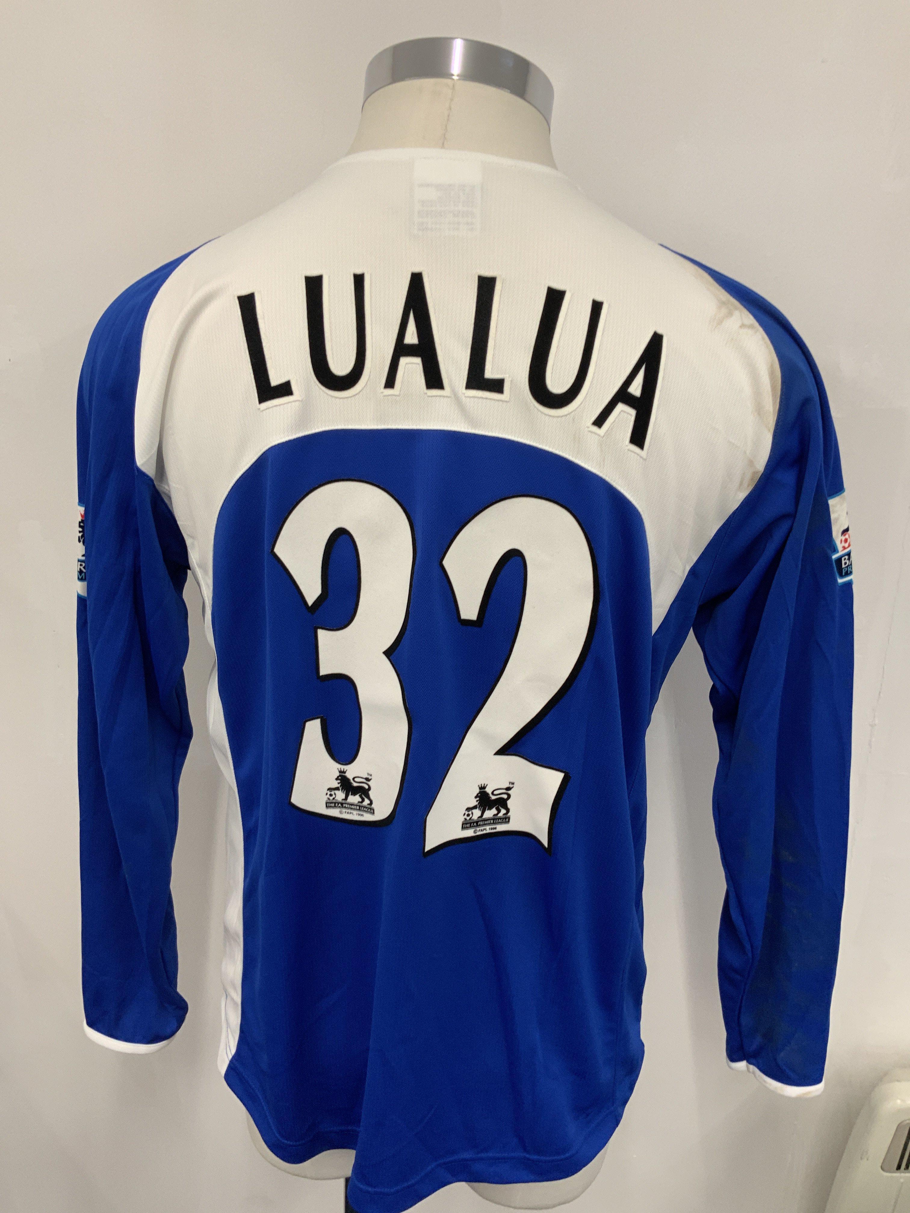 Lualua Portsmouth 2005 - 2006 Match Worn Football Shirt: Blue long sleeve with Lualua number 32 to rear. Premier League badging to sleeves. Swapped with Bobby Zamora. Unwashed.