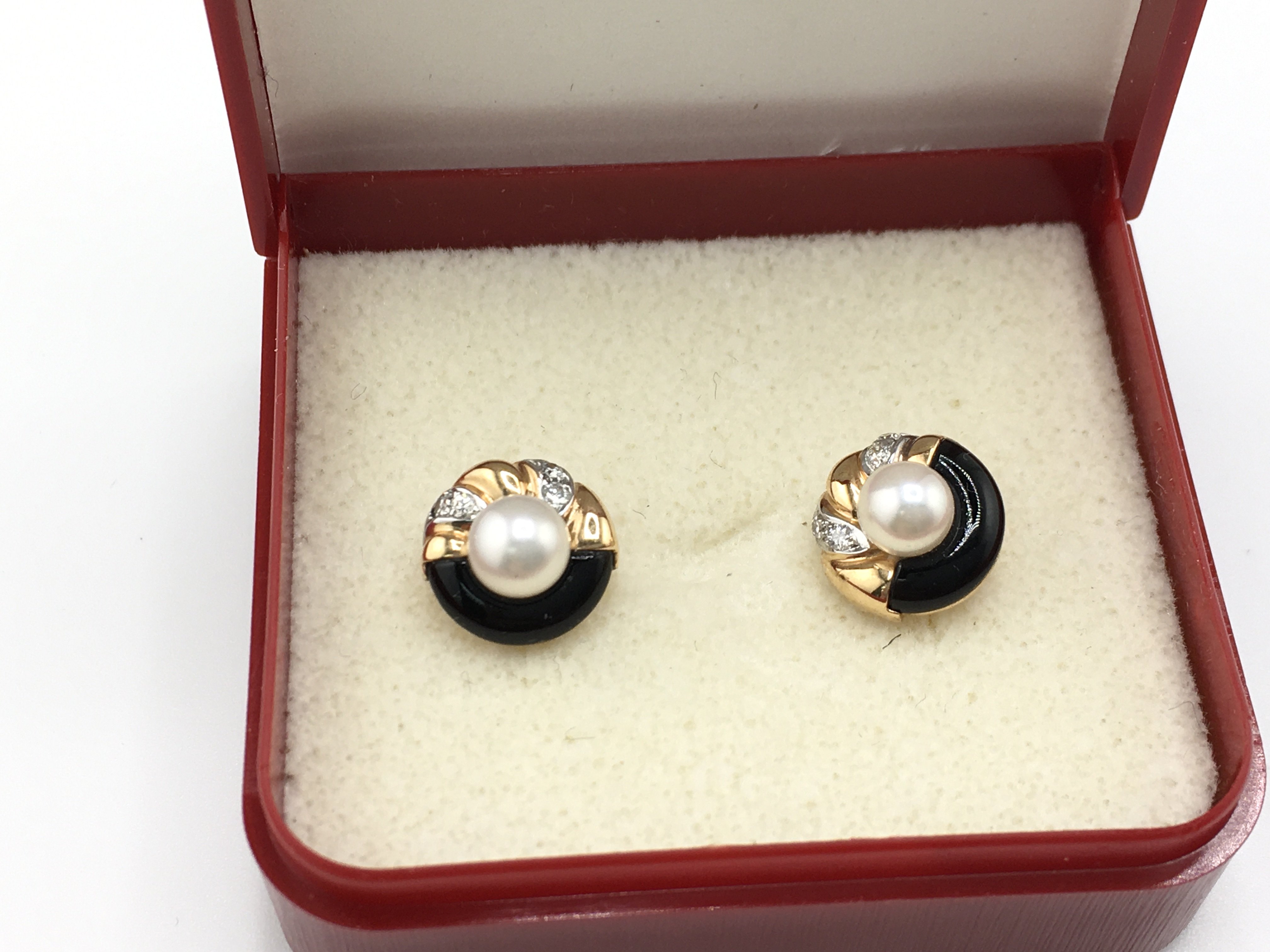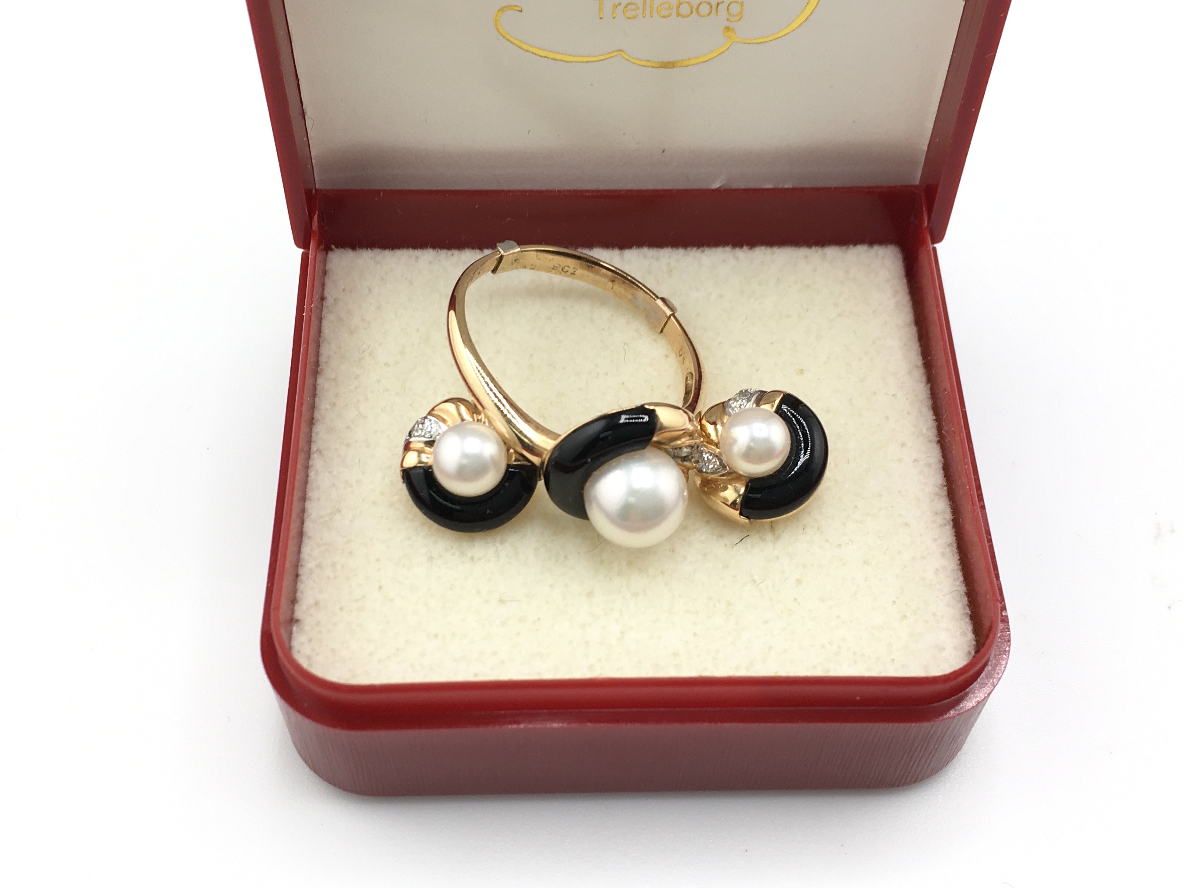 A modern design 18carat gold ring with matching earrings set with pearl and small diamonds.weight 7.5g