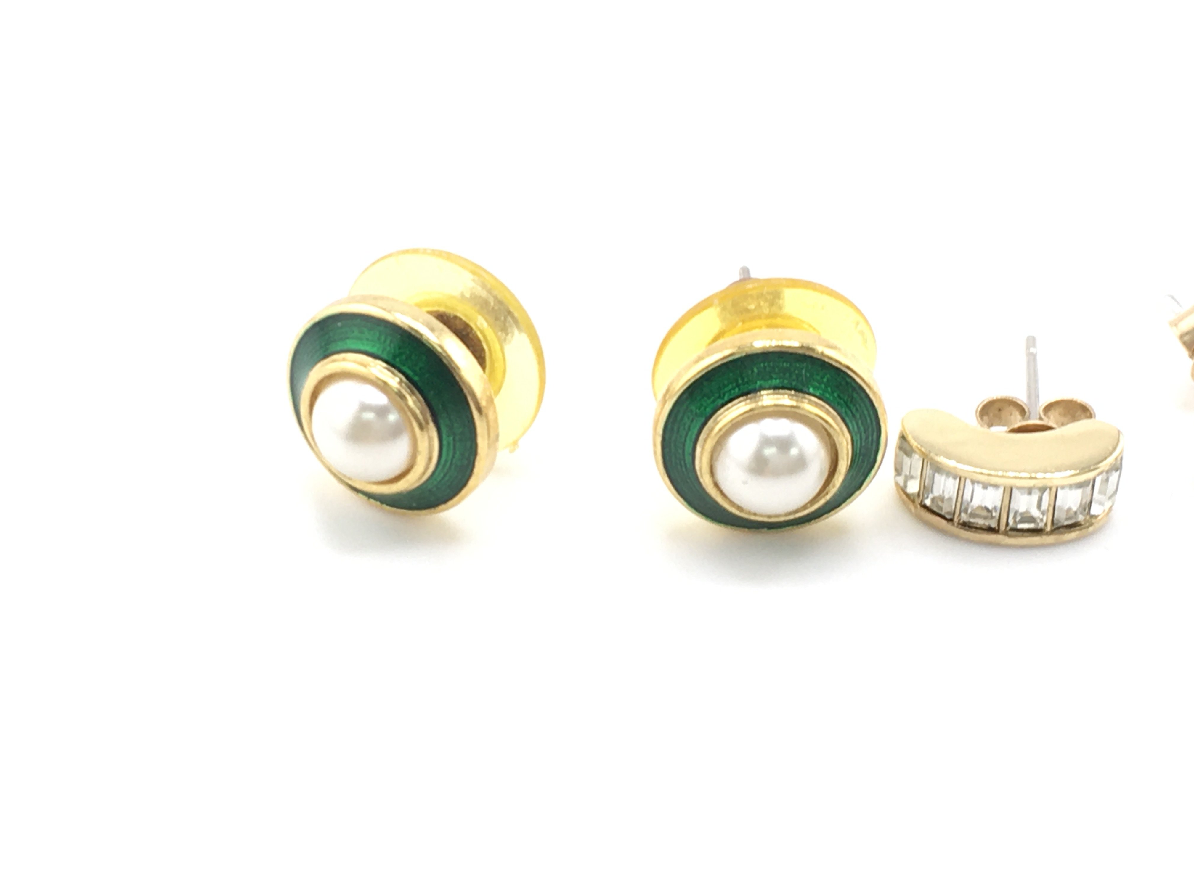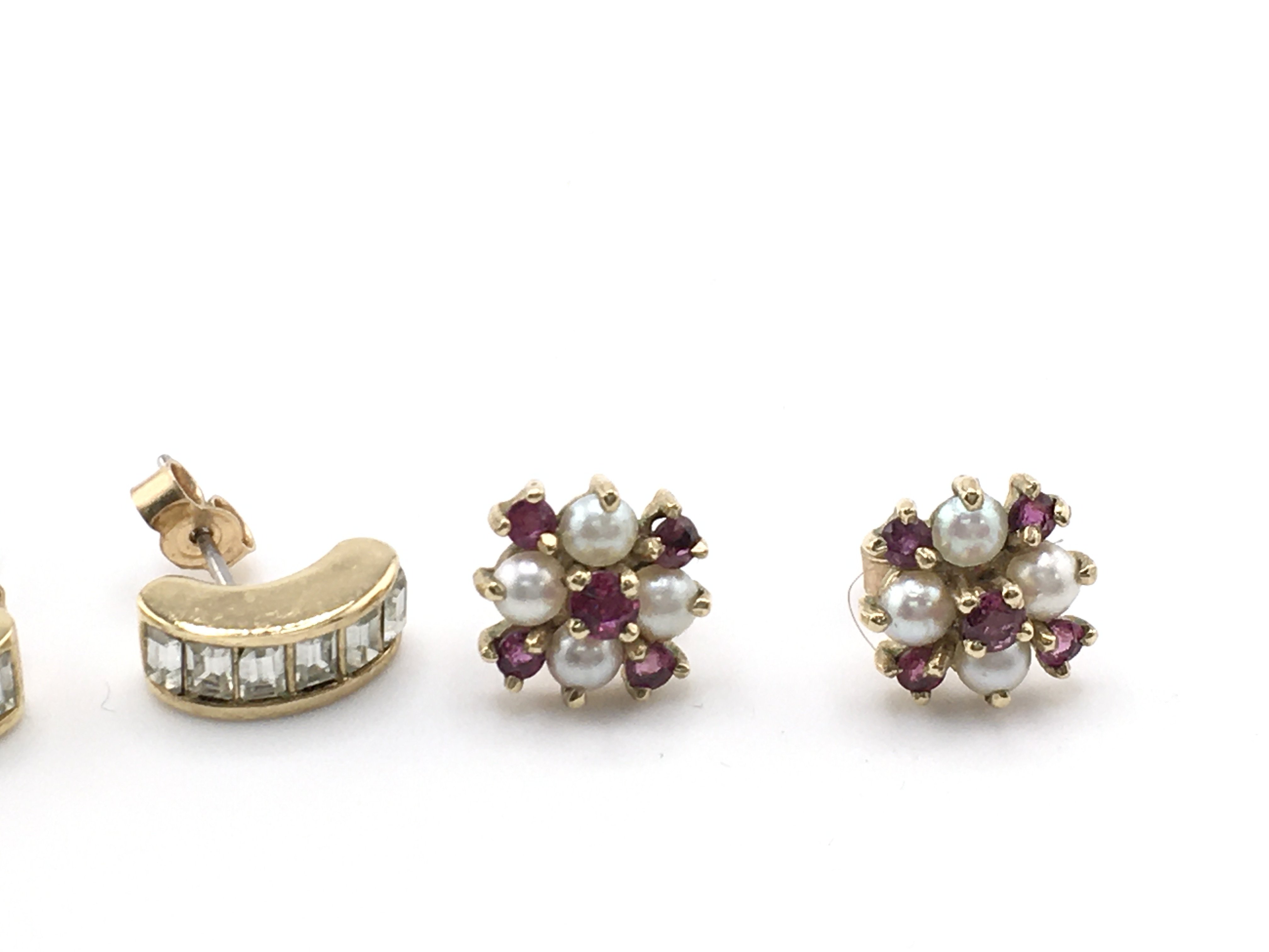 A pair of 9carat gold earrings set with pearl and garnet stones and two other pairs of gold plated dress earrings.