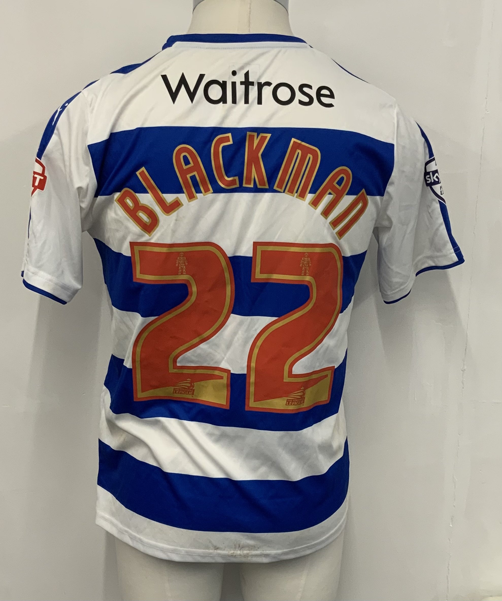 Blackman Reading 2015 - 2016 Match Worn Football Shirt: Blue and white short sleeve with Blackman number 22 to rear. Football League badging to sleeves. Swapped with Bobby Zamora. Unwashed.