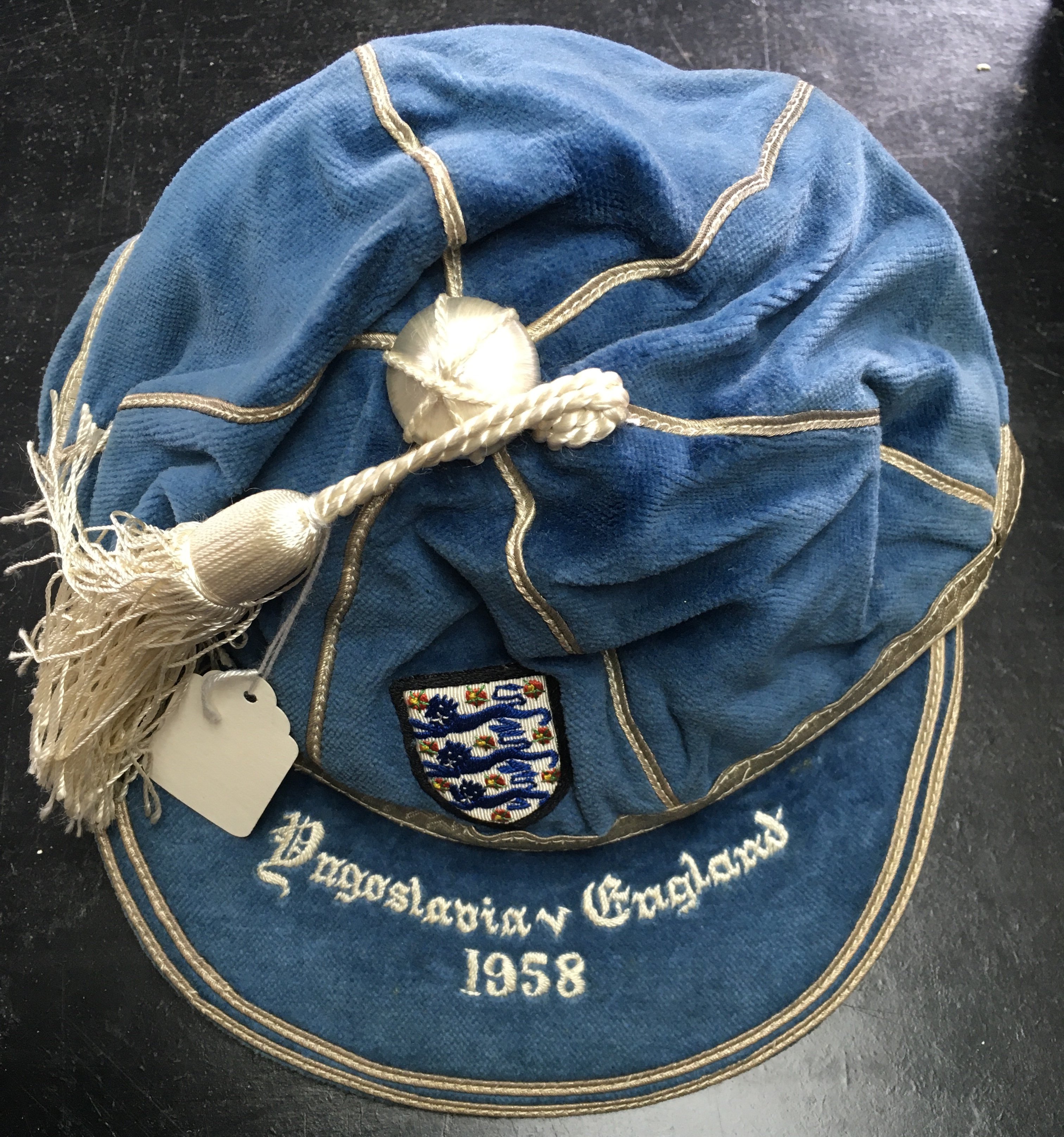 Eddie Hopkinson 1958 England Football Cap: Awarded to Hopkinson for playing in the match in Belgrade on 11 5 1958. Bolton goalkeeper Hopkinson was making his 6th full international appearance. Below the three lions on peak are the words Yugoslavia v England 1958.