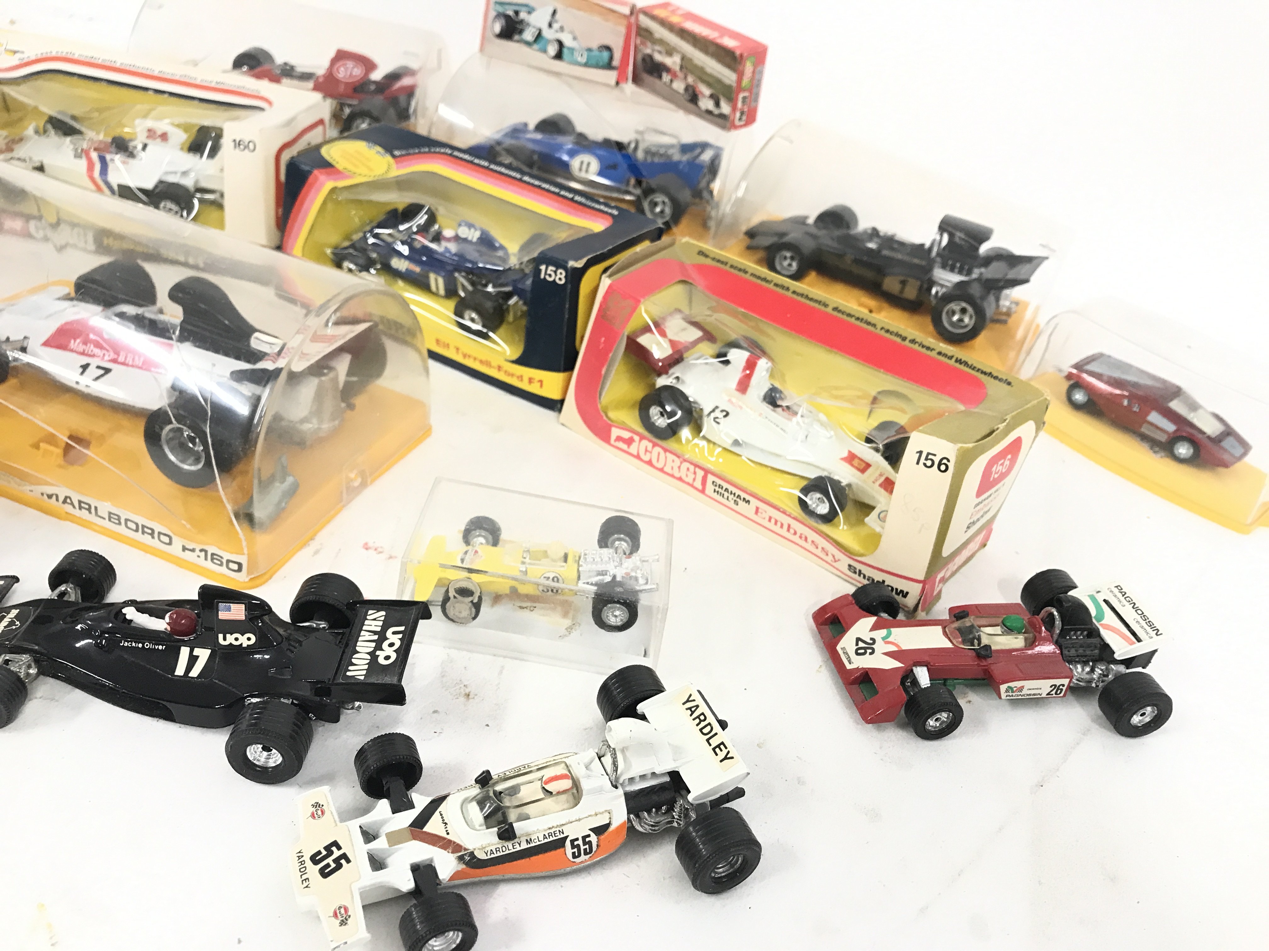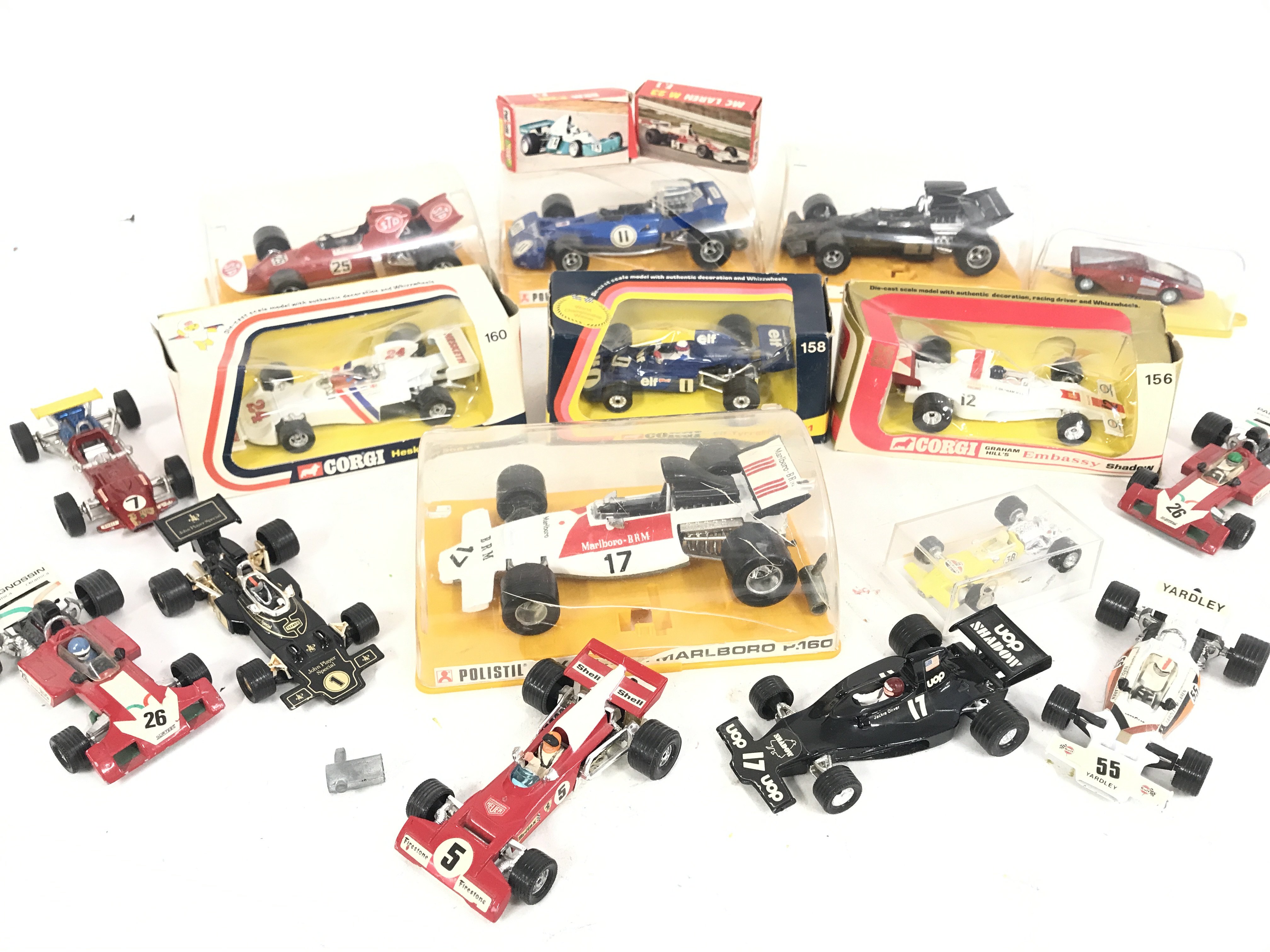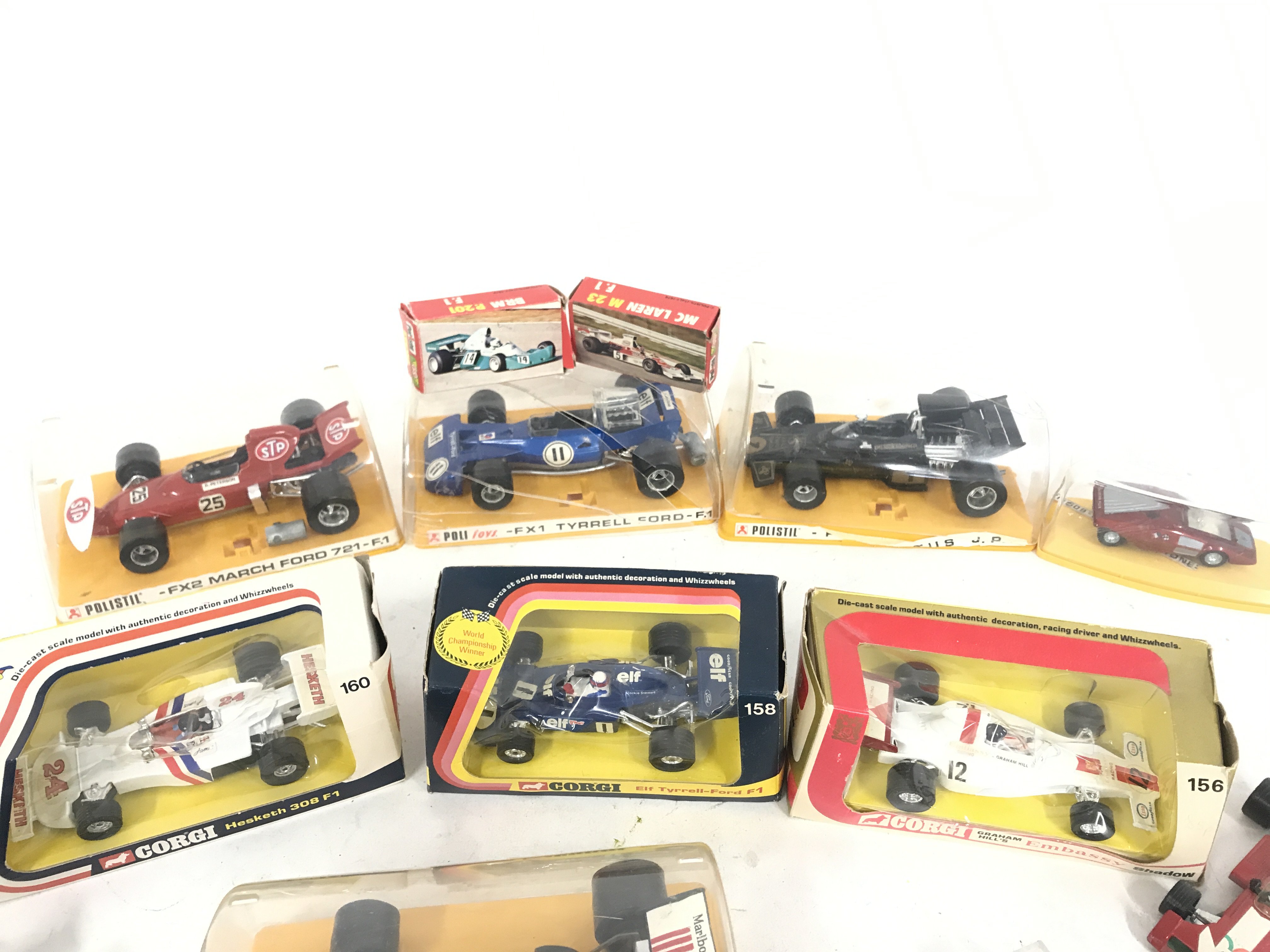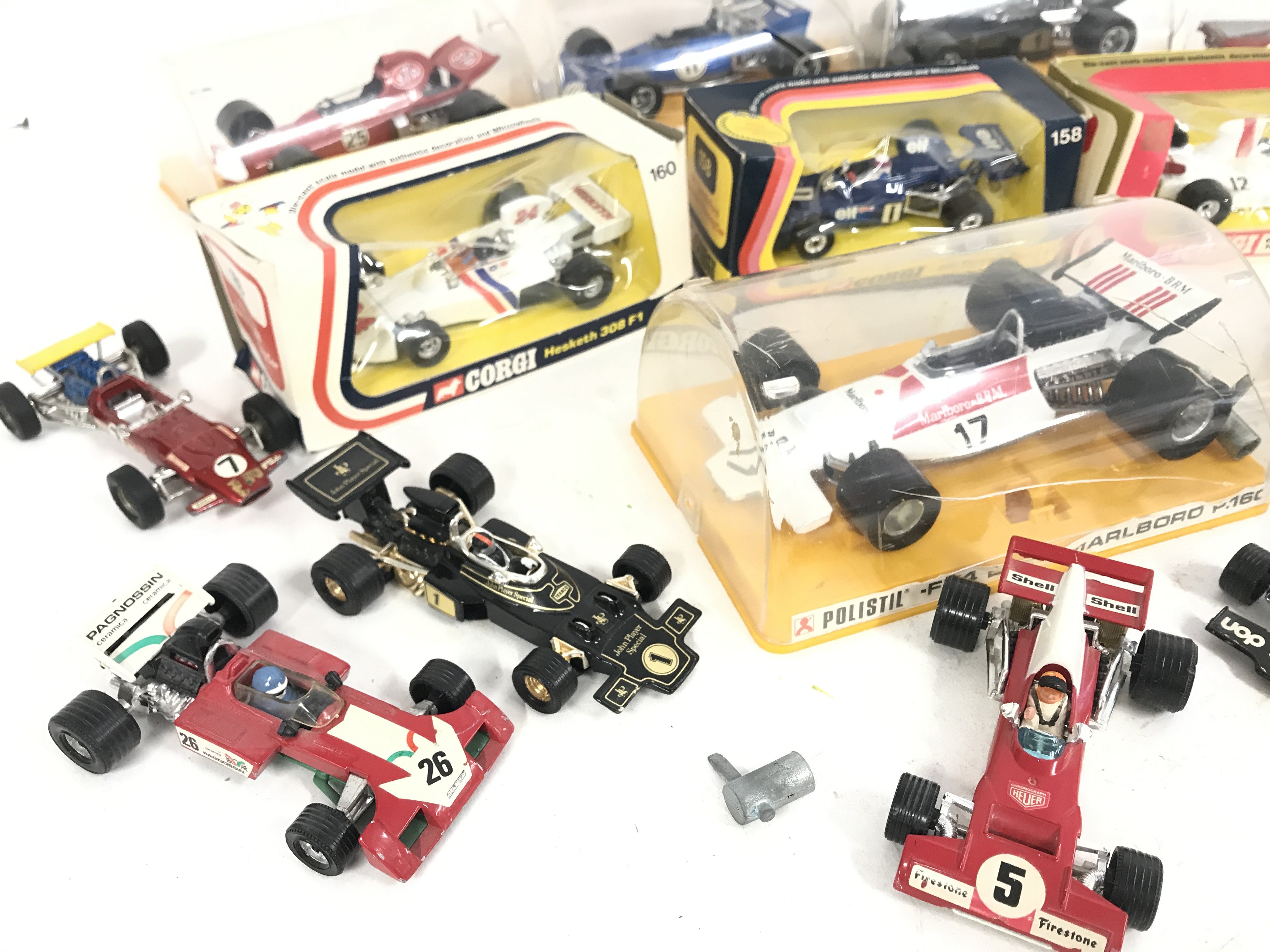 A Collection of Boxed and Loose F1 Cars Including Corgi and Polistil. Boxes are Worn.