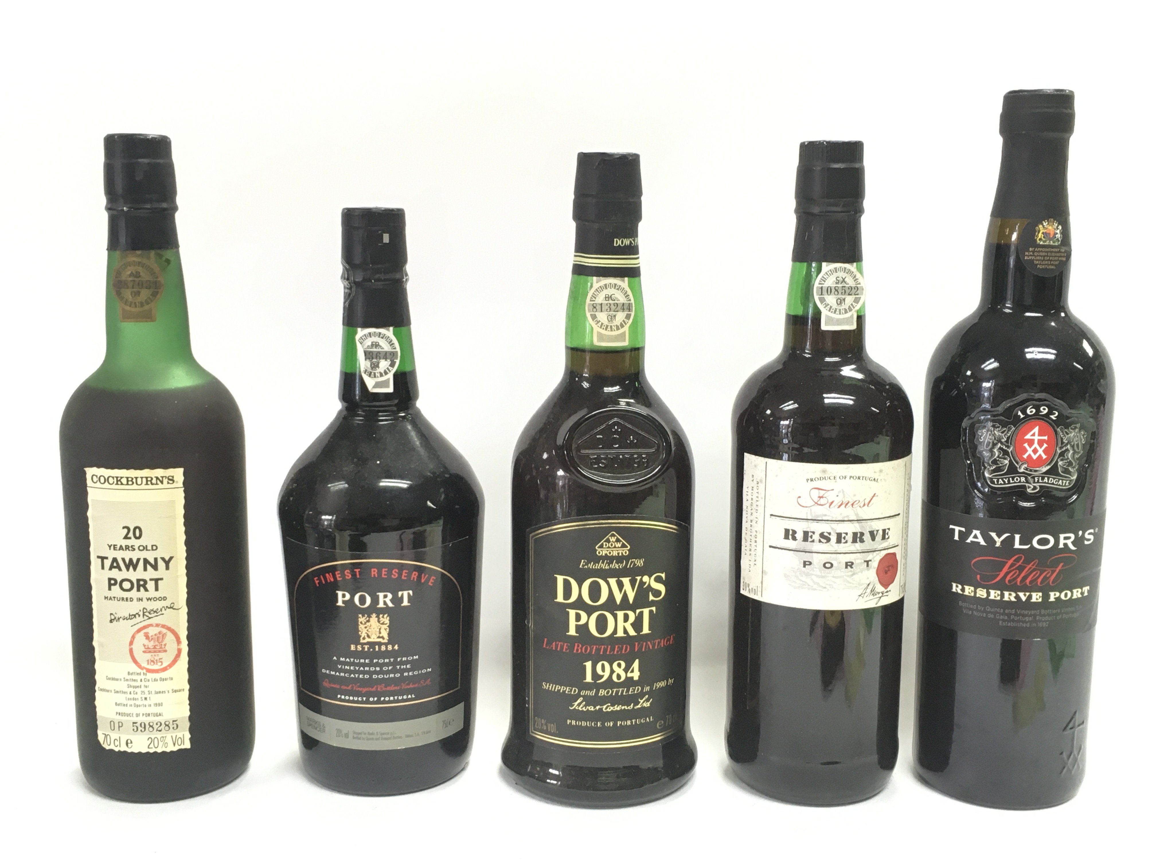 Five bottles of port including 20 years old Tawny Port, Dows Port Late bottled vintage 1984, Taylors Select reserve port. This lot cannot be posted.