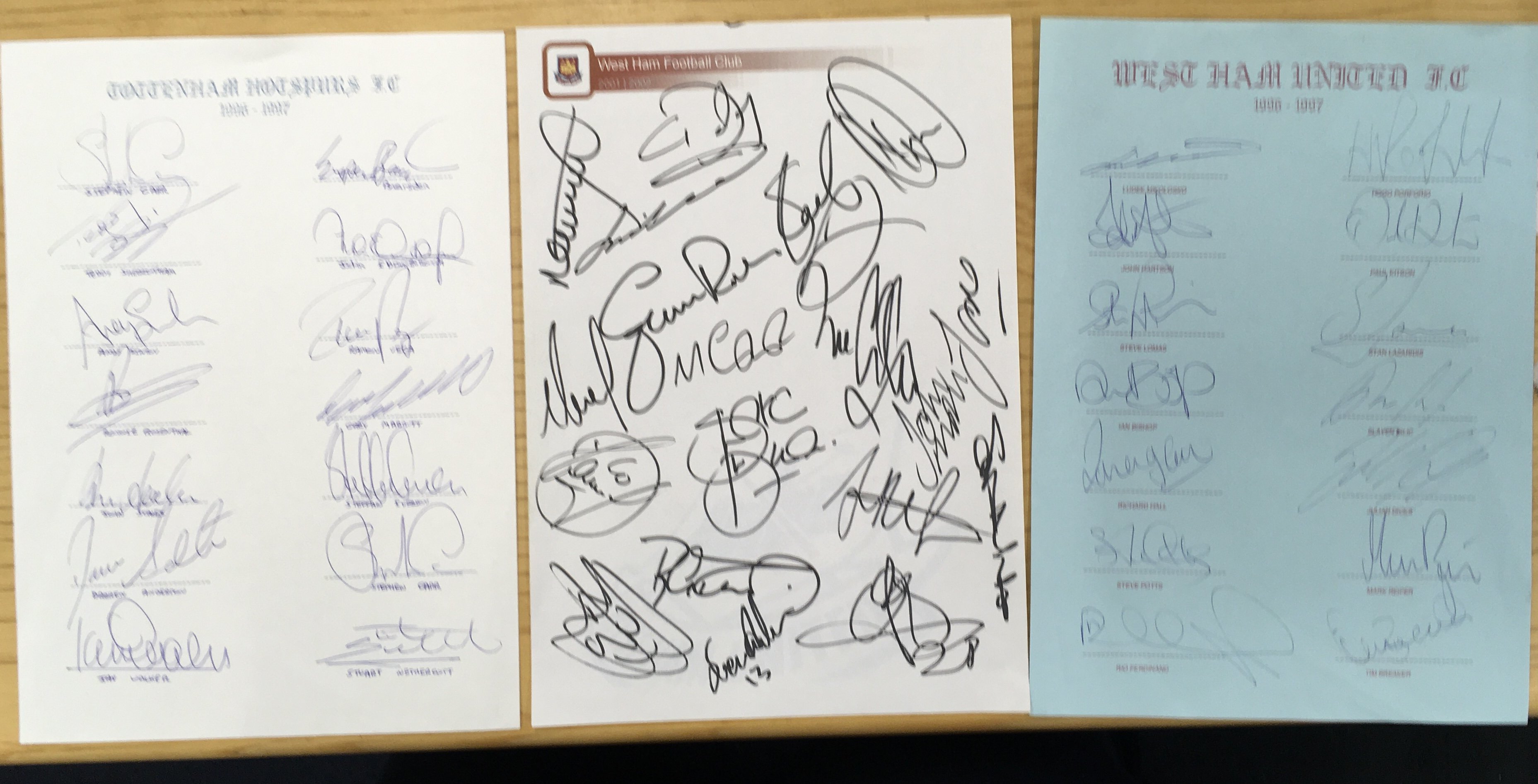 West Ham + Tottenham Football Autographs: A4 sheet from 96/97 with 14 autographs of Spurs players to one sheet and 14 West Ham to the other. C/W a further sheet of West Ham from 2001 - 2002.