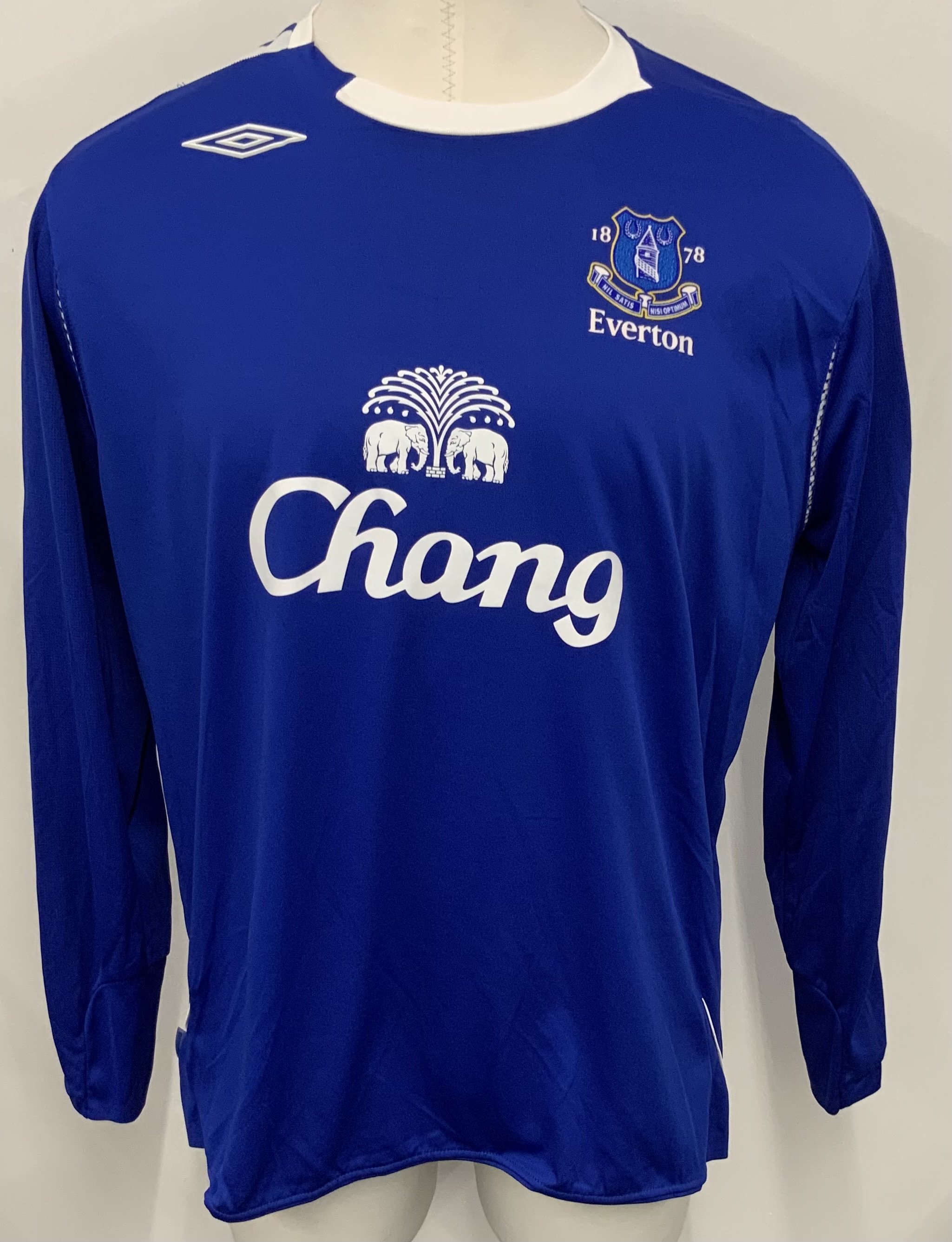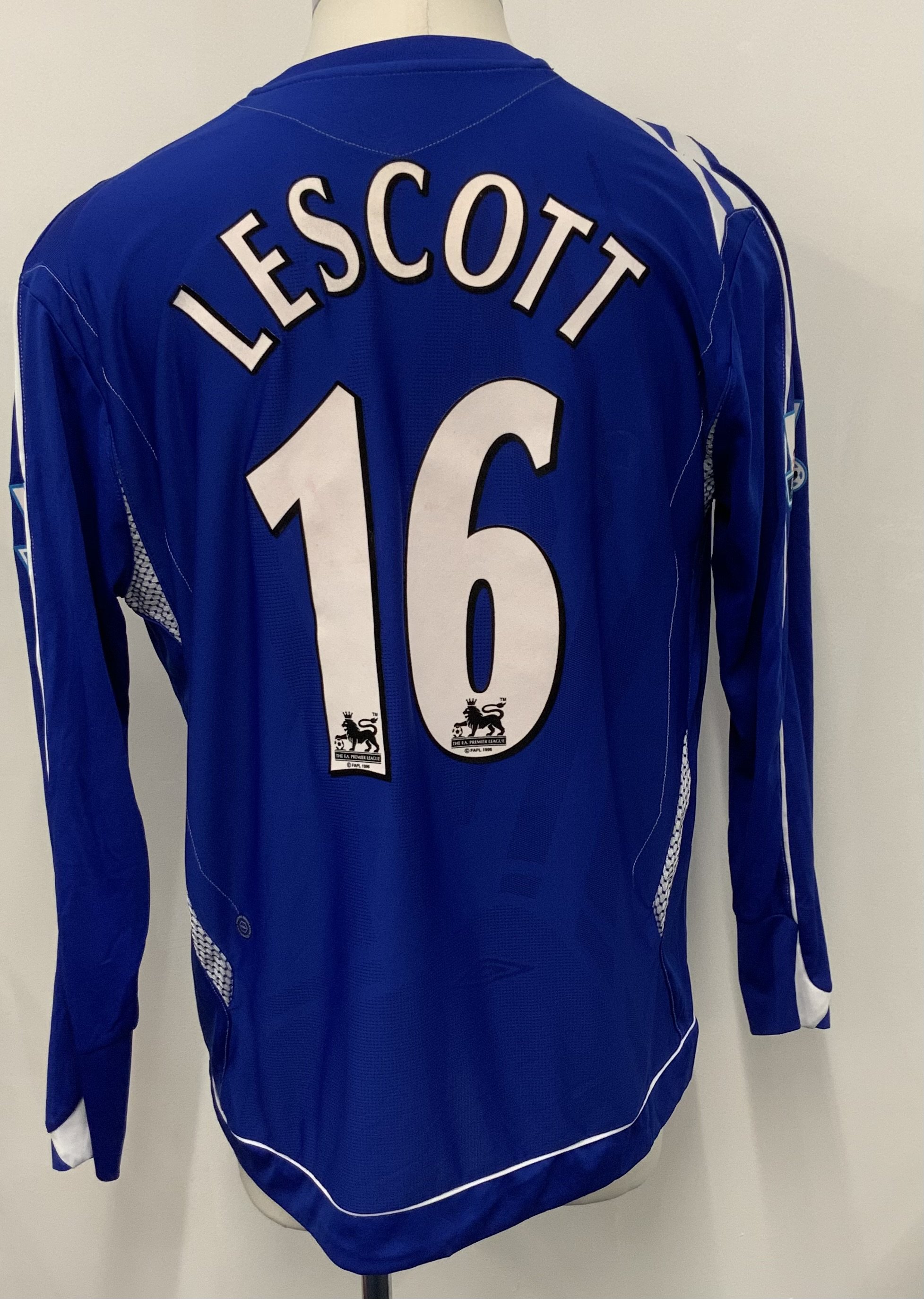 Lescott Everton 2006 - 2007 Match Worn Football Shirt: Blue long sleeve with Lescott number 16 to rear. Premier League badging to sleeves. Swapped with Bobby Zamora. Unwashed.