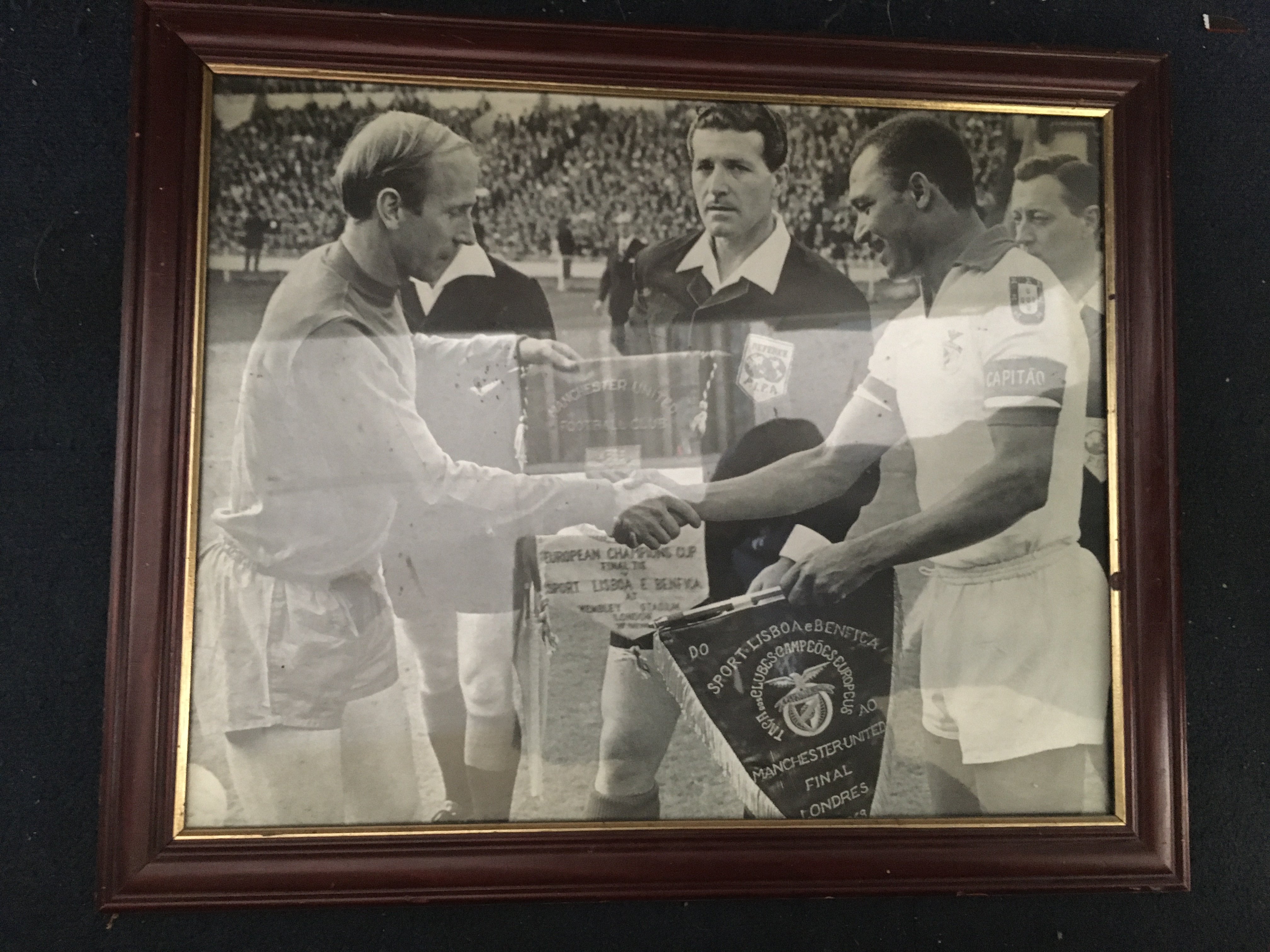 1968 European Cup Final Manchester United v Benfica Photo: Very large black and white framed photo of captains Charlton and Coluna shaking hands and exchanging pennants. Not for sending.