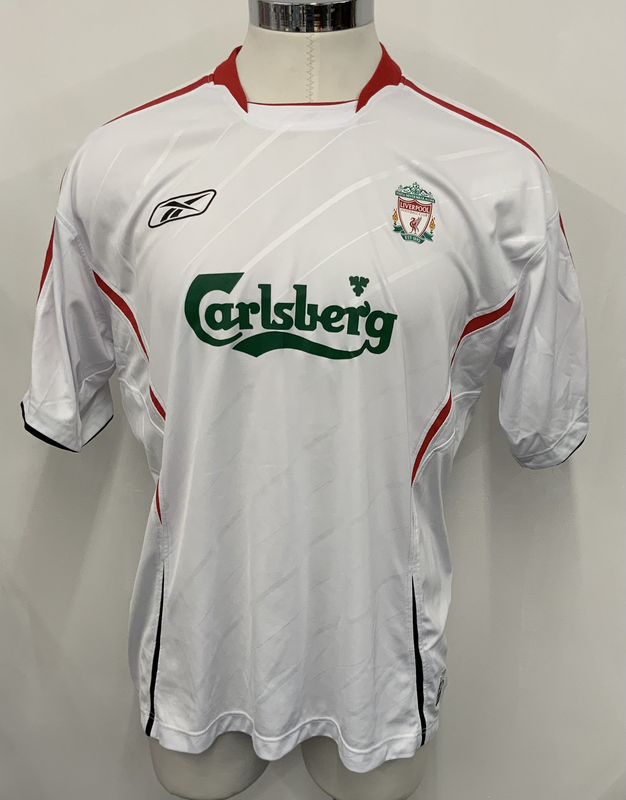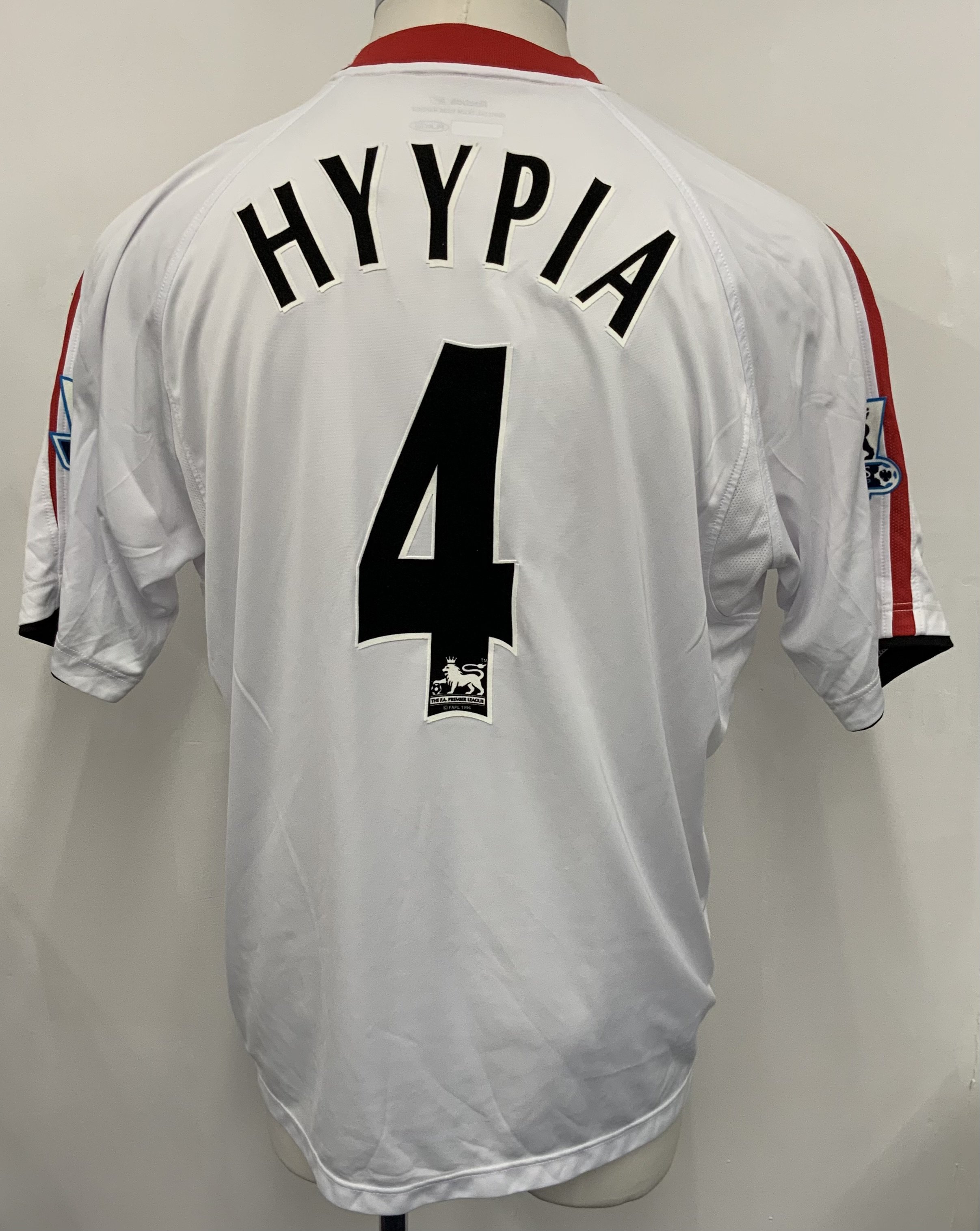 Hyypia Liverpool 2005 - 2006 Match Worn Football Shirt: White short sleeve with Hyypia number 4 to rear. Premier League badging to sleeves. Swapped with Bobby Zamora. Unwashed.