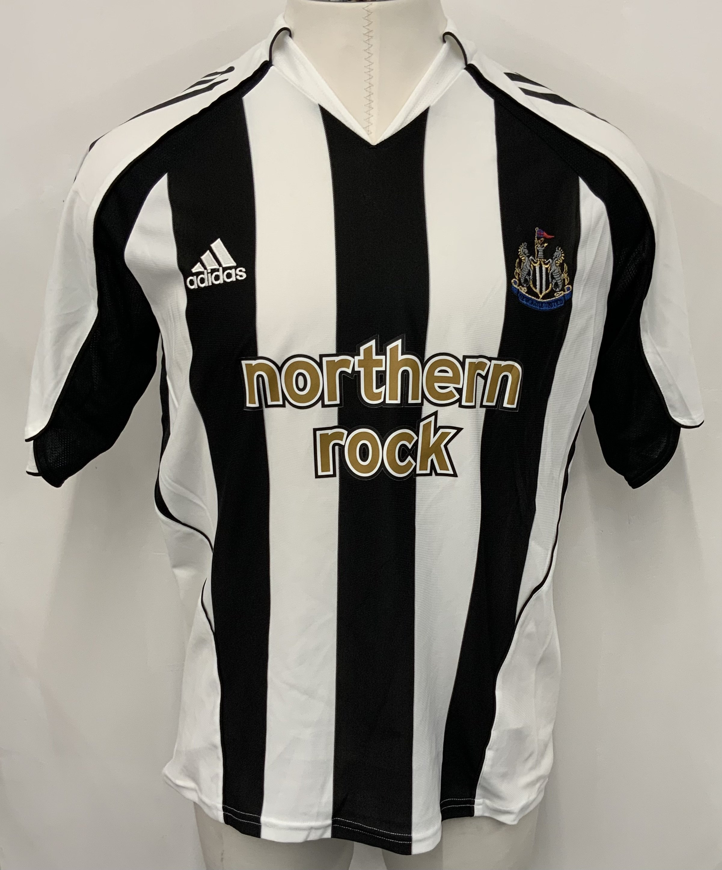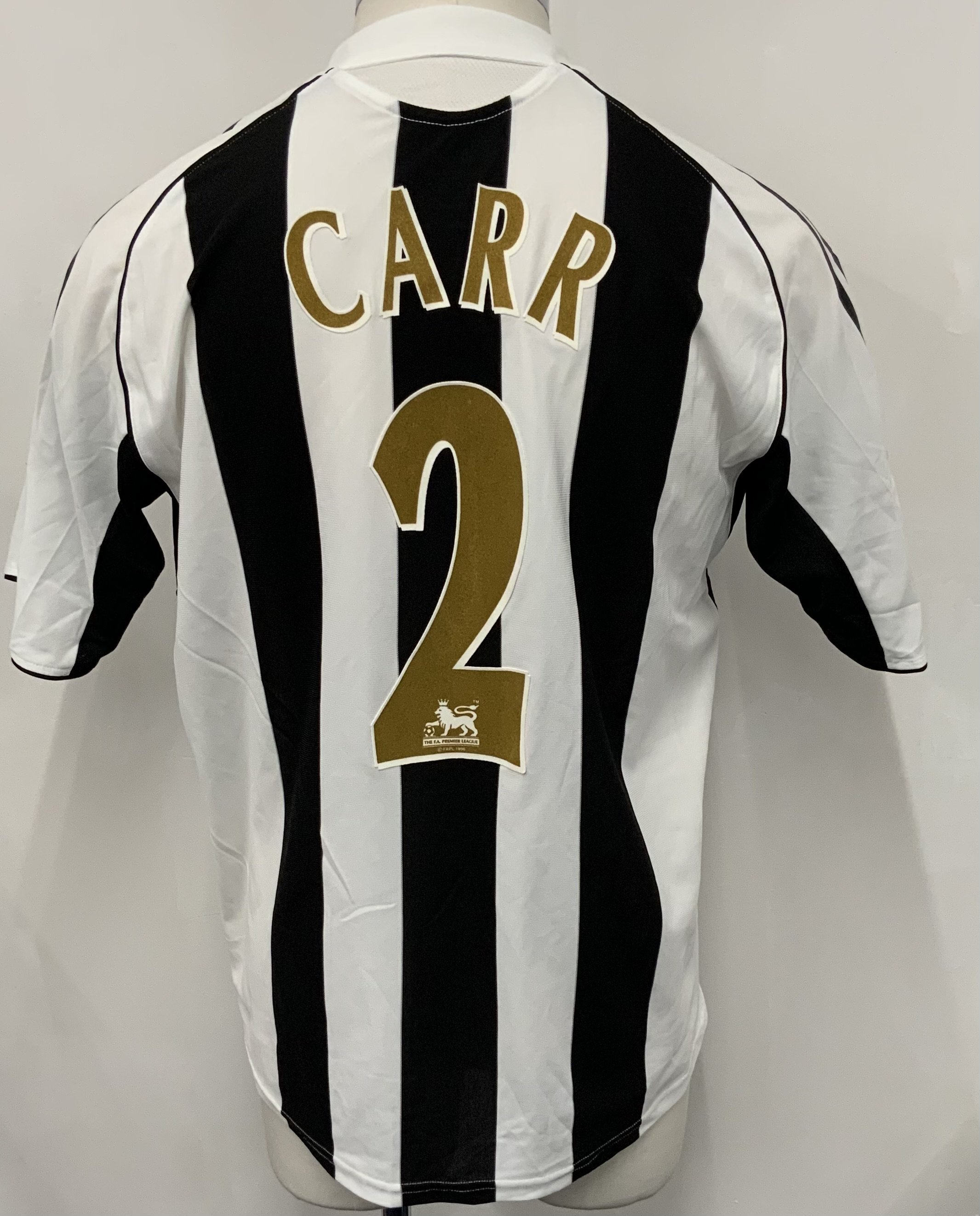 Carr Newcastle 2006 - 2007 Match Worn Football Shirt: Black and white short sleeve with Carr number 2 to rear. Premier League badging to sleeves. Swapped with Bobby Zamora. Unwashed.