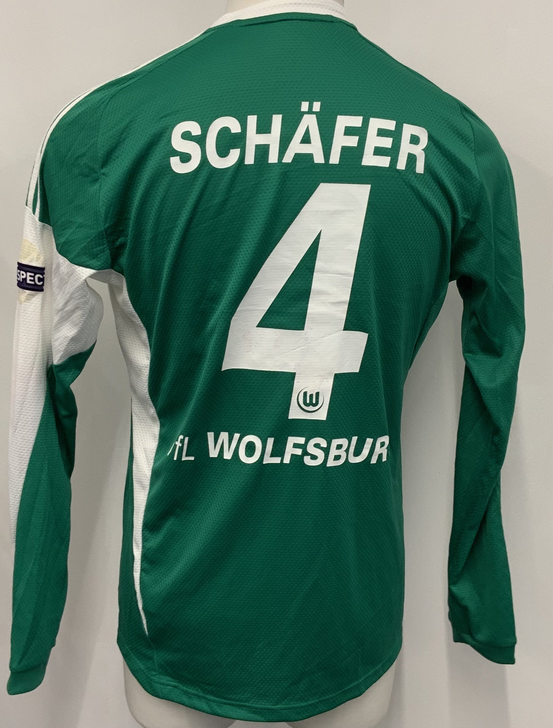 Schafer Wolfsburg 2009 - 2010 Match Worn Football Shirt: Green long sleeve with Schafer number 4 to rear. Europa League badging to sleeves. Worn in the Quarter Final match on 1 April 2010 at Craven Cottage. Swapped with Bobby Zamora who scored in the match. Unwashed.