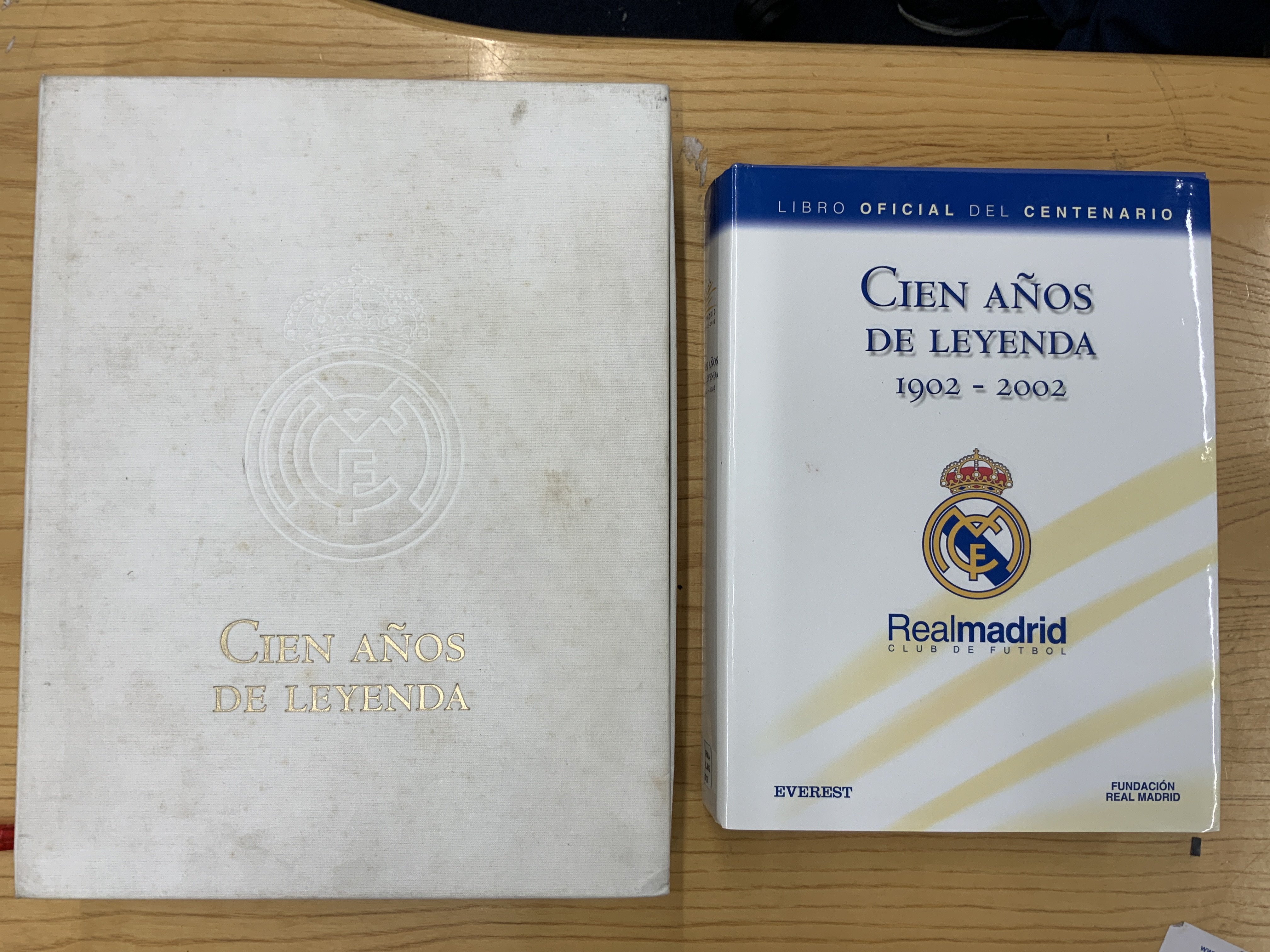 Real Madrid Cased Rare Centenary Football Book: Cine Amos De Leyenda 1902 - 2002 is a very heavy book in embossed white case which has handling marks. Book itself is excellent and has nearly 600 pages.