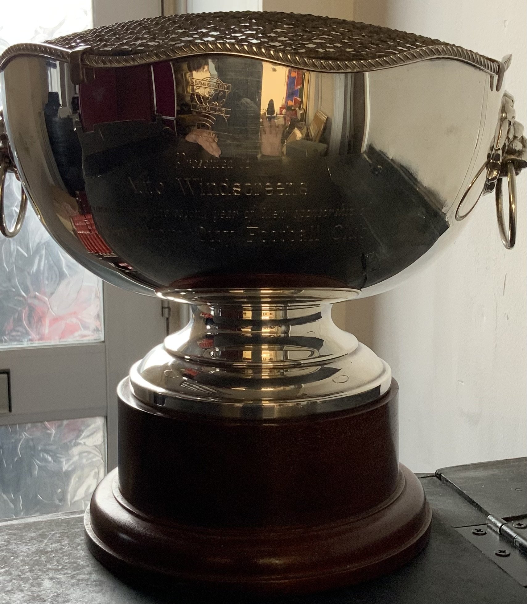 Birmingham City Auto Windscreens Sponsorship Gift From Club: Silver coloured on wooden base quality rose bowl with mesh cover to top. Engraved with Birmingham City badge to commemorate the second year of sponsorship with Auto Windscreens who were presented with this by Birmingham City.