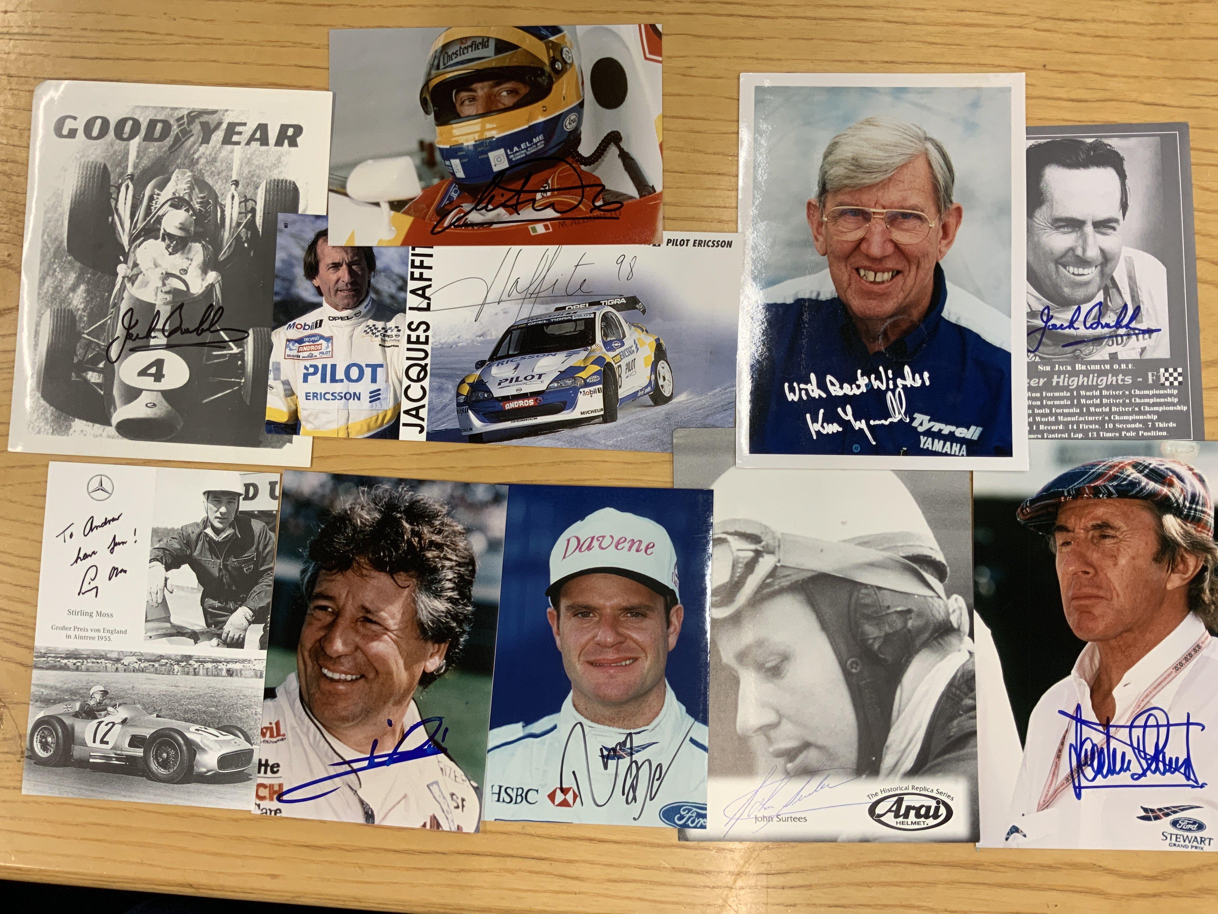 Signed Formula One Photos: Mainly postcard size photos hand signed without dedication. Includes Surtees Moss Brabham Schumacher Tyrrell Laffite and others. (10)