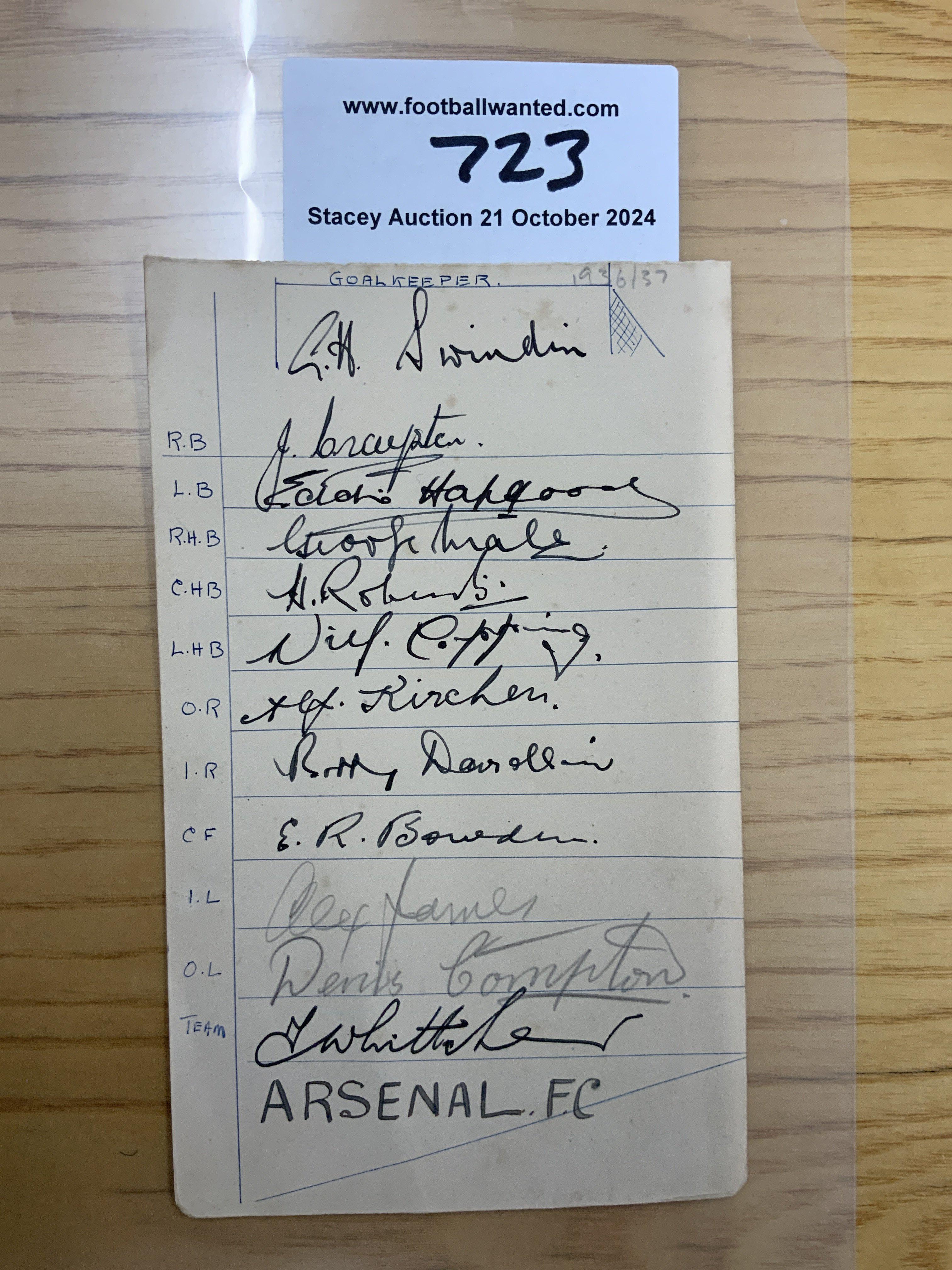 Arsenal 1936 - 1937 Signed Football Autograph Page: 12 autographs to include Whittaker D Compton James Swindin Hapgood Roberts Male Bowden Davidson and Copping.