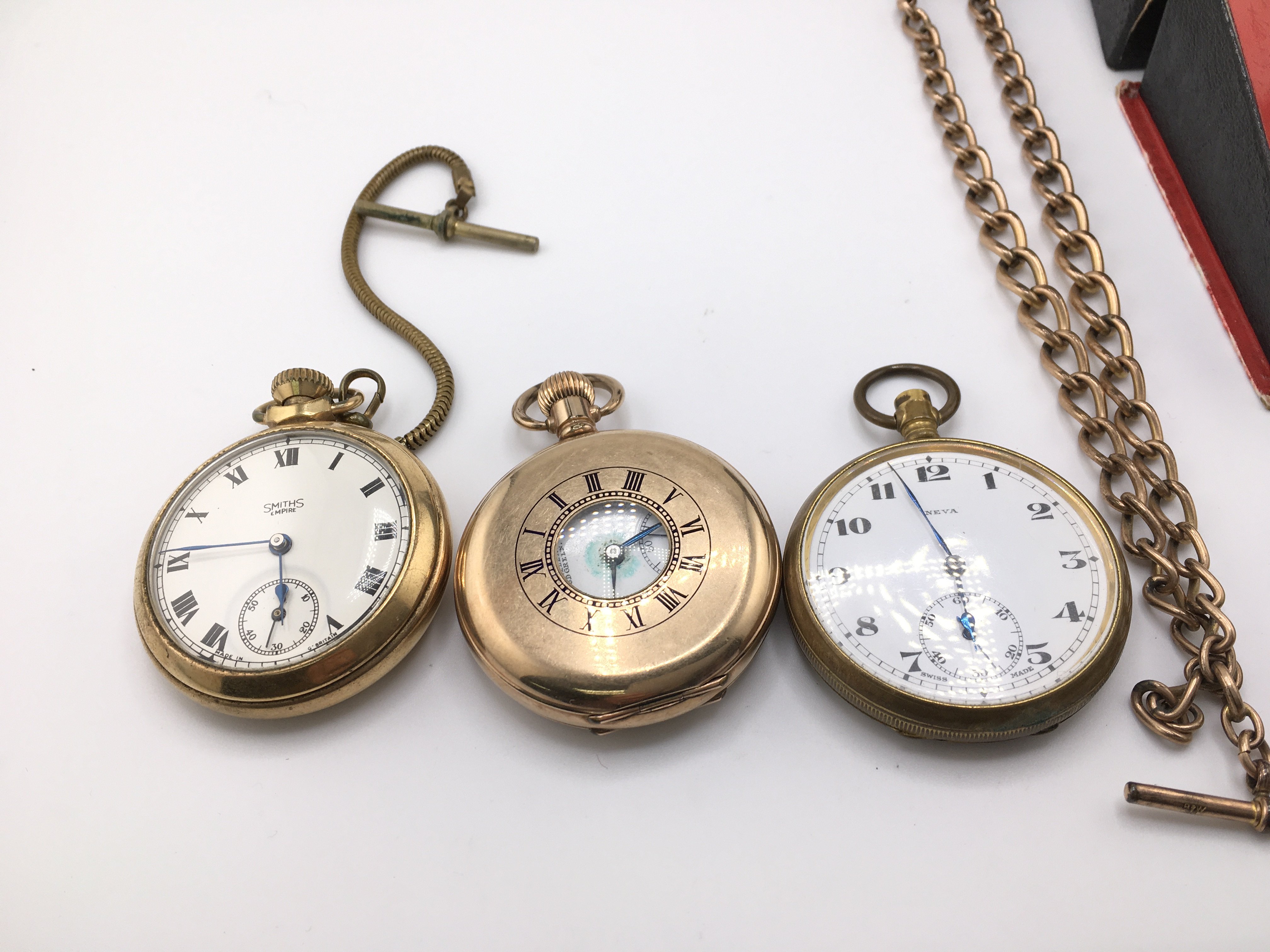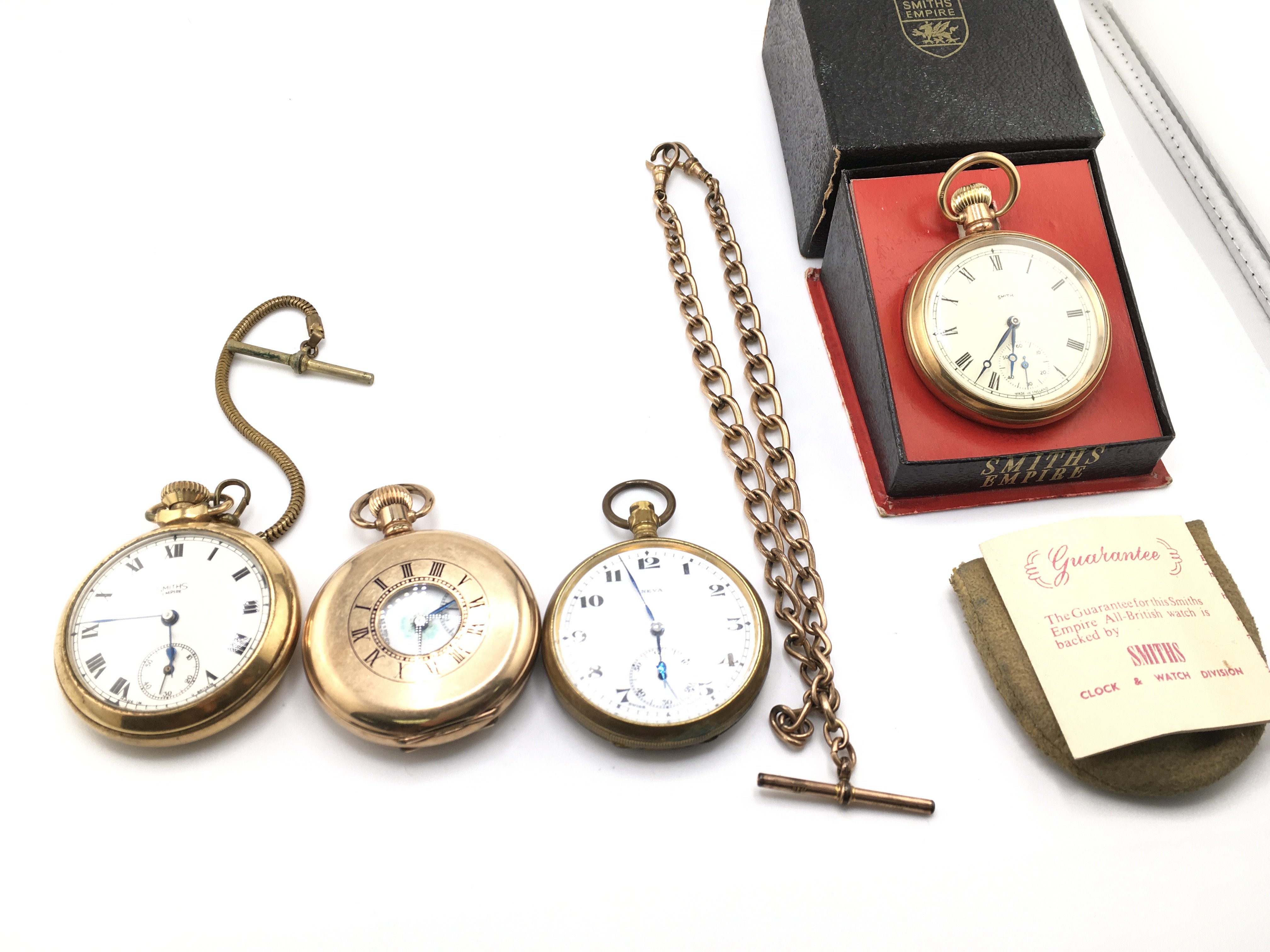 A collection of four pocket watches and a rolled gold chain. Postage B