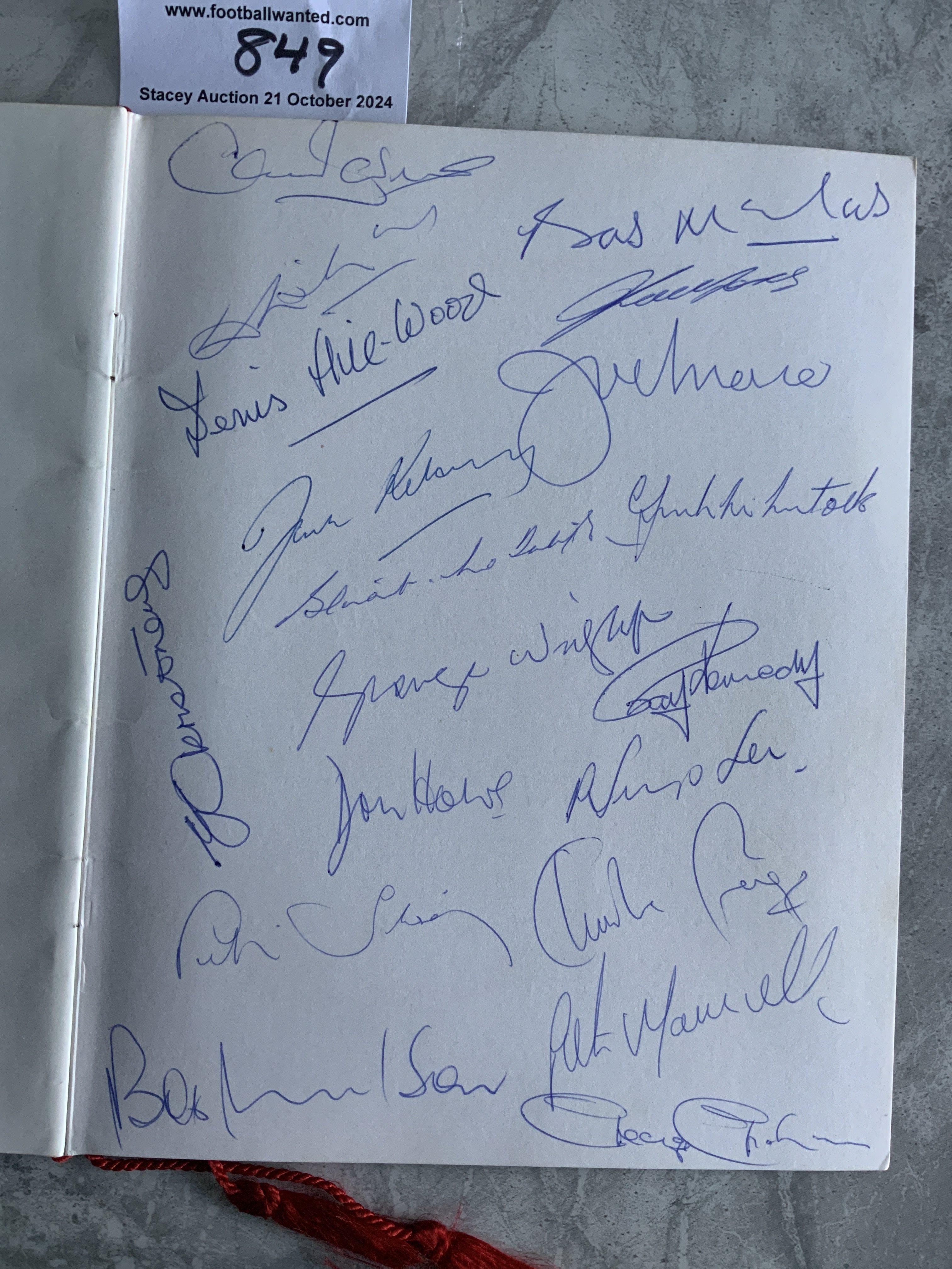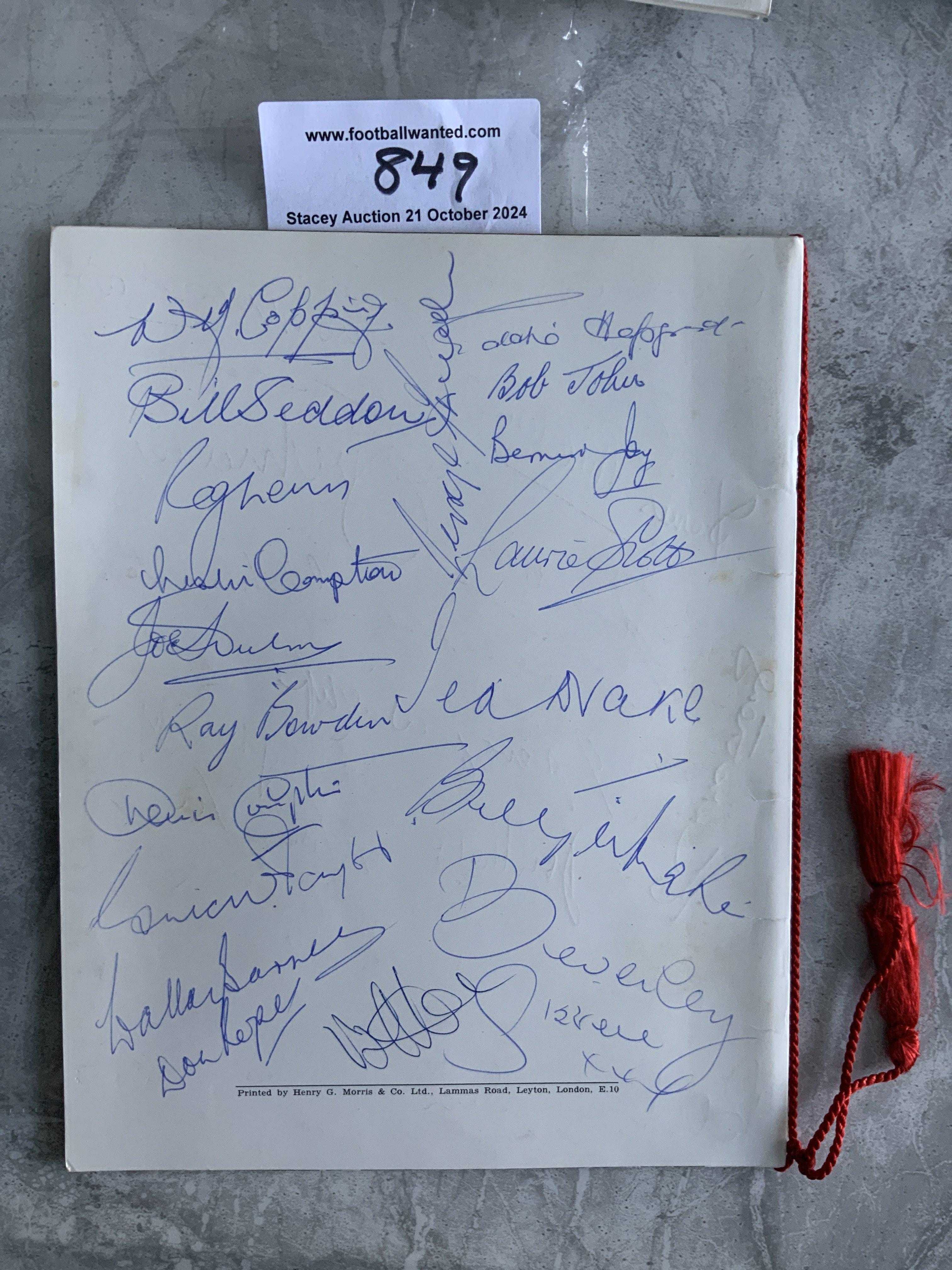 Arsenal 1970 - 1971 Double Team Signed FA Cup Final Menu: Superb item with red tassels the evening of the celebrations at the Park Lane Hotel. Inside and outside were left blank for autographs and this menu has many of them. Inside page has 19 of the double winning squad and chairman etc. The back page has 19 signatures which are mainly old players including Billy Wight and his Beverley Sisters wife, Drake Roper Barnes Compton brothers Seddon Copping Hapgood Joy Lewis and many more. C/W separate list of guests. (2)