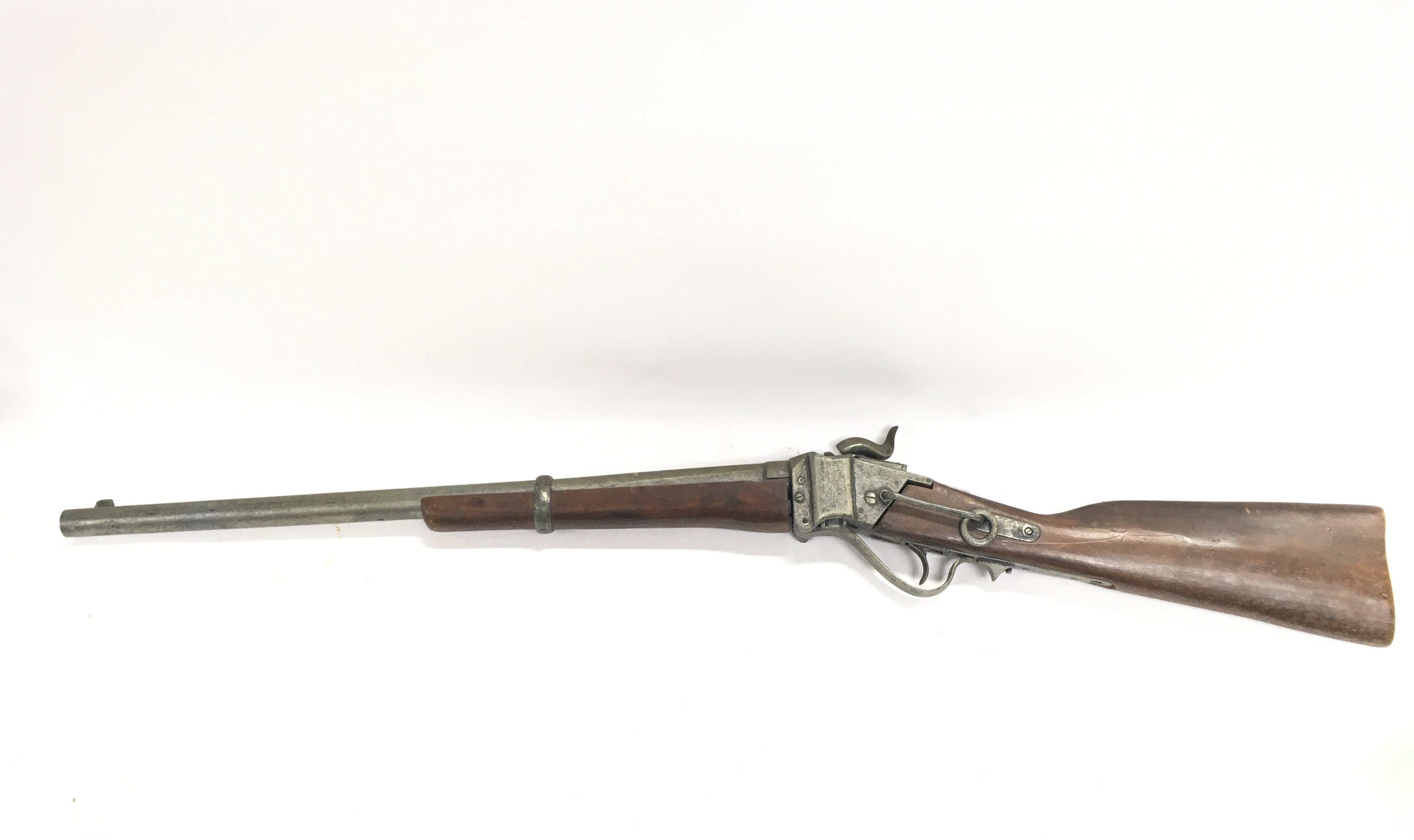 A vintage wooden and metal full sIe retrospective inert copy of a R S Lawrence patent 1859 sharps rifle. 95cm in length. This lot cannot be posted