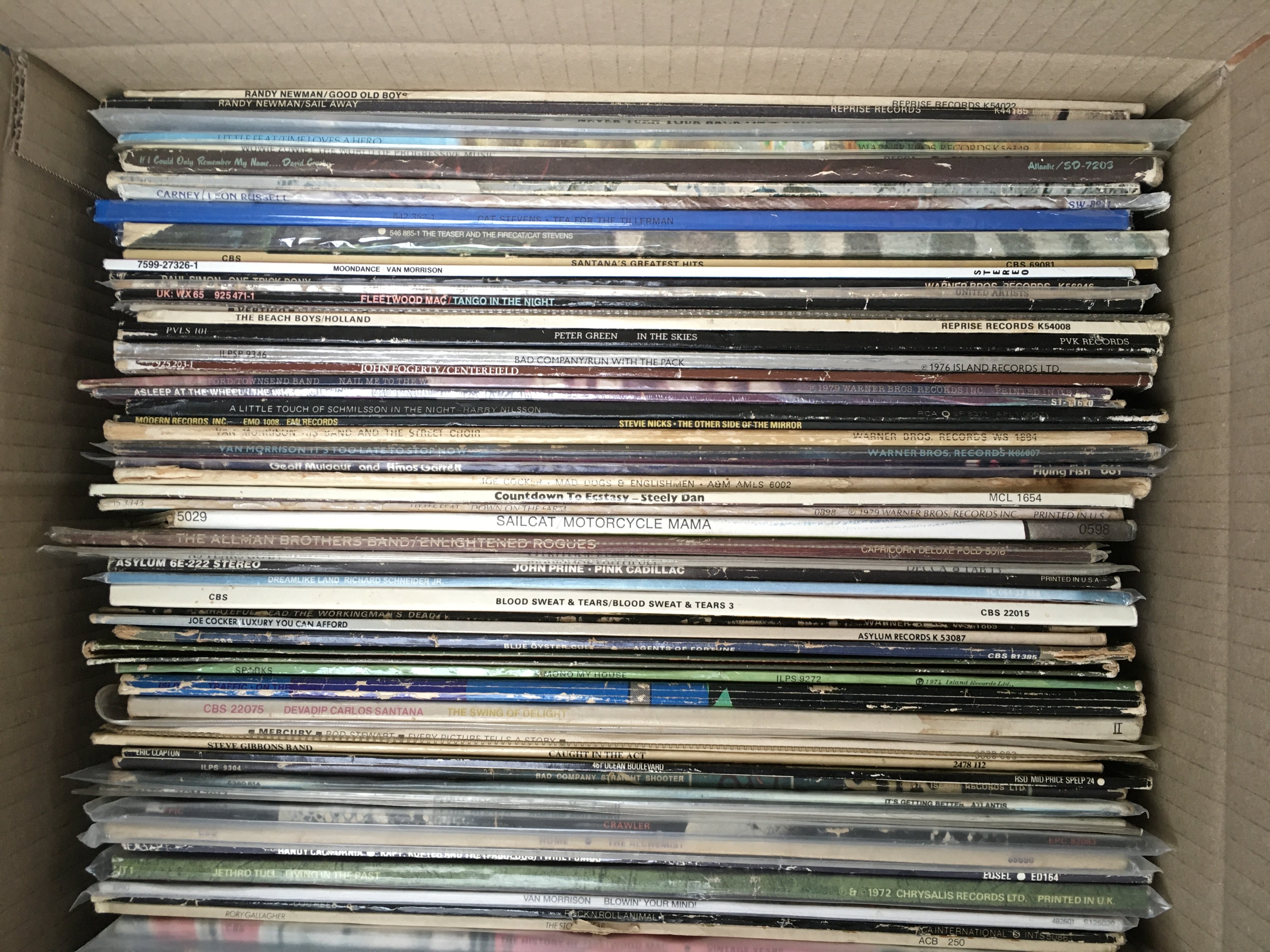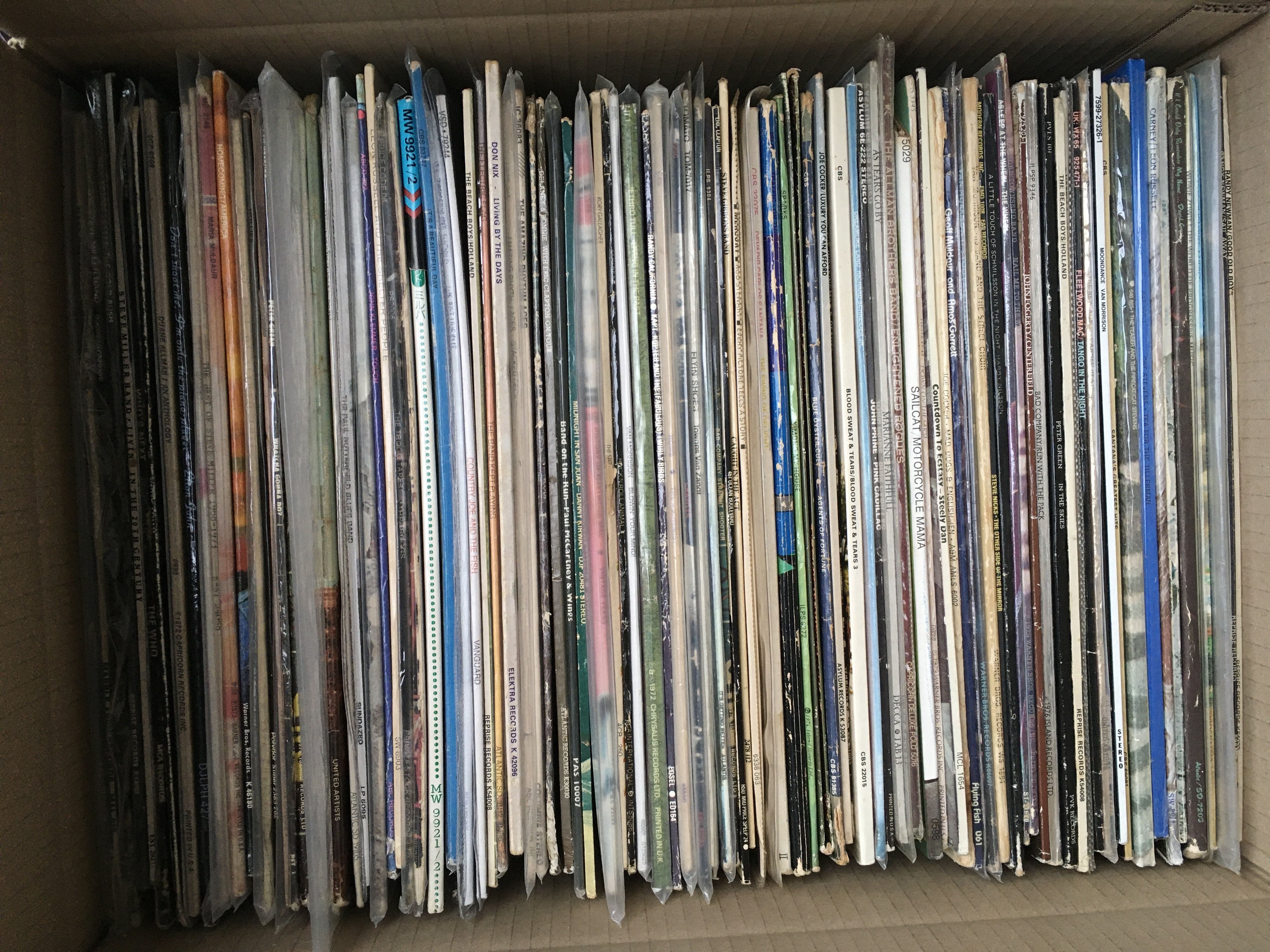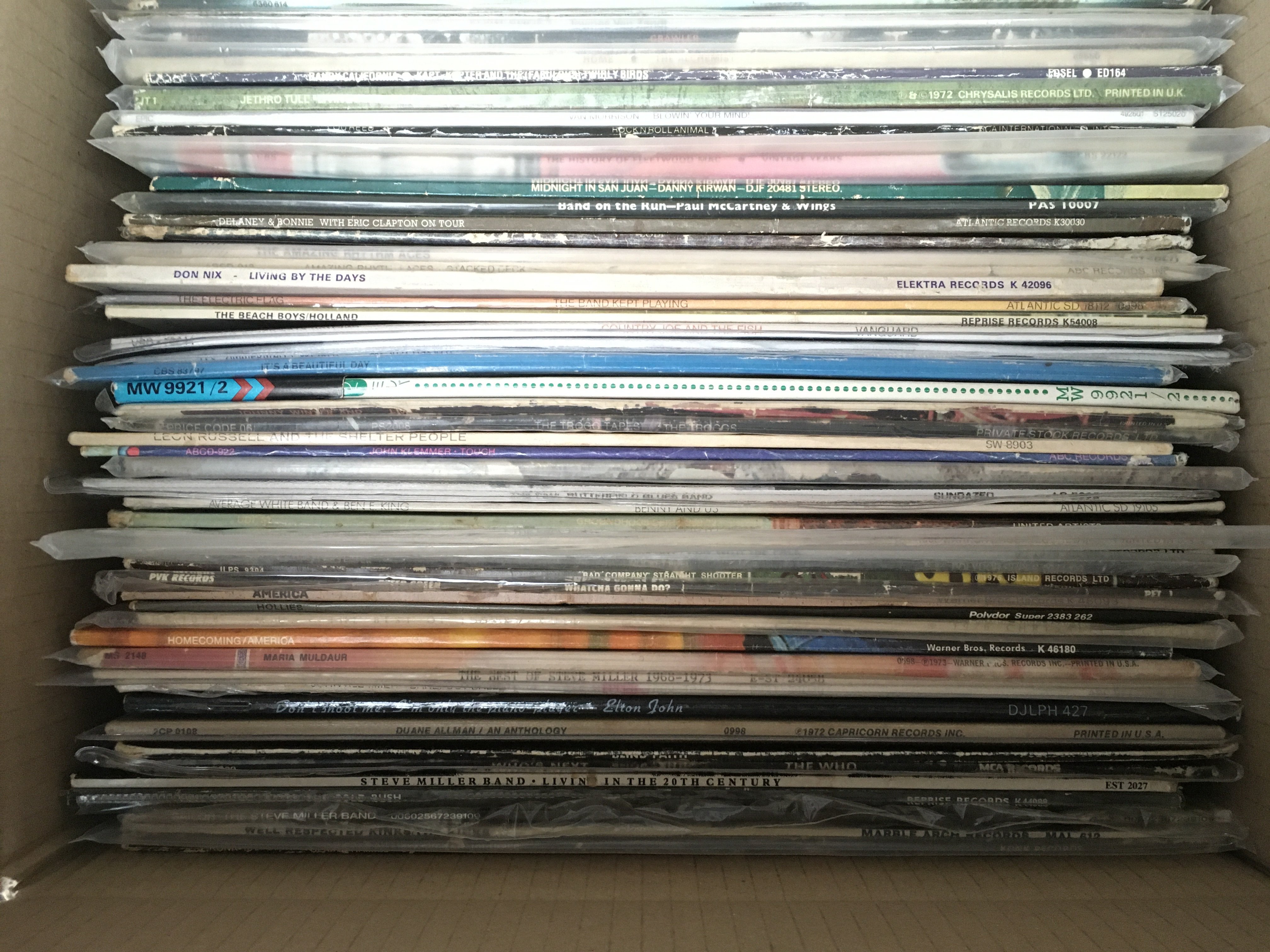 A box of 1970s rock LPs by various artists including Country Joe & The Fish, Bad Company, Sparks and many more.