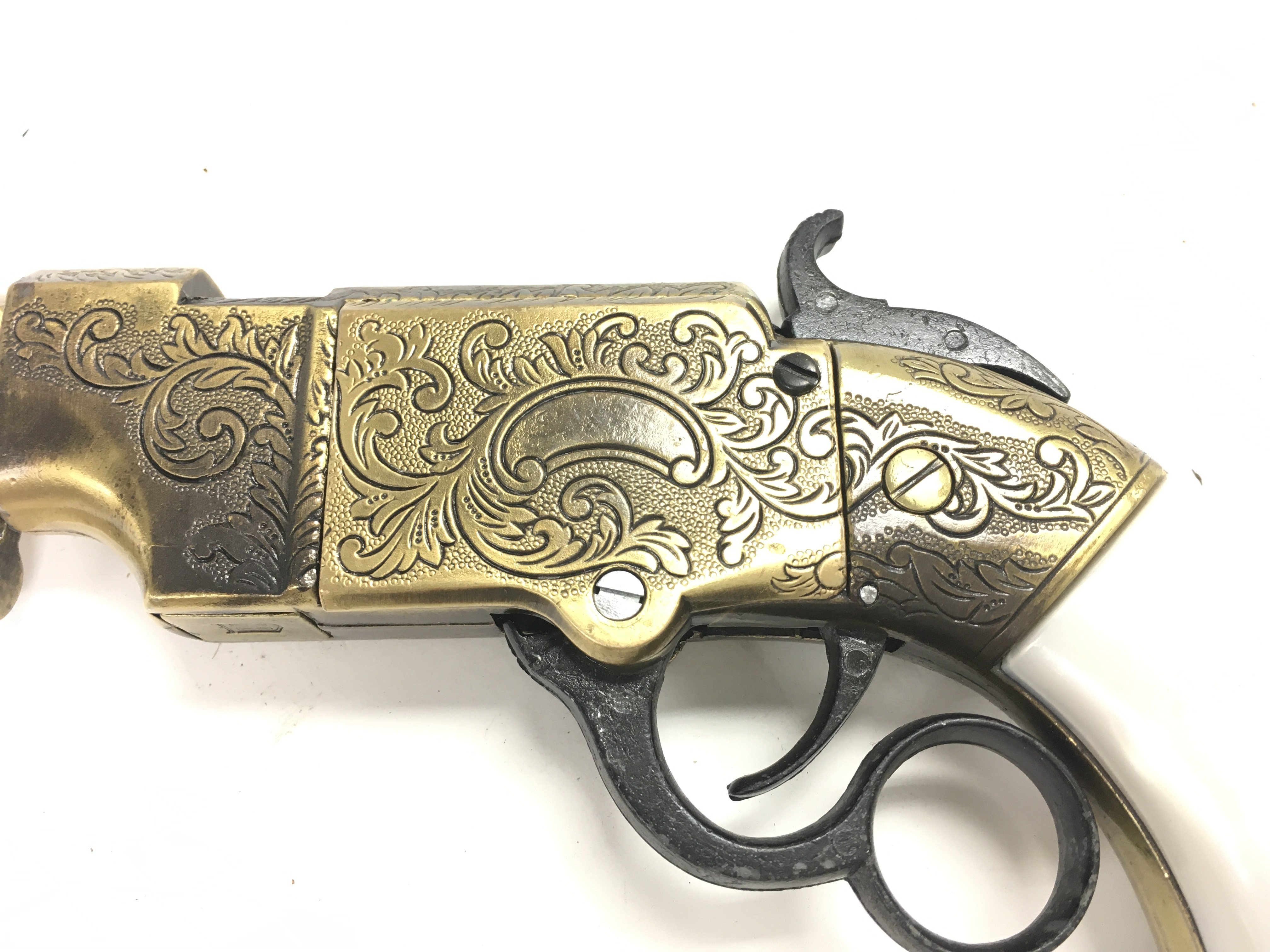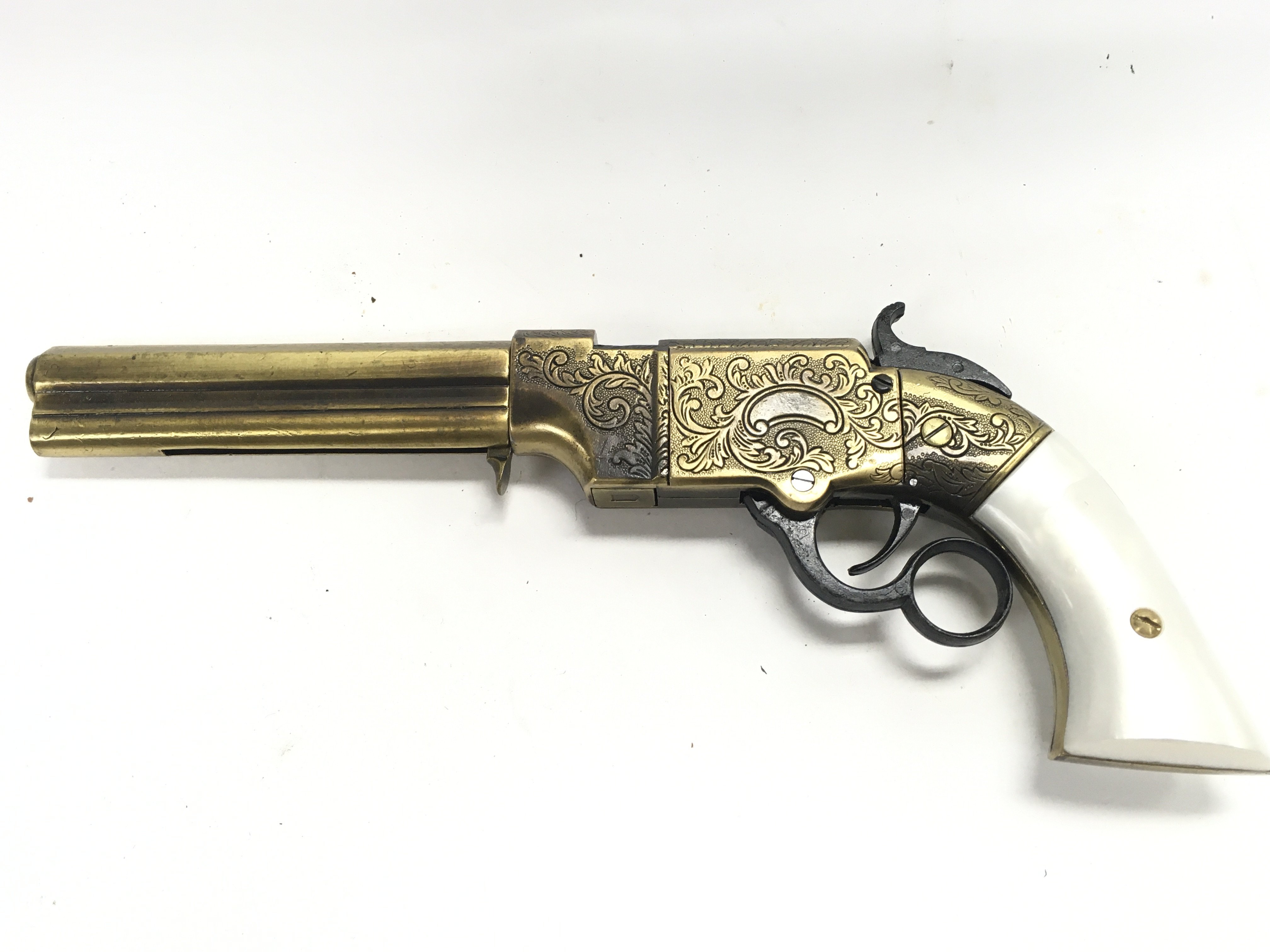 A replica inert working action bras and metal Western Revolver Volcanic model, with a mother of pearl handgrip. 33cm long. Postage category B