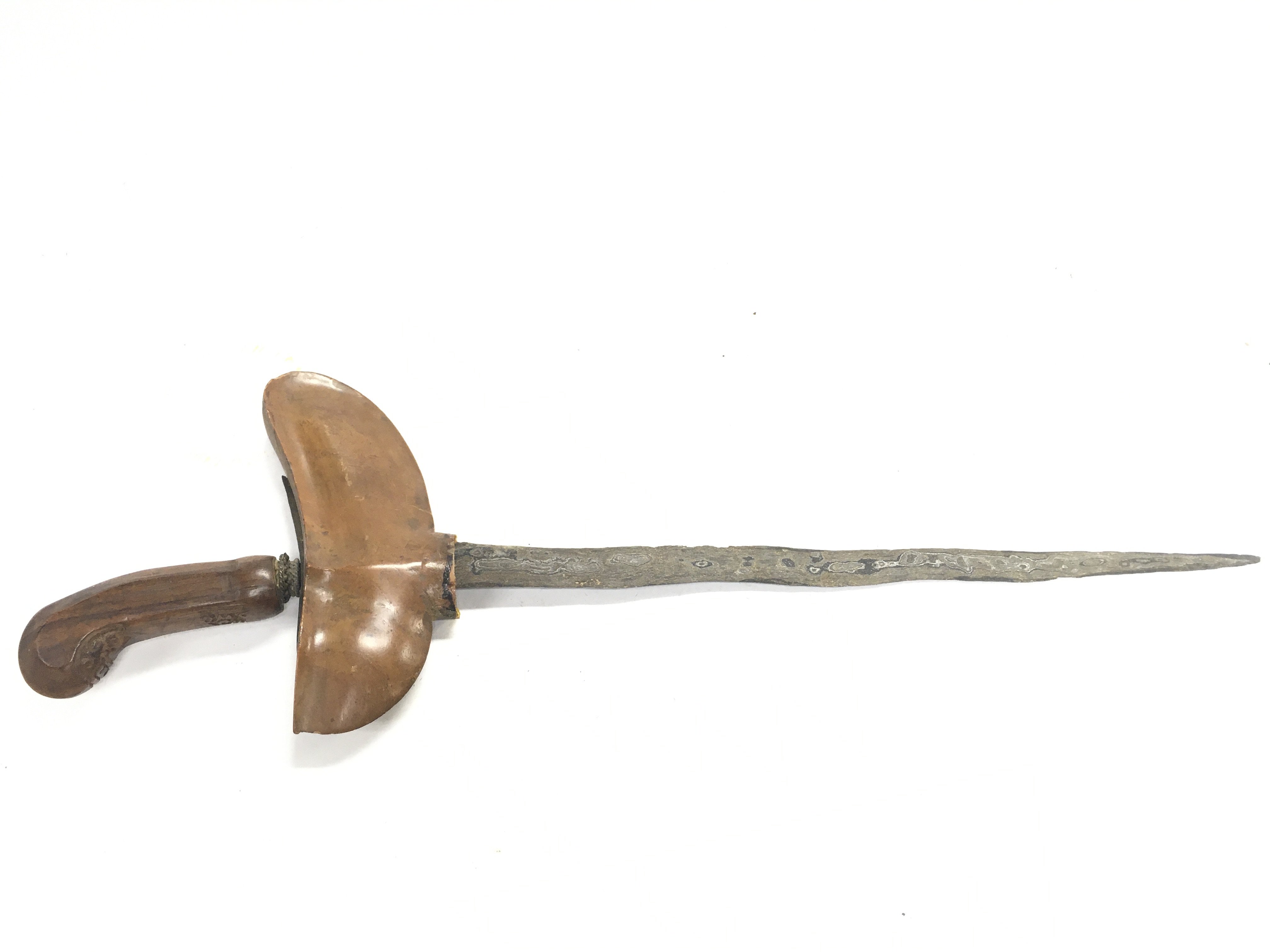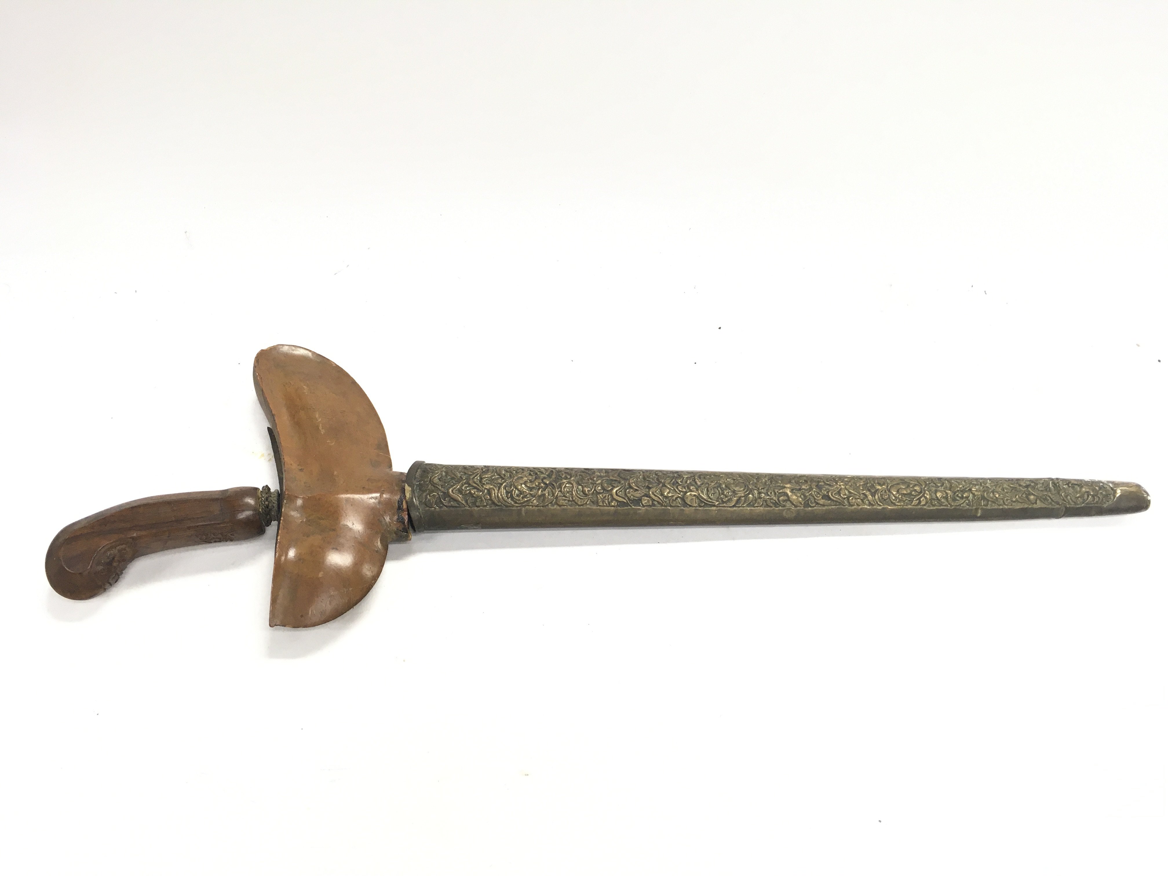 A vintage Indonesian Kris knife with wooden handle and brass scabbard. Wave blade, possibly Damascus steel. Blade length approximately 32cm Total length 50cm