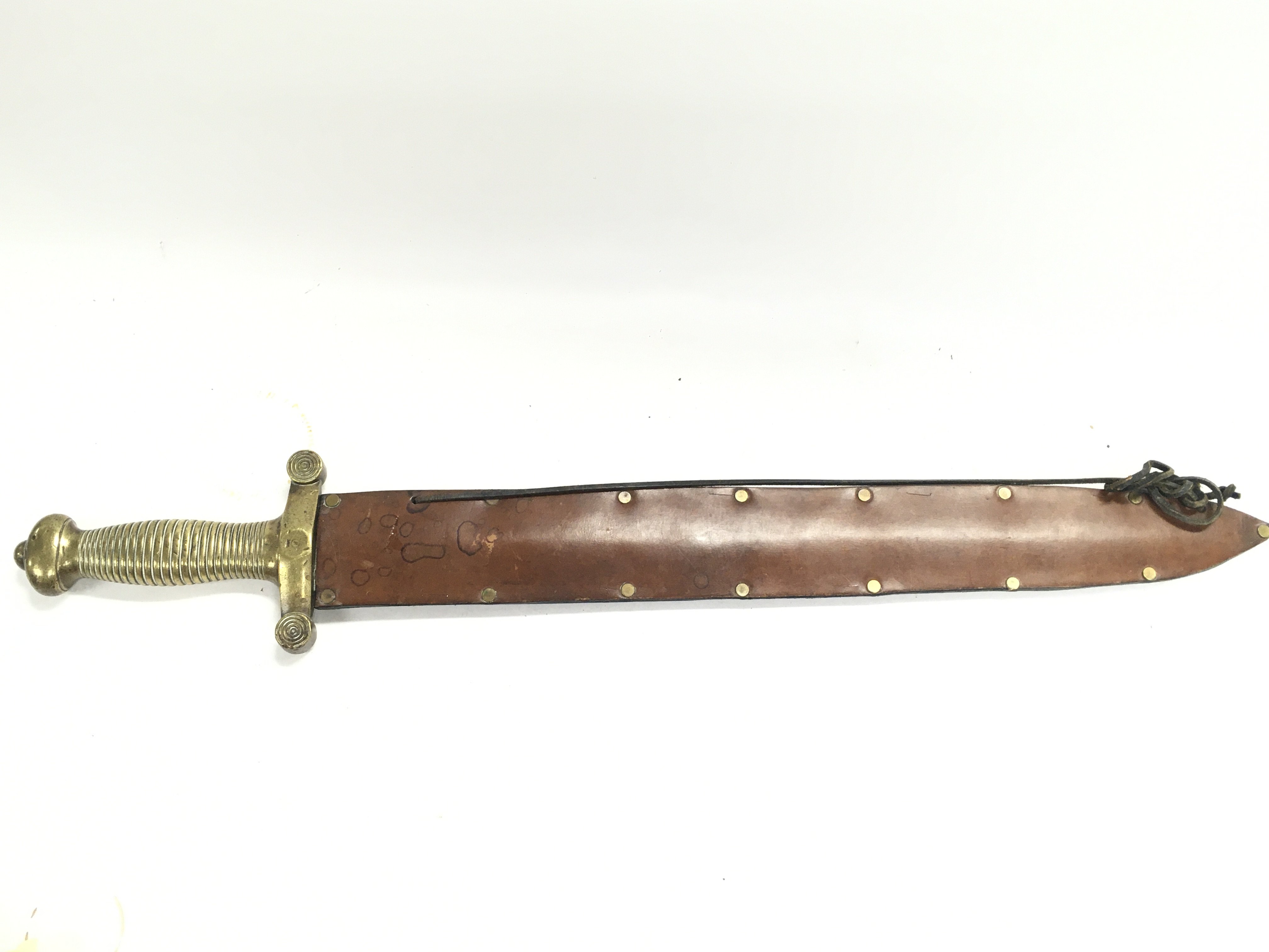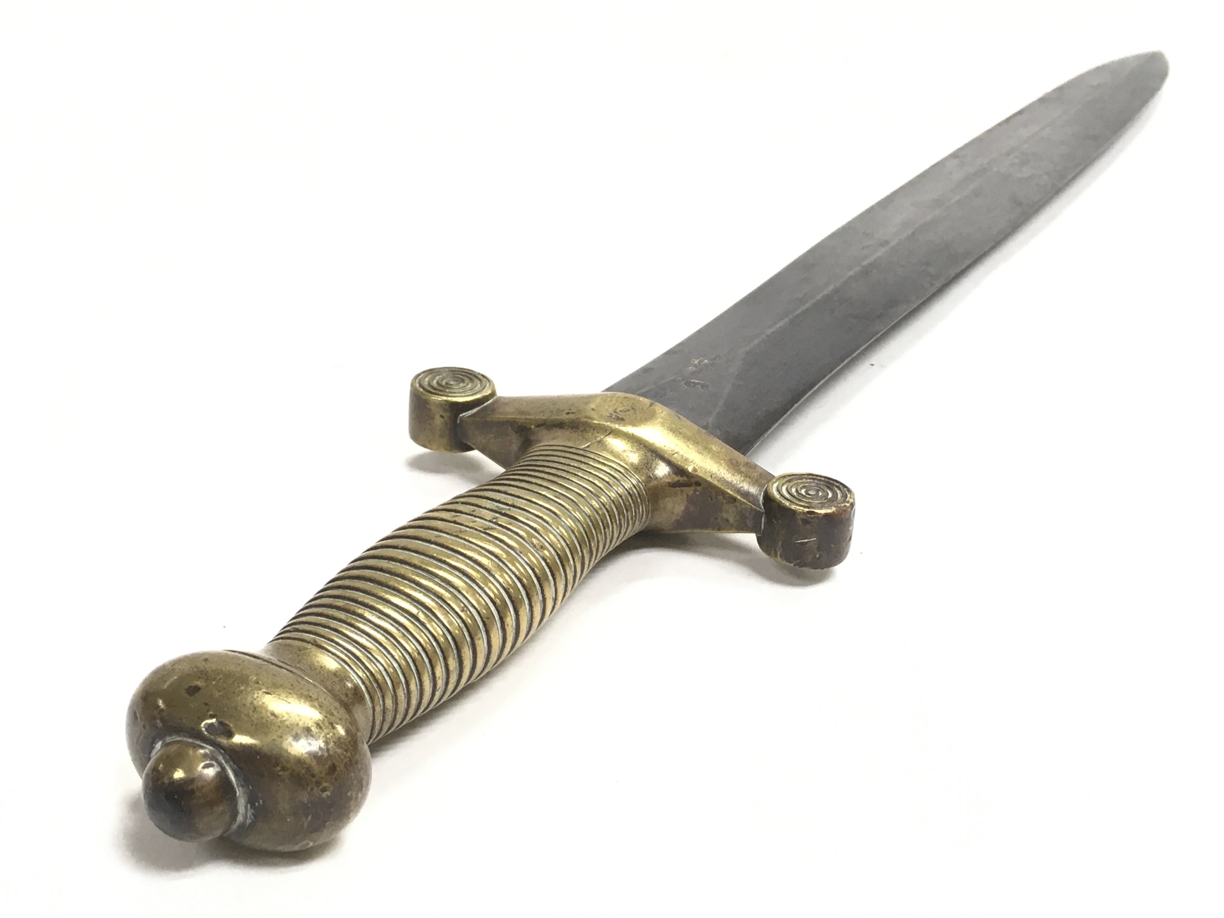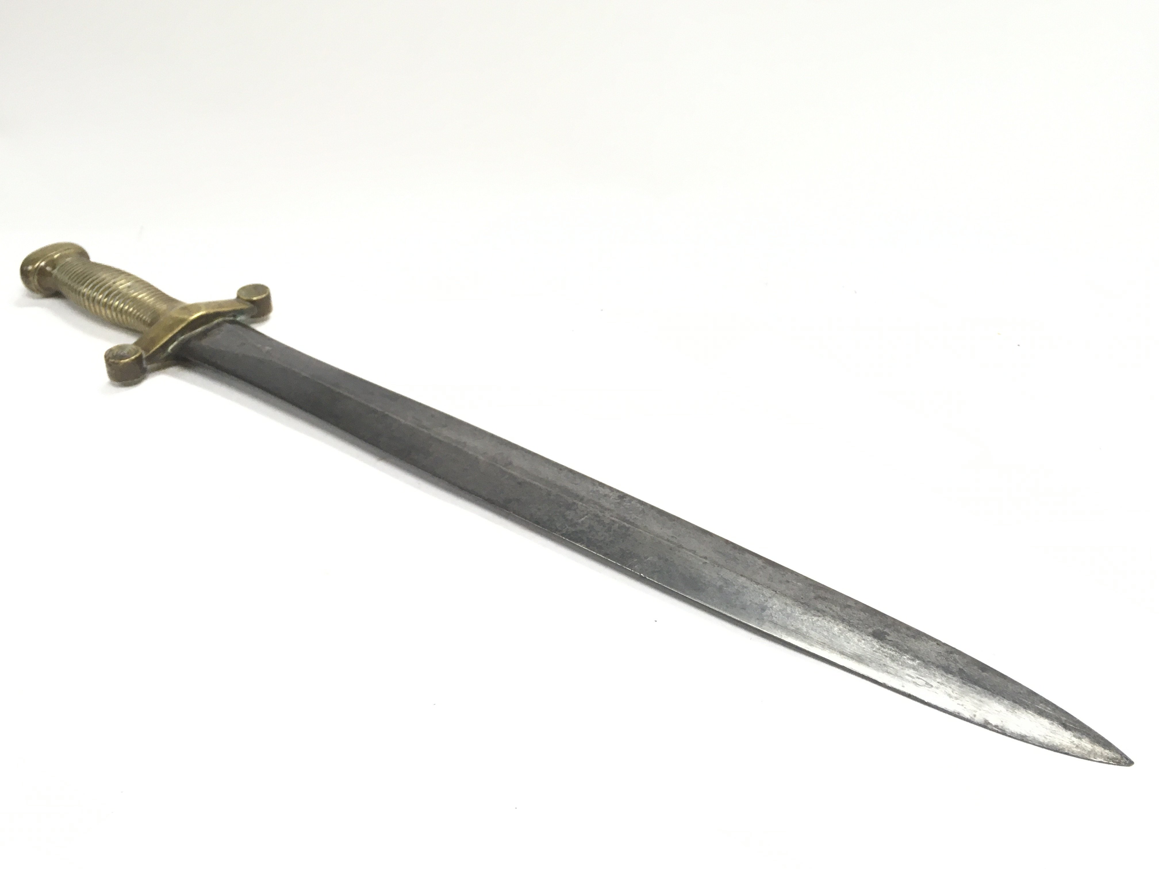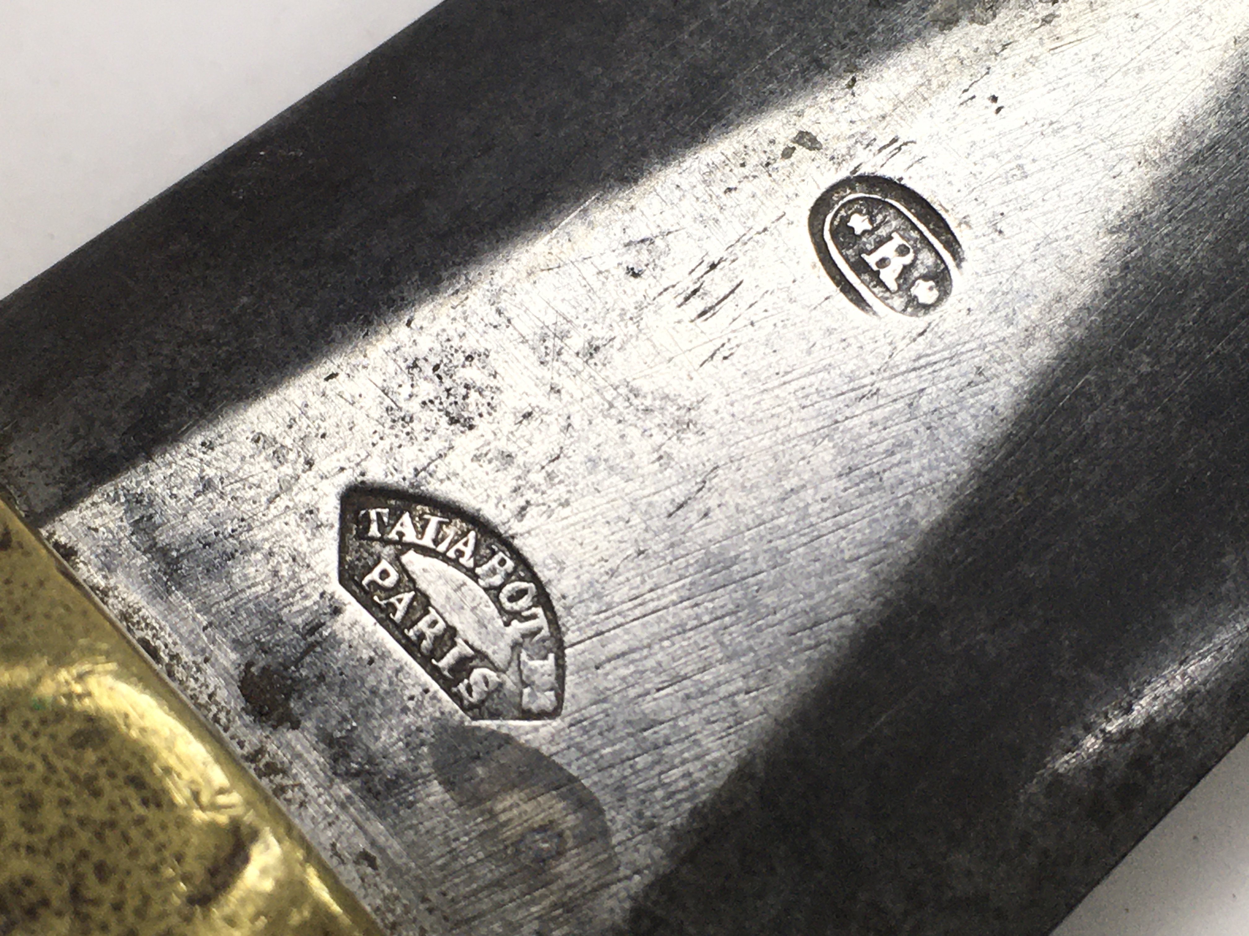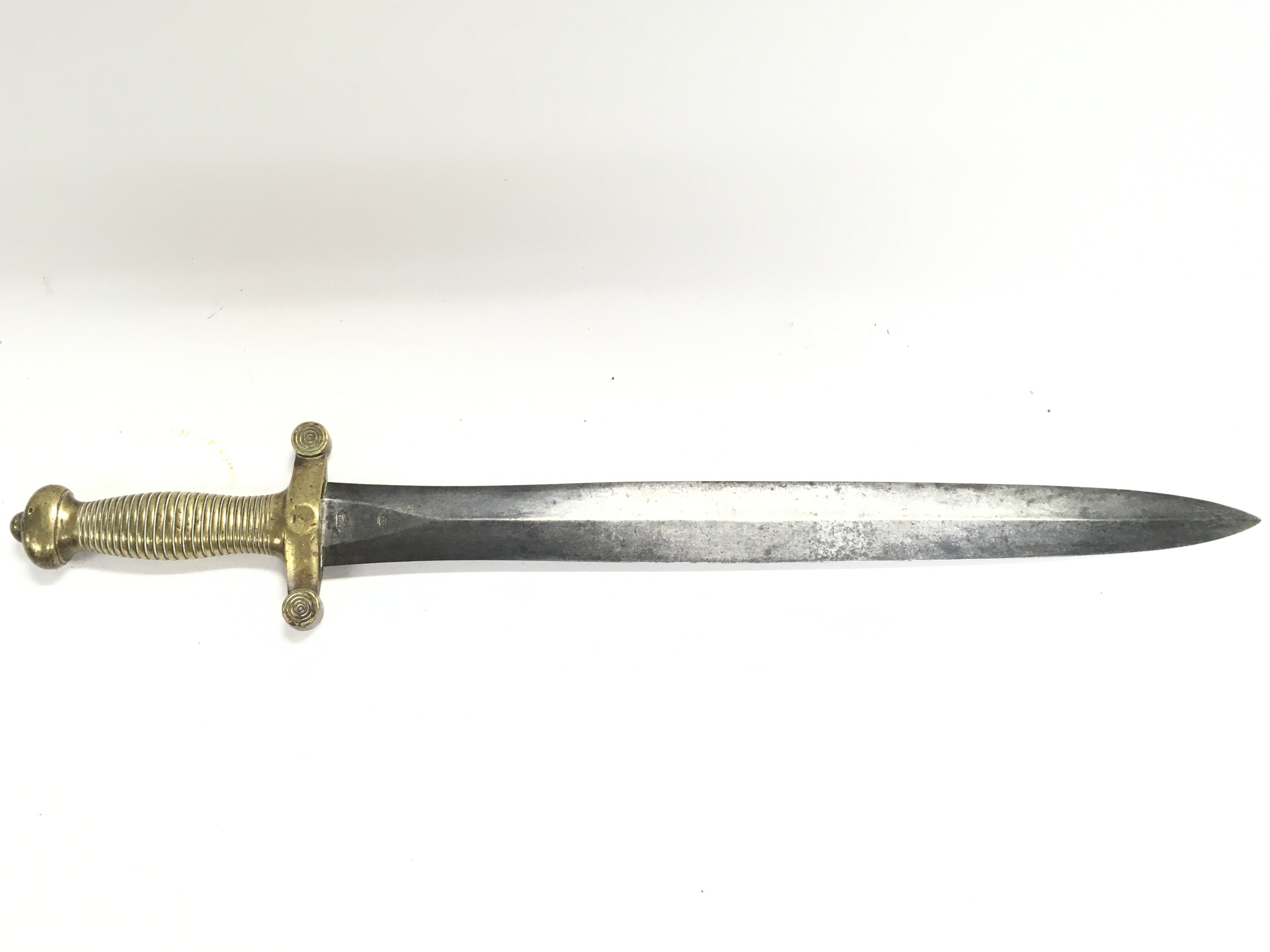 A 19th century French brass and steel 1831 pattern foot artillery short sword, made by Talabot Paris. Hilt stamped P.R. The sword was based on the Roman Gladius and also used by the navy. Blade 48.5cm long Approx. Total length 65cm. This lot cannot be posted