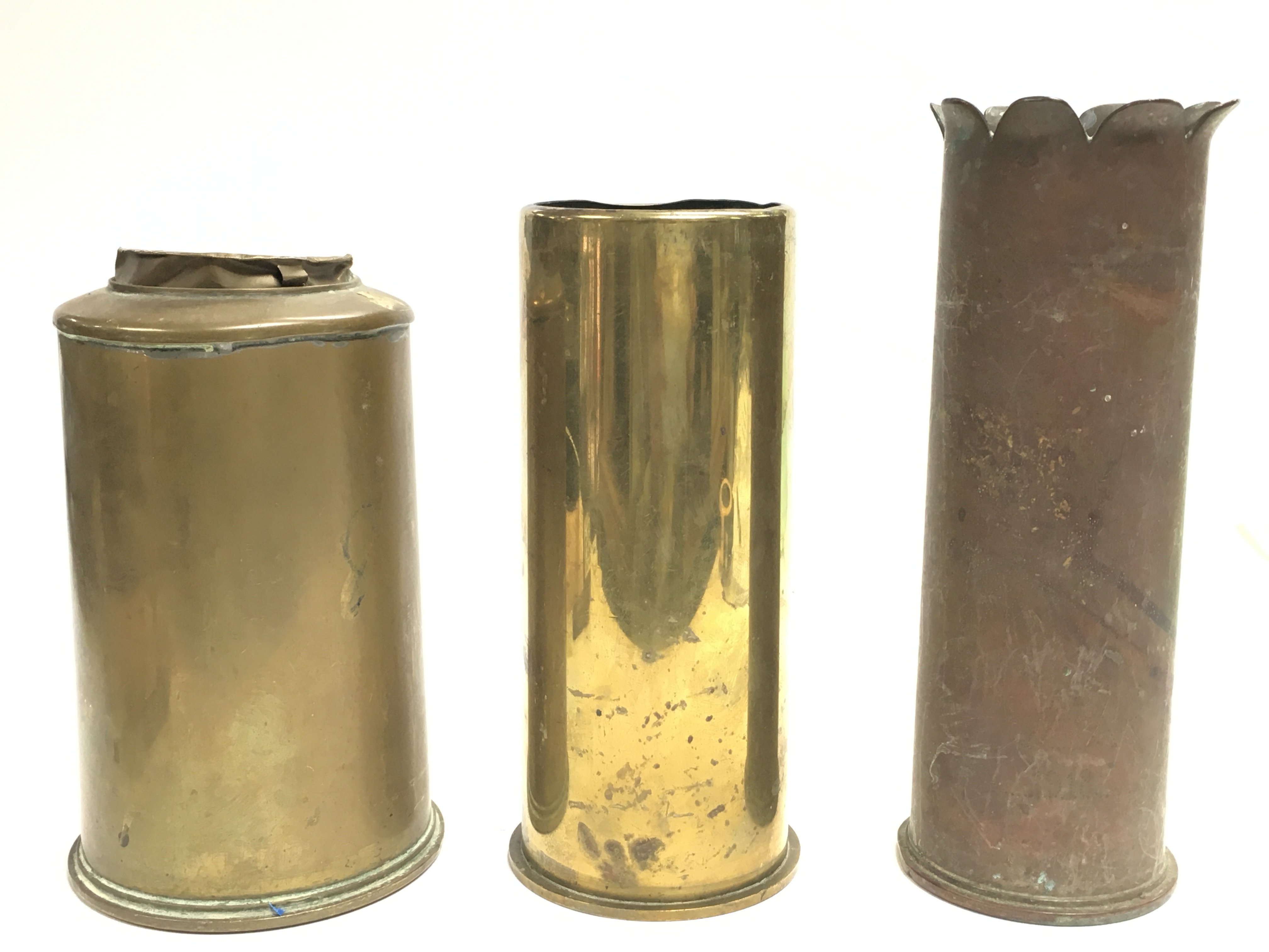 Three Trench Art Crafted Brass Vases. Comprising of A flower shape vase with Lancers Flags 20cm Tall, A 1917 Dated 18 Pounder Shell 17cm Tall and a Broad Arrow Marked 71/3rd Shell, 18cm Tall. All from the estate of a WW1/WW2 Collector. Postage category B