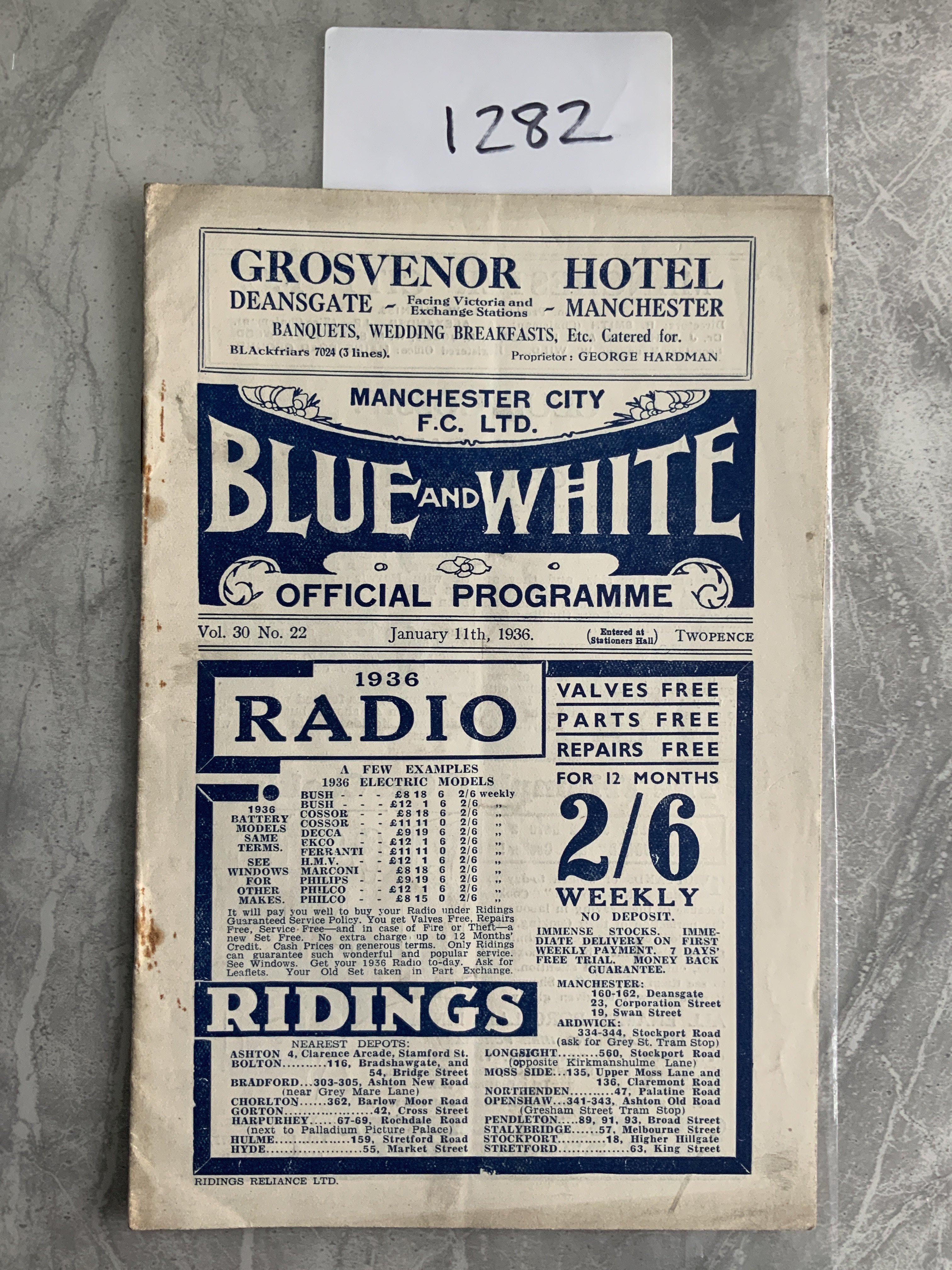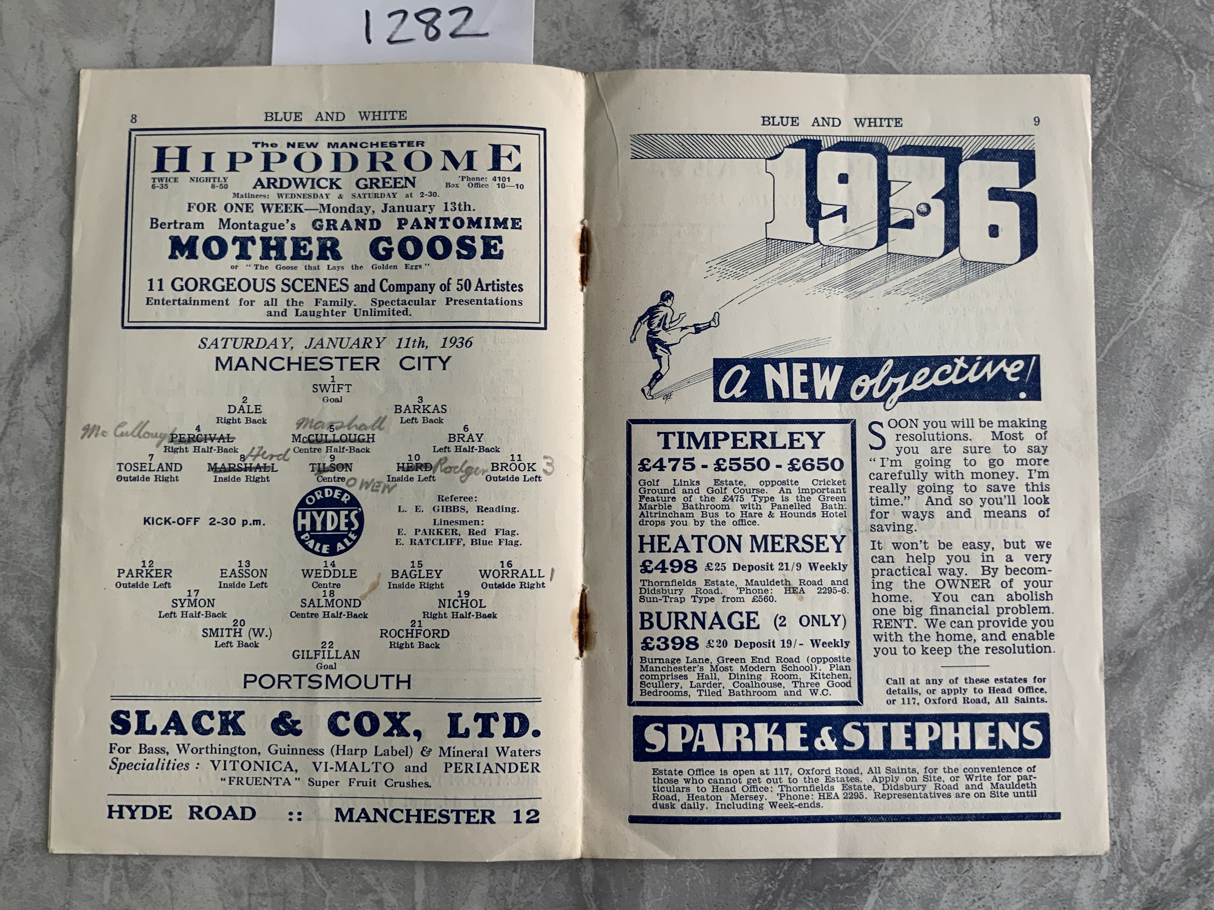 35/36 Manchester City v Portsmouth FA Cup Football Programme: 16 page programme with rusty staples holding firm. Good with pencilled team changes.