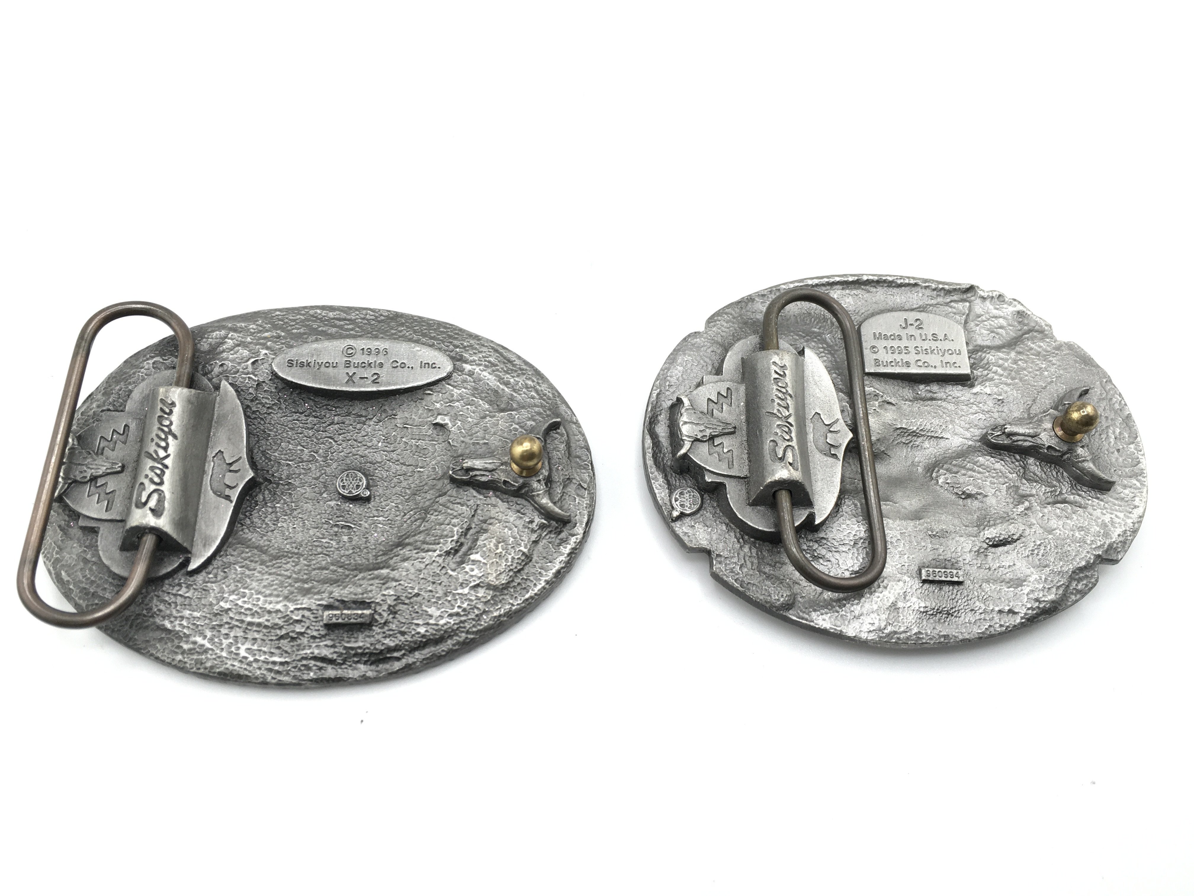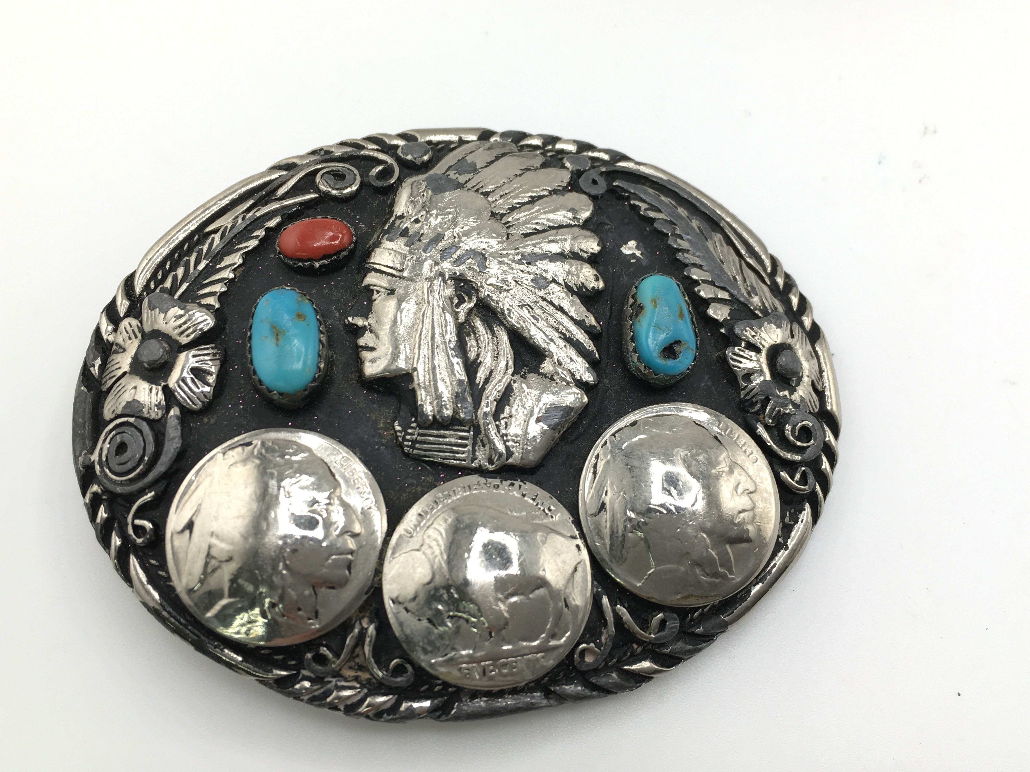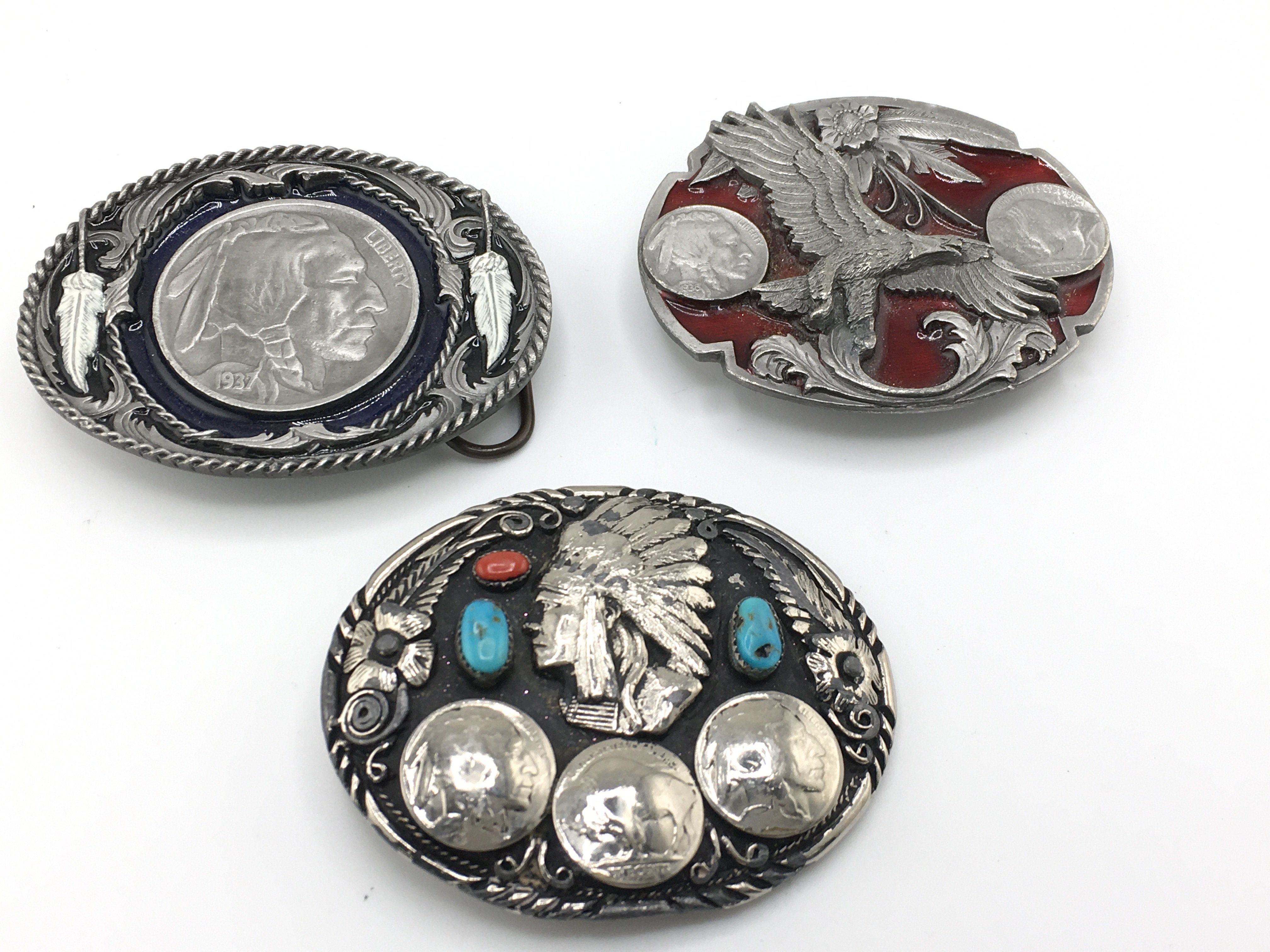 A collection of three belt buckles including two Siskiyou examples set with American coins and another set with turquoise and coral. Postage B
