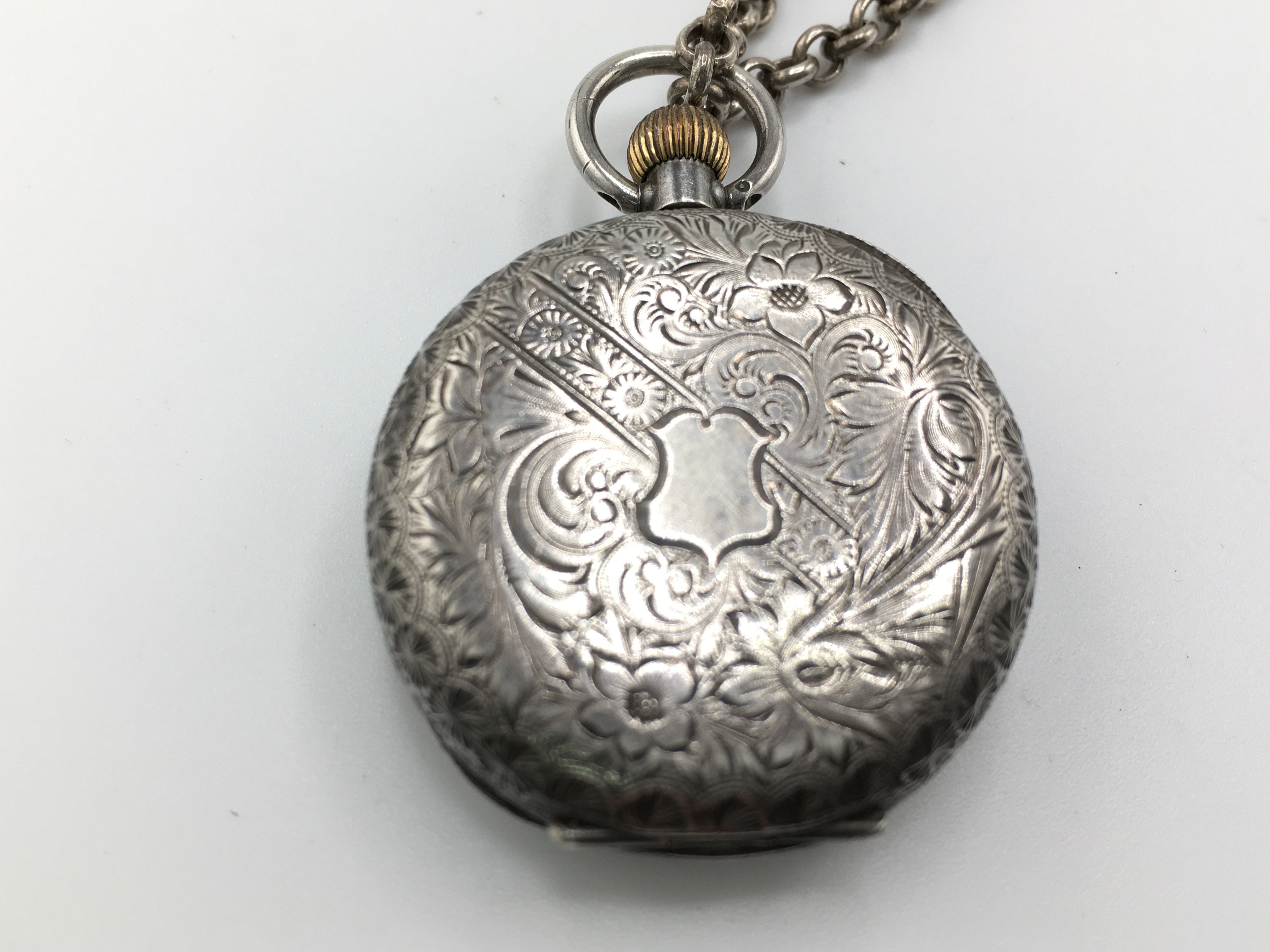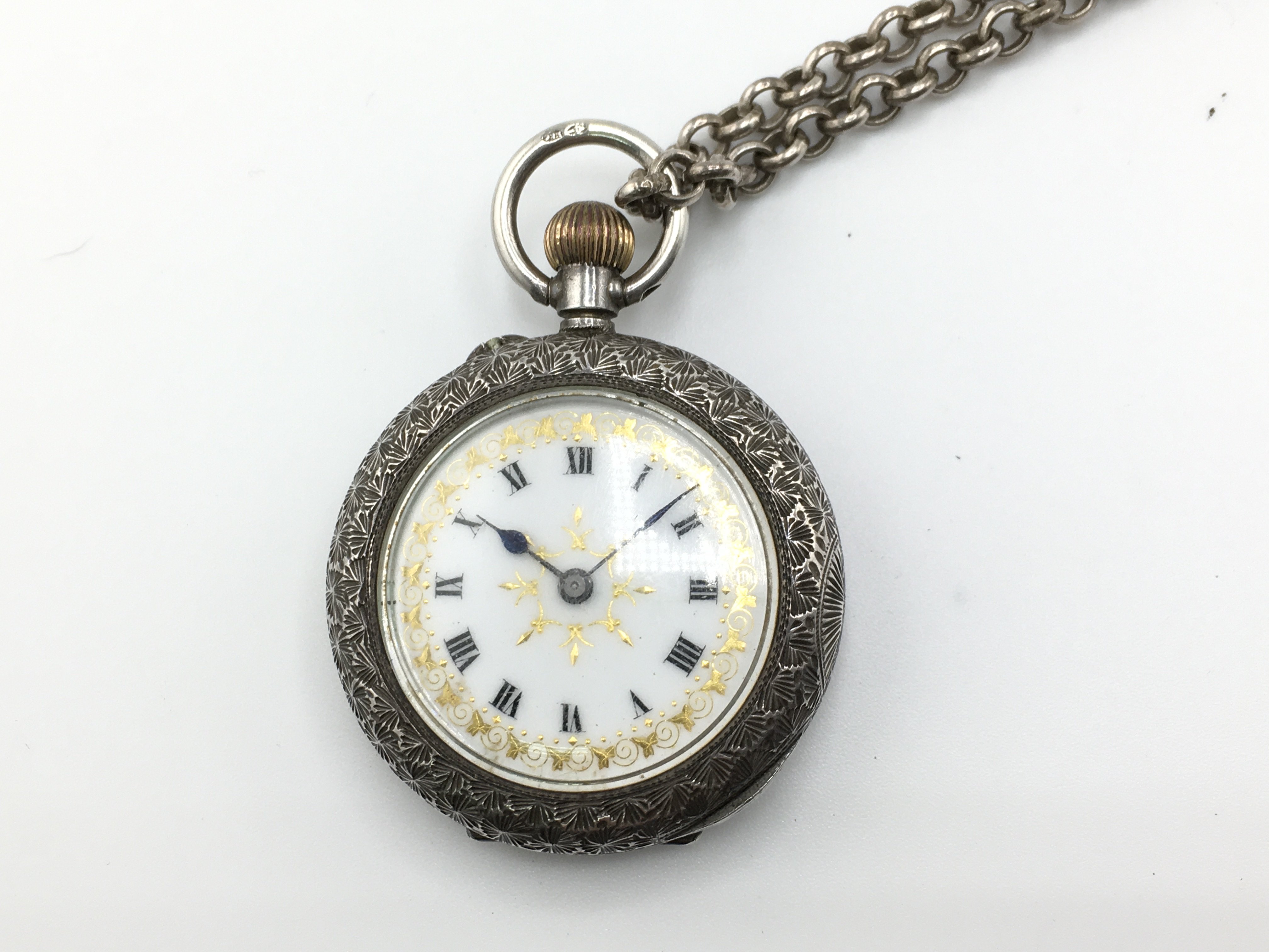 A silver case with enamel face ladies pocket watch with silver belcher style chain. Total weight 53.11g Not seen running. Postage B