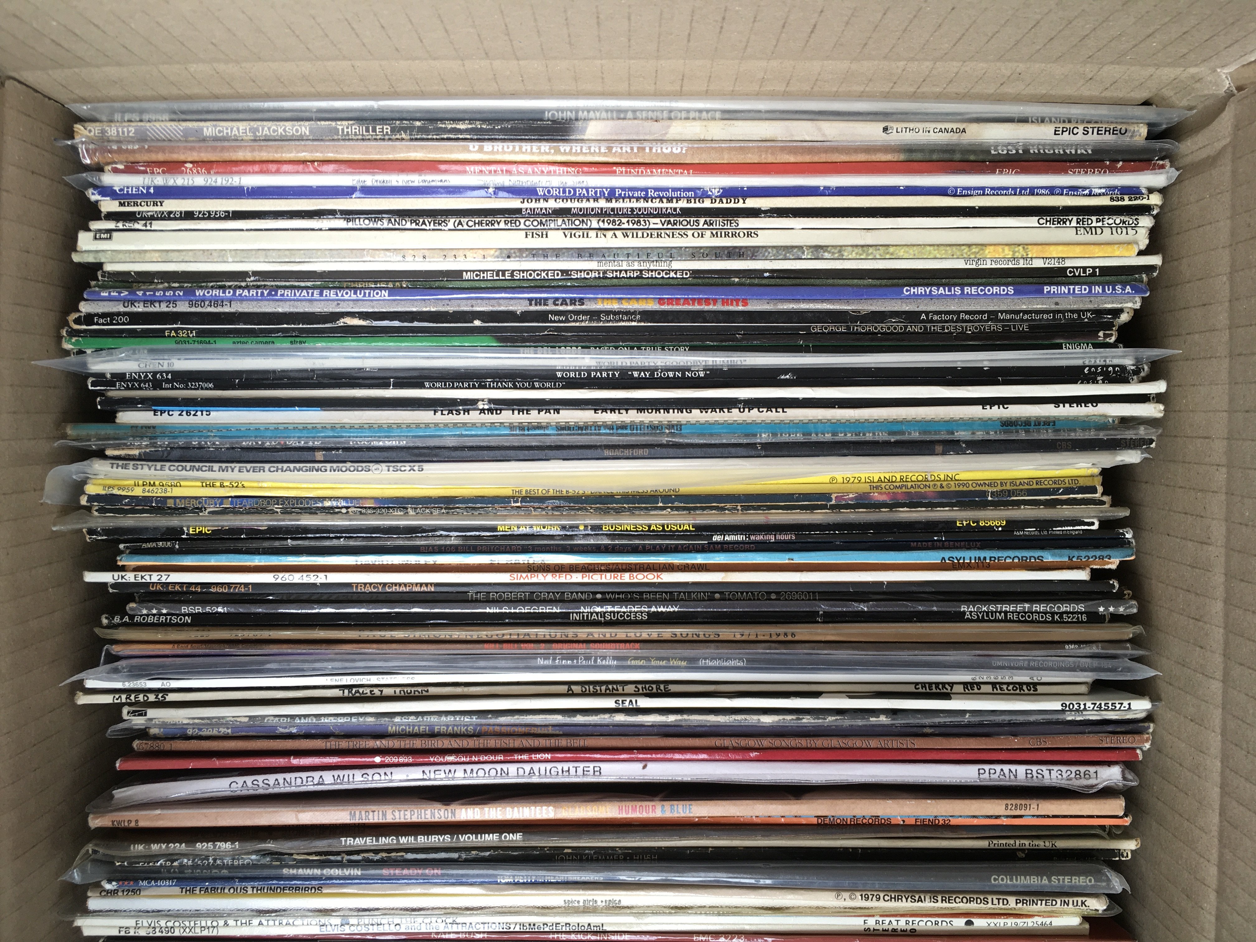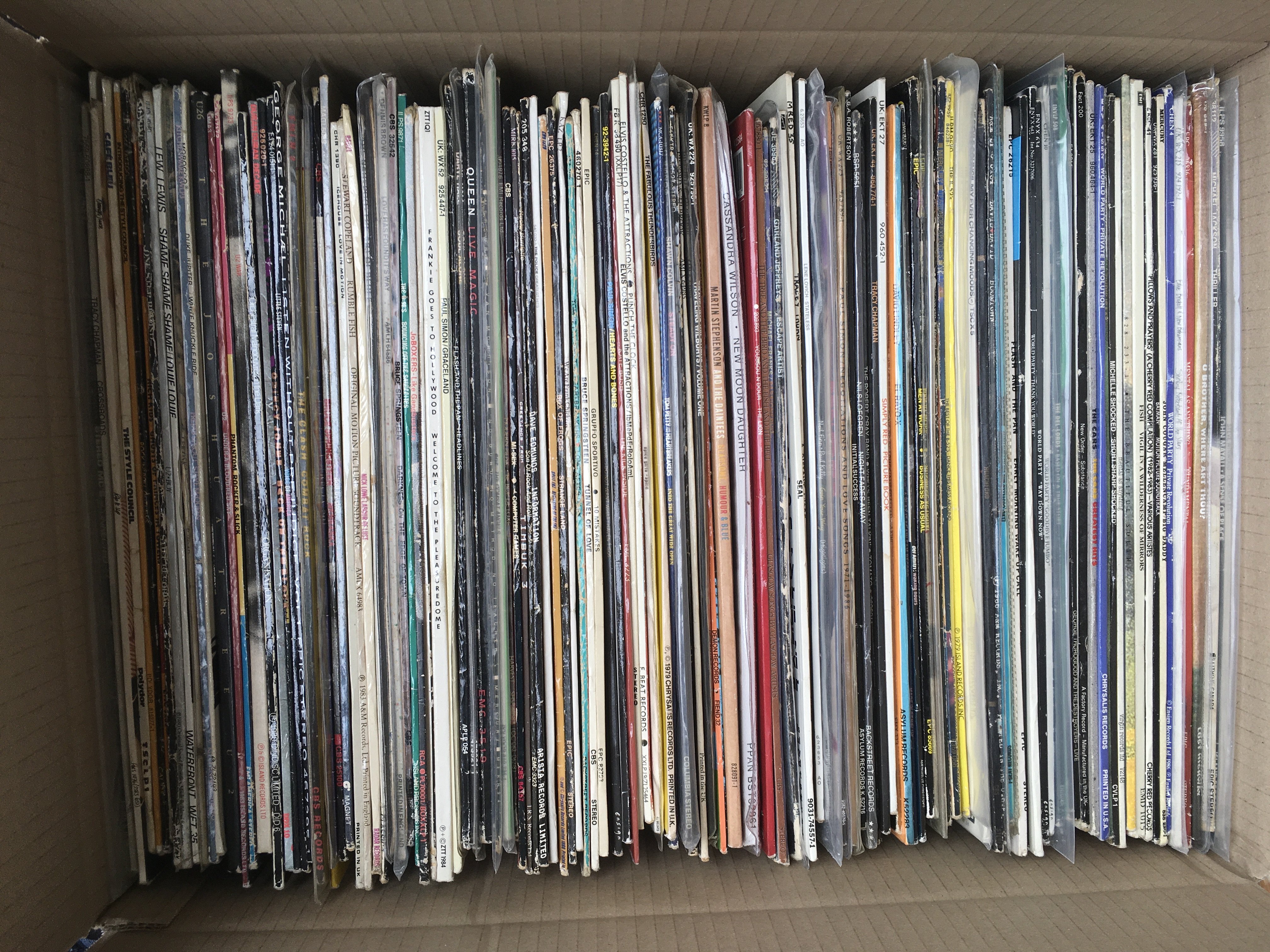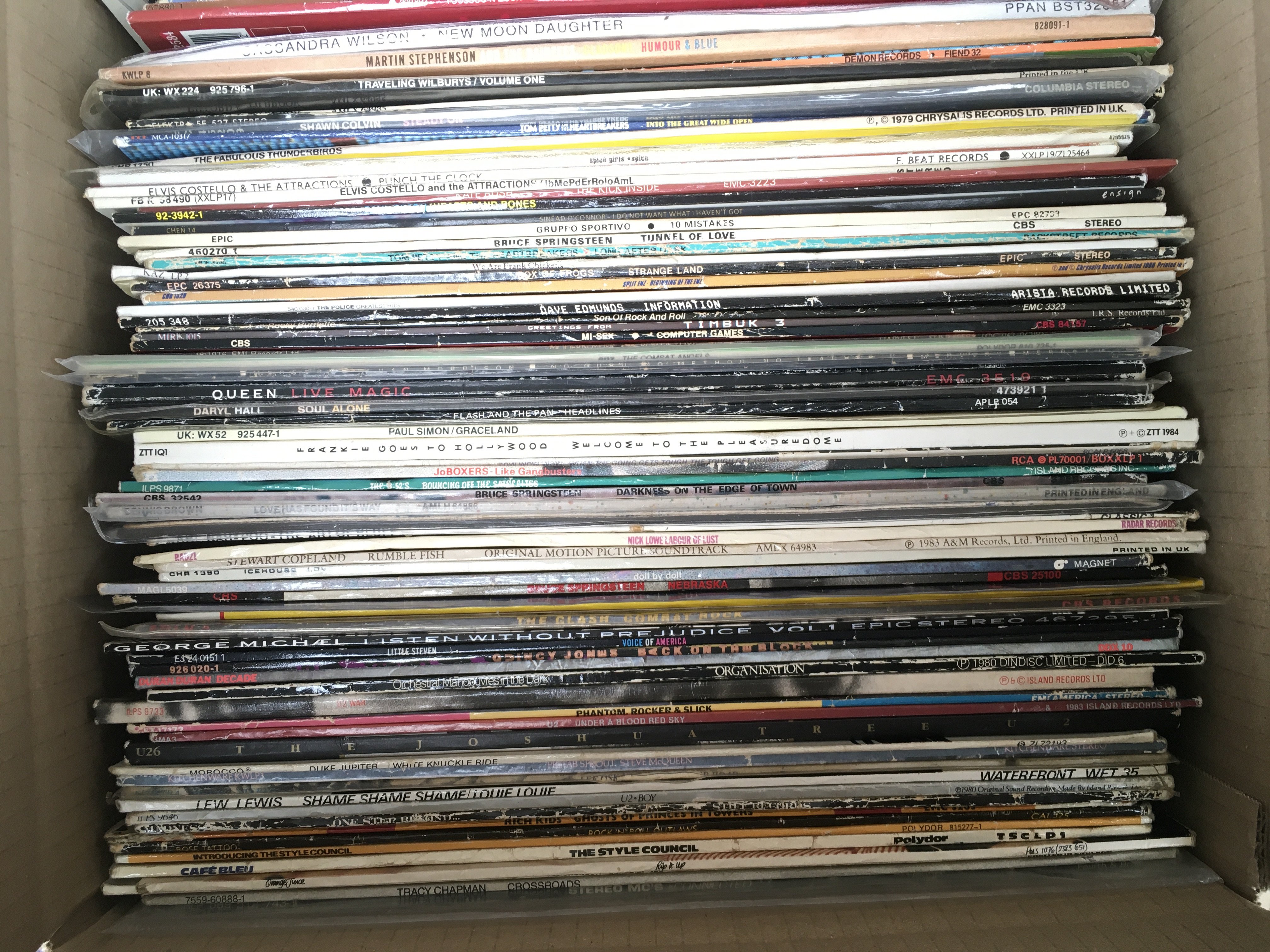 A box of LPs by various artists including OMD, The Style Council, The Clash and many more.