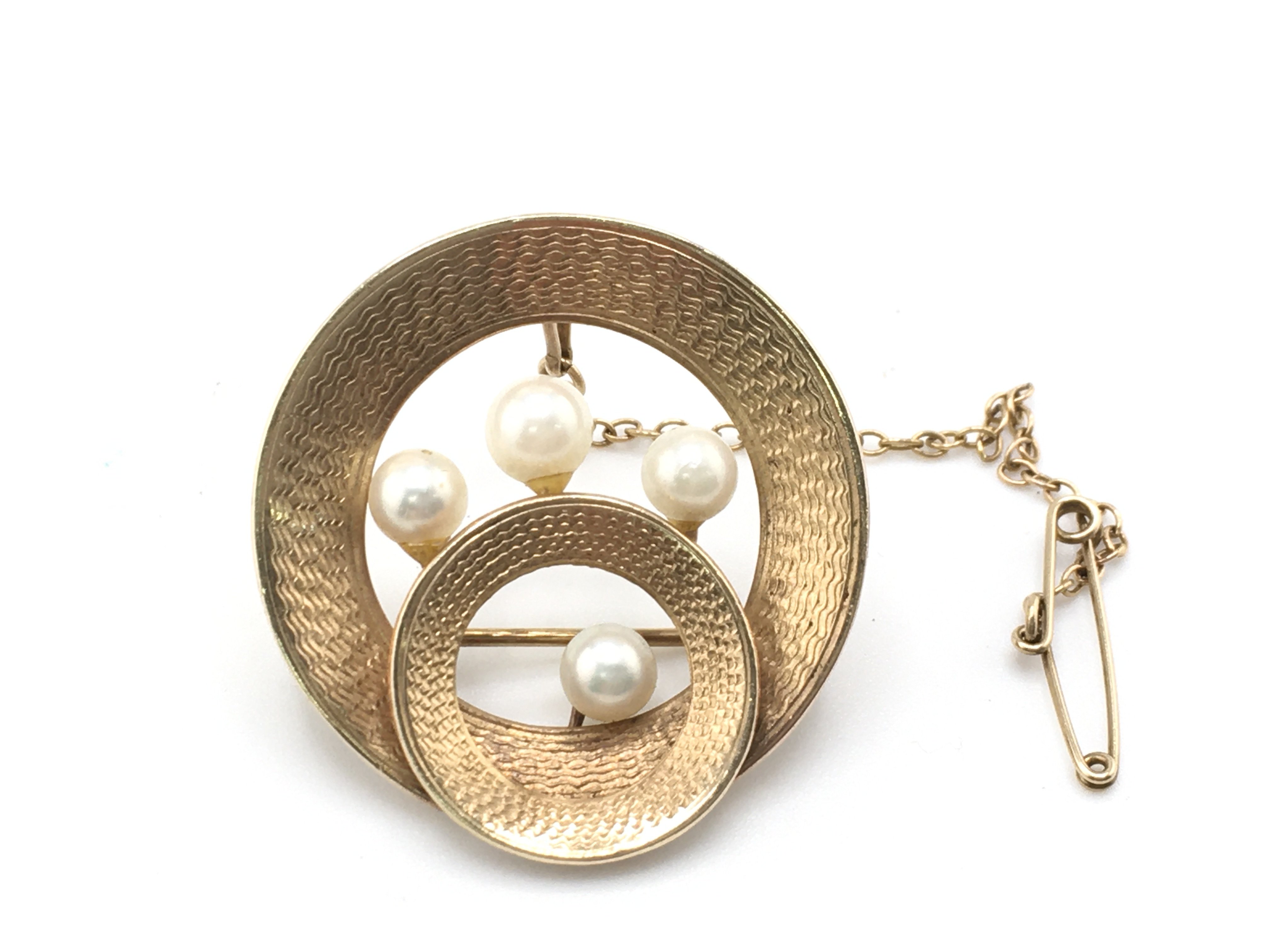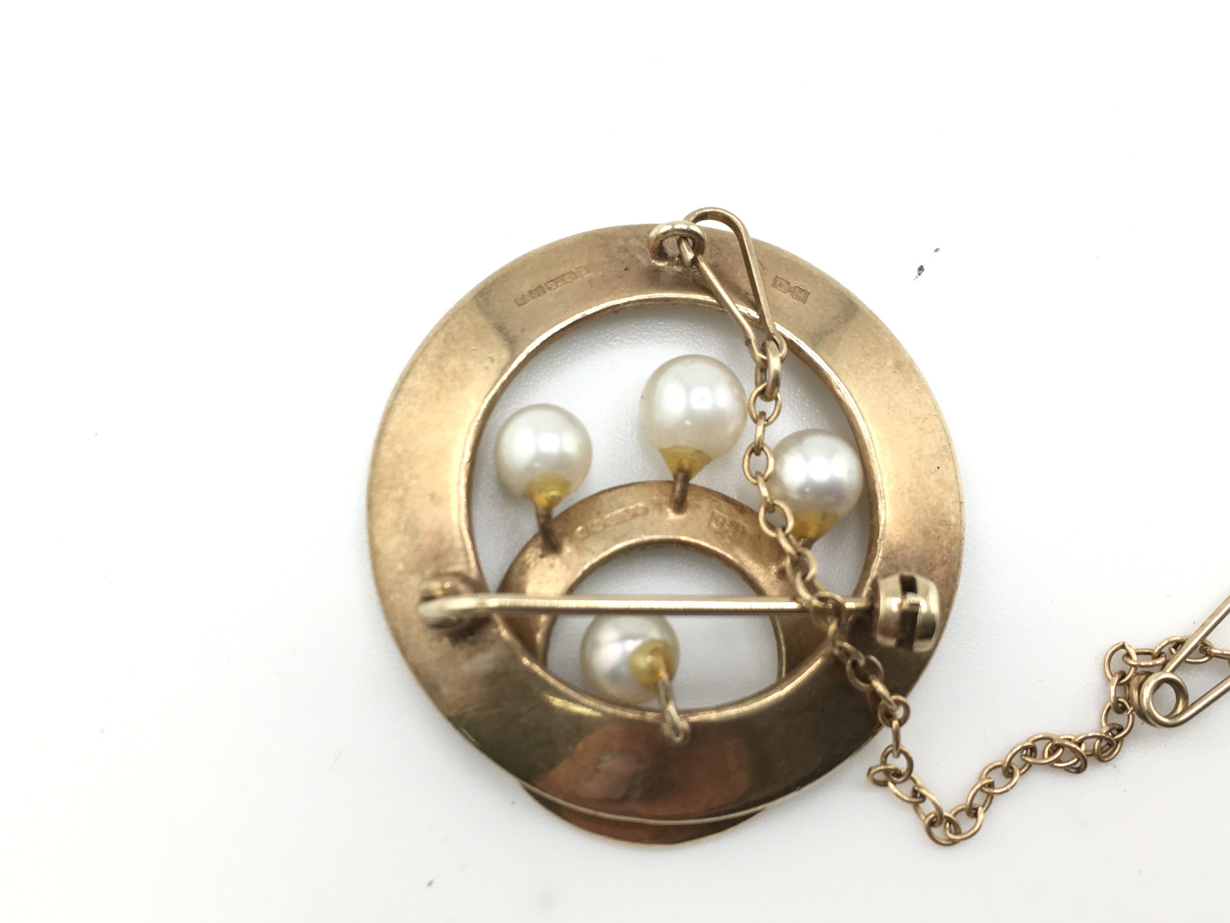 A 9ct gold brooch set with pearls. 8g. Postage B
