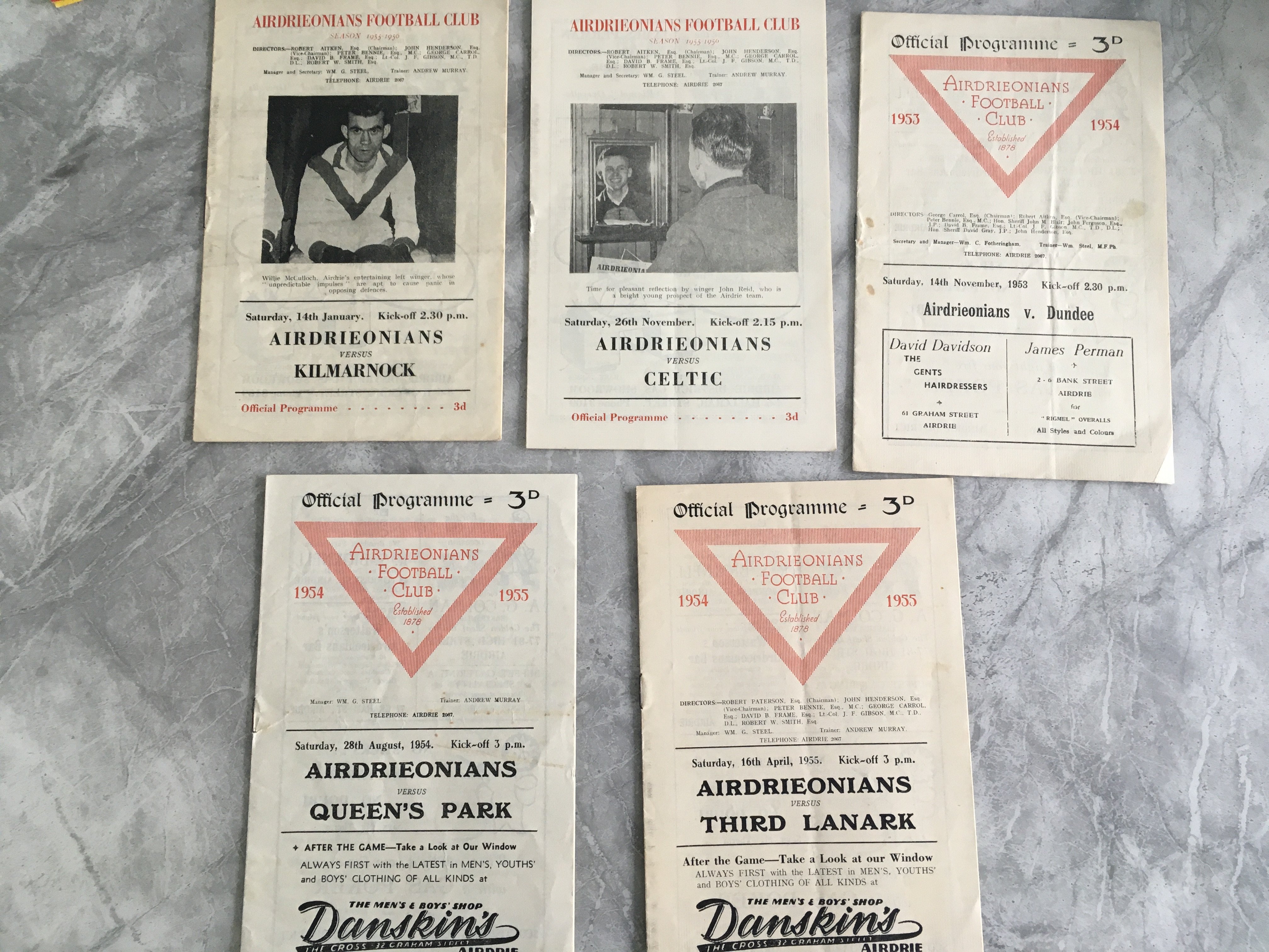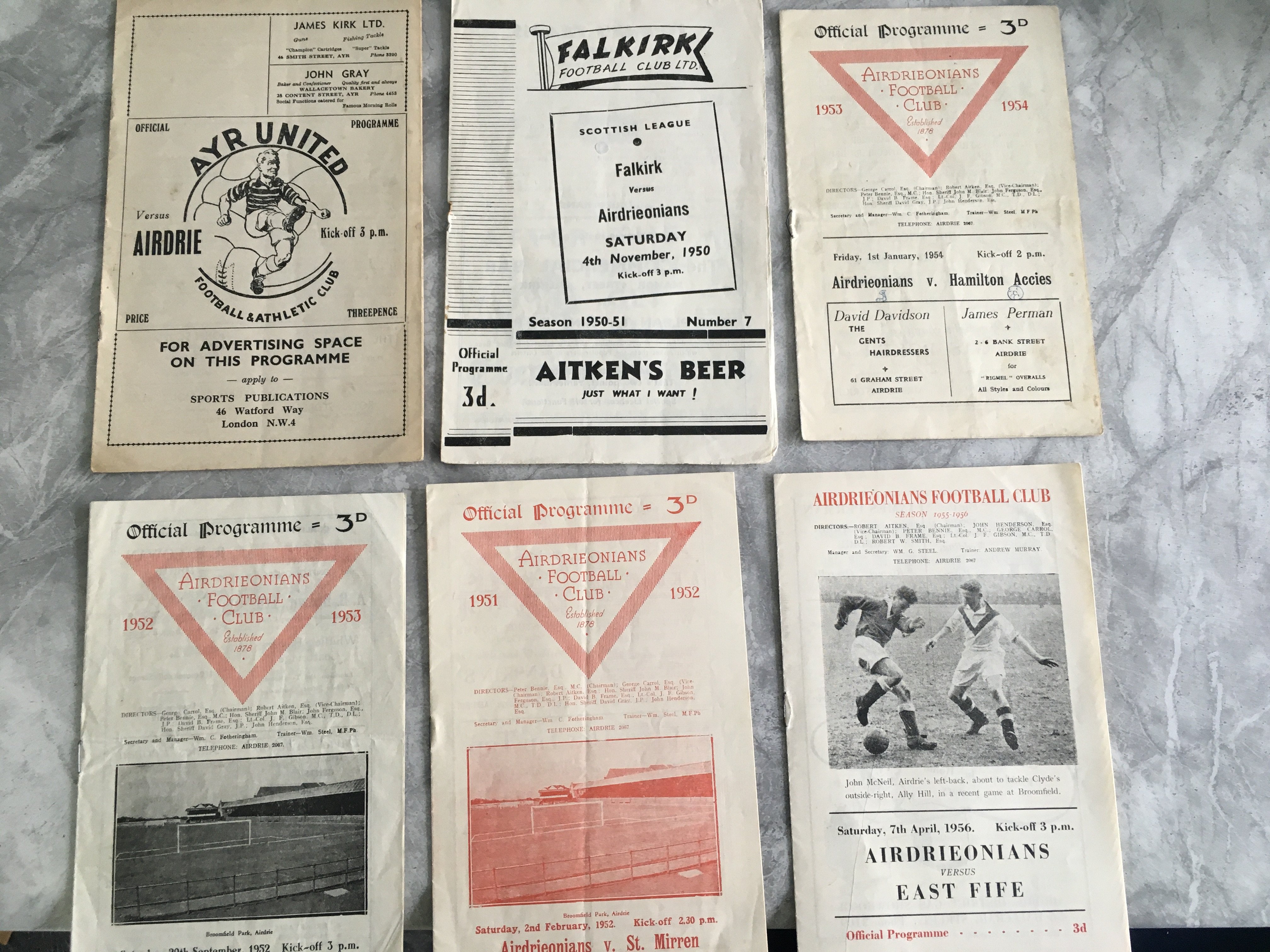 Airdrie Early 1950s Football Programmes: Homes v 51/52 St Mirren, 52/53 Motherwell, 53/54 Hamilton, Dundee, 54/55 Queens Park, Third Lanark, 55/56 Celtic, Kilmarnock, East Fife. Aways at 50/51 Falkirk + 54/55 Ayr Utd. Very good. (11)